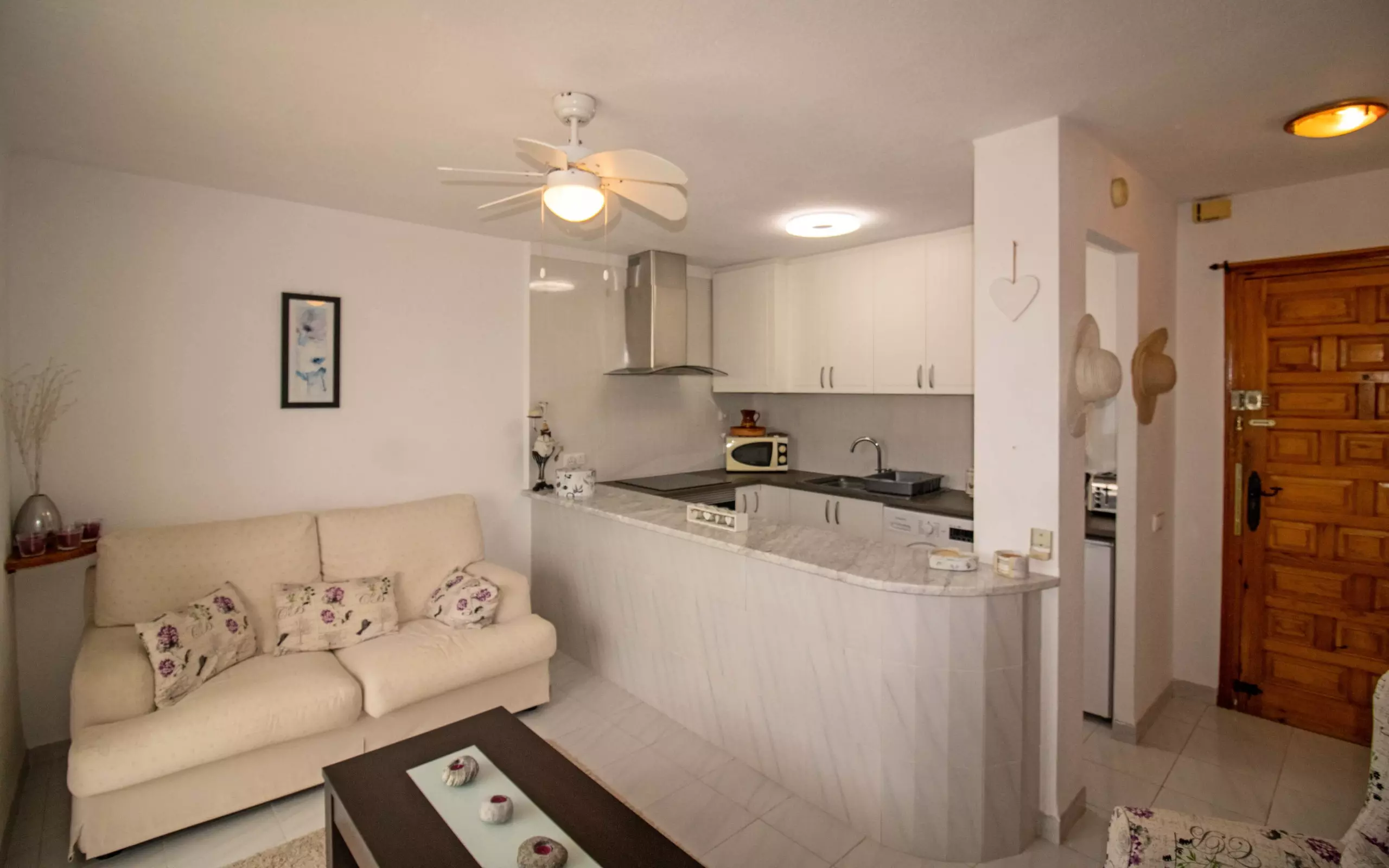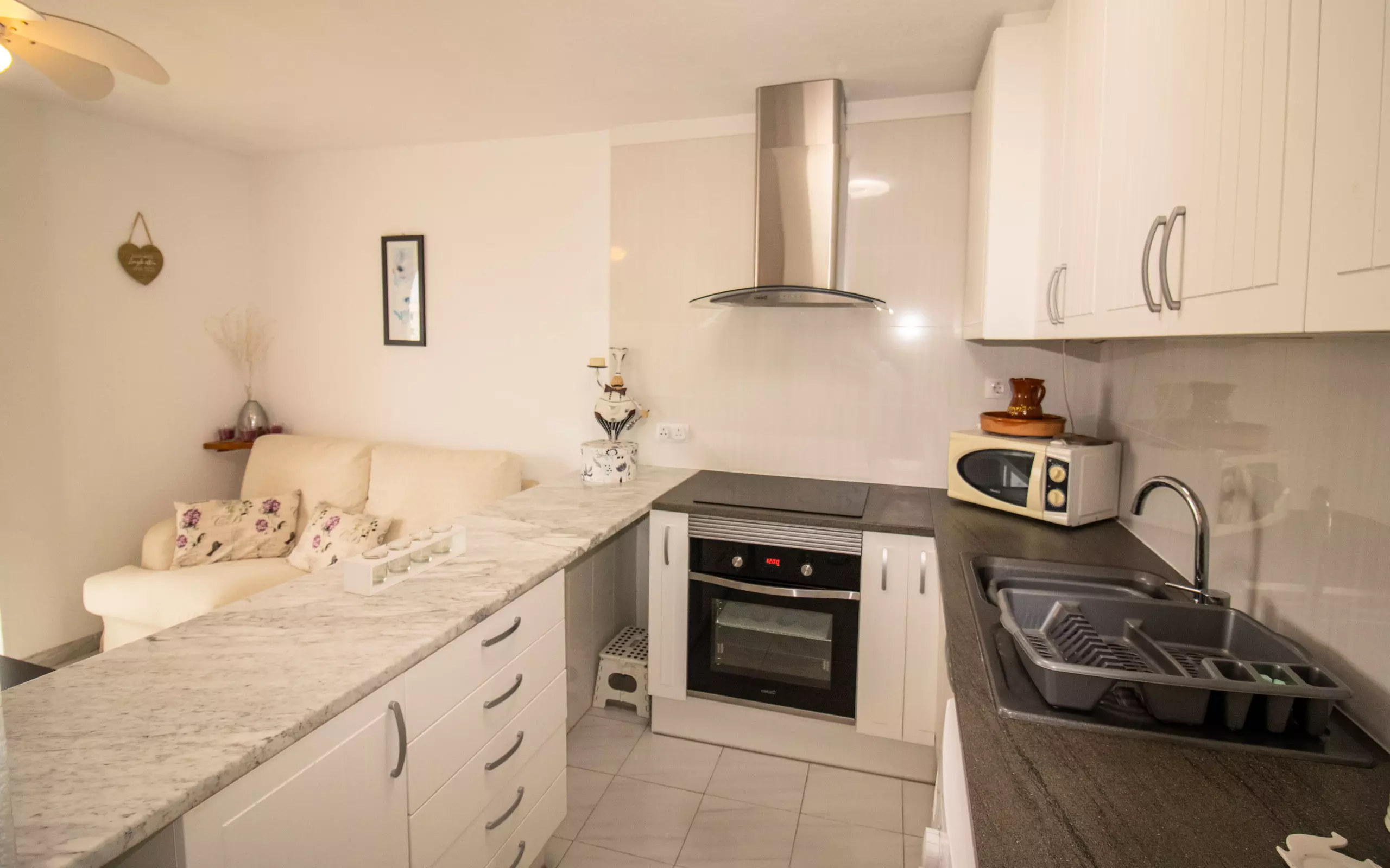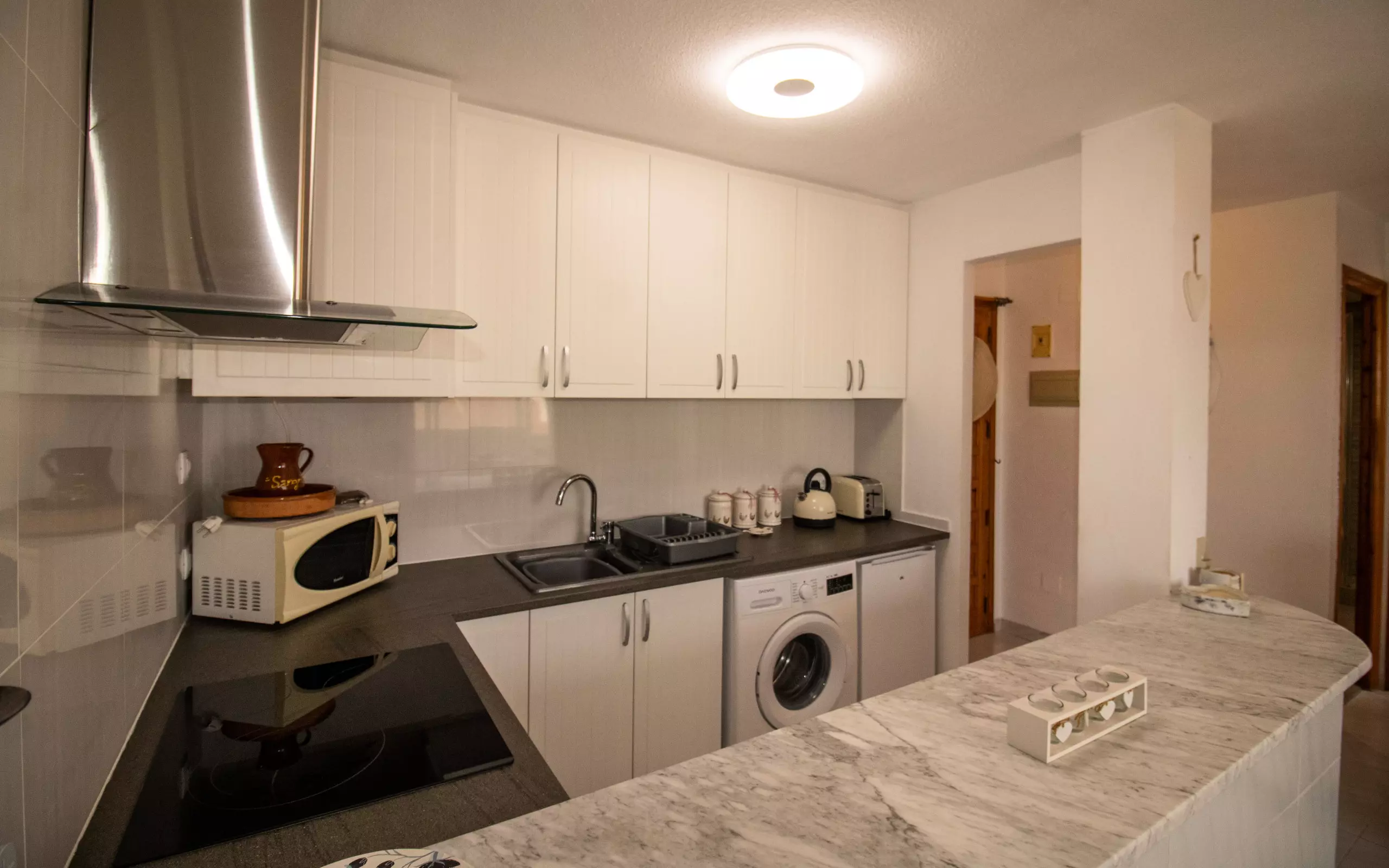 The open-plan kitchen, with ceramic hob, is equipped with a refrigerator, microwave, oven, freezer, dishes/cutlery, kitchen utensils, coffee maker and toaster.
