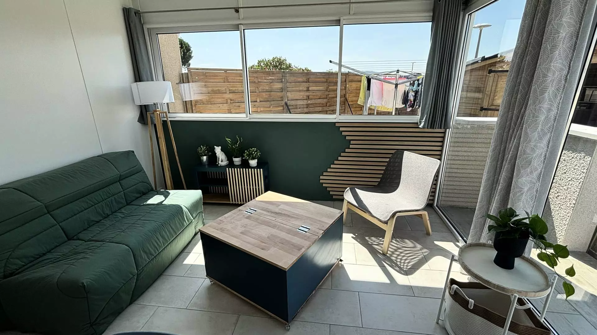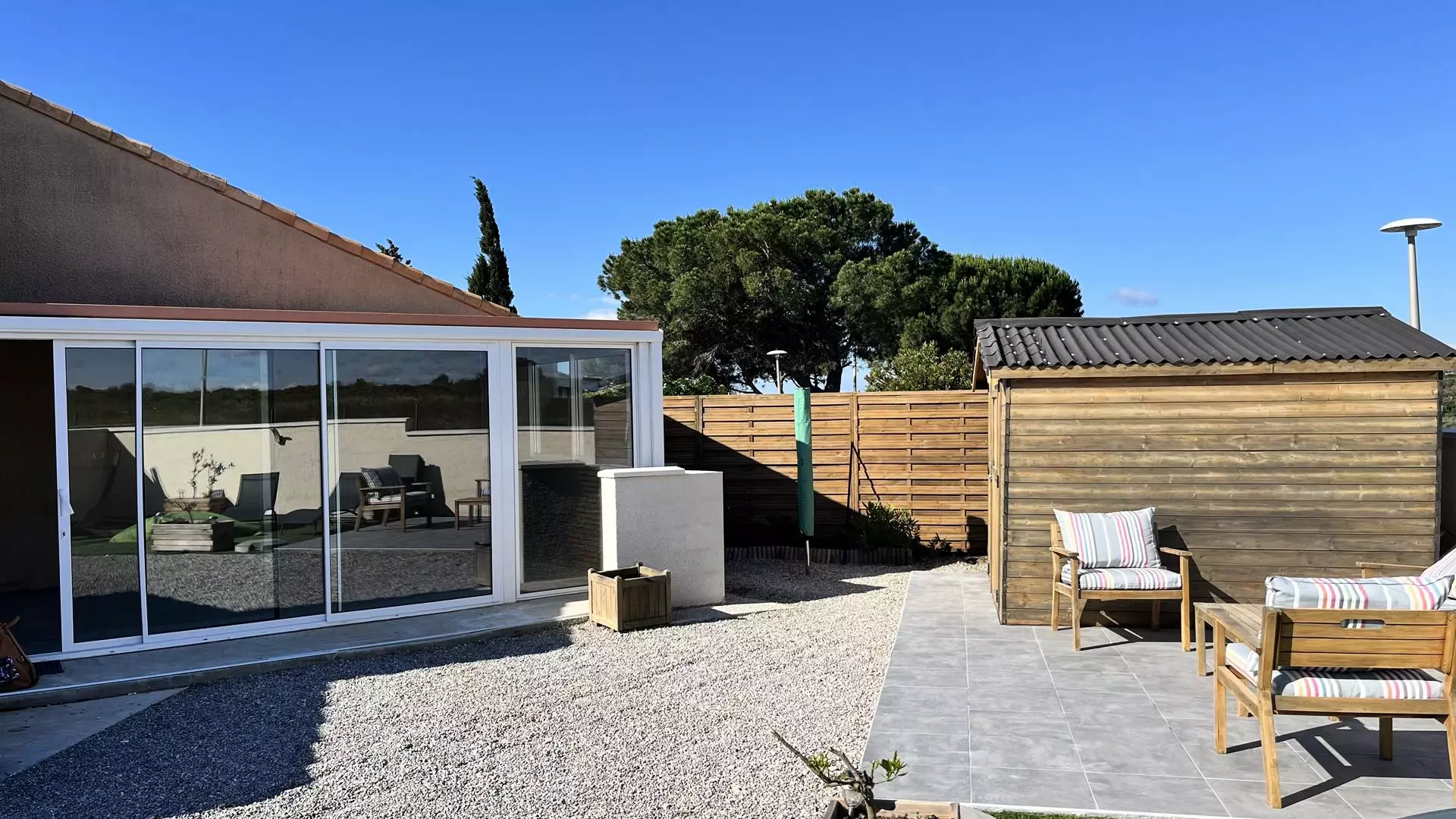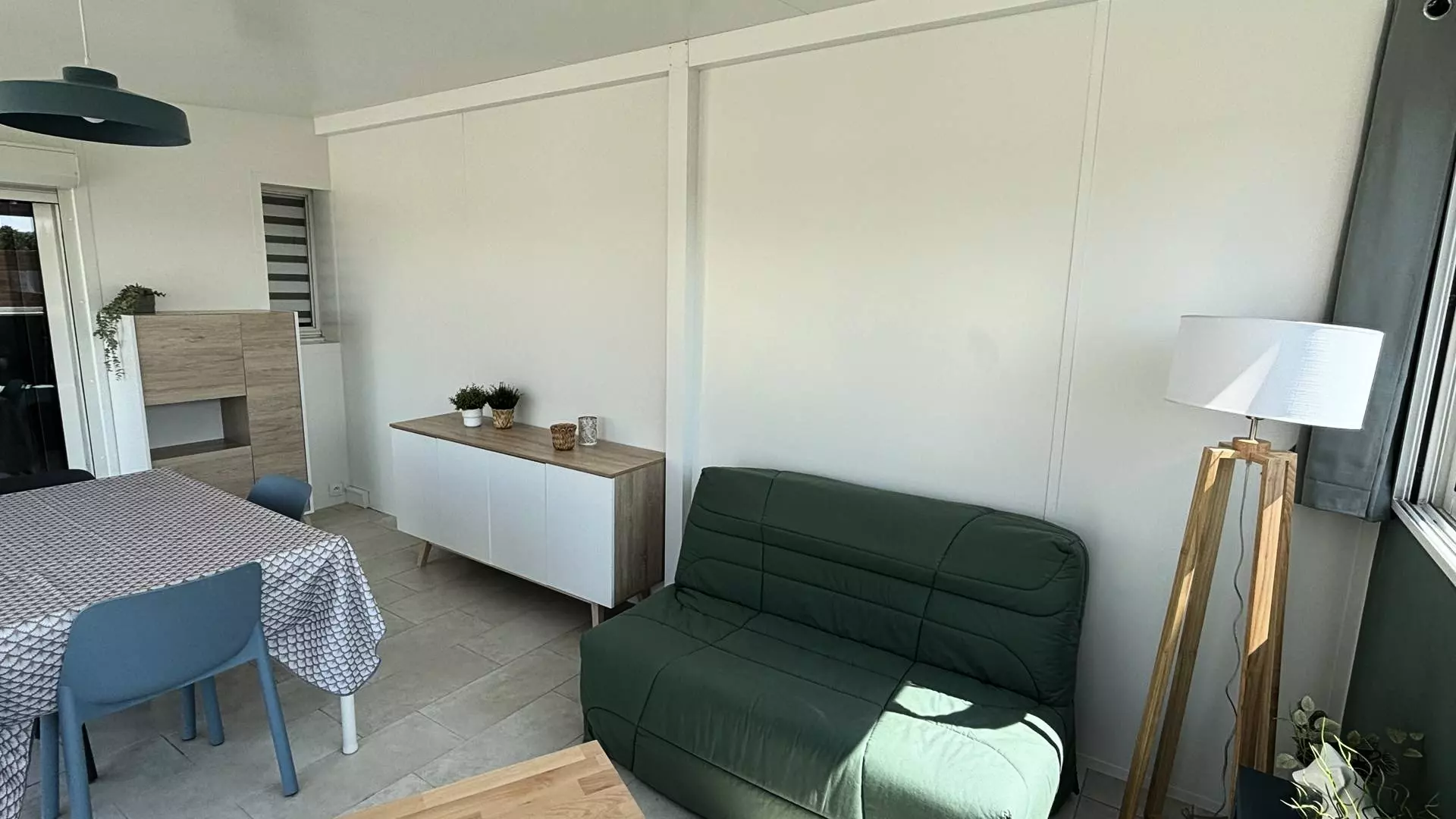 Air-conditioned pavilion composed on the ground floor of a bedroom with a 140cm double bed and independent air conditioning, a fully equipped kitchen living room (Television, Wifi Box, Fridge-freezer, Oven, Microwave, Dishwasher, Dolce Gusto coffee maker + Filter, Kettle, Toaster, Hob, Extractor hood). A bathroom with walk-in shower, toilet and washing machine. A mezzanine with a 140cm double bed and an office area, air conditioning. A large veranda with dining area and lounge area which opens onto a garden. 2 parking spaces.