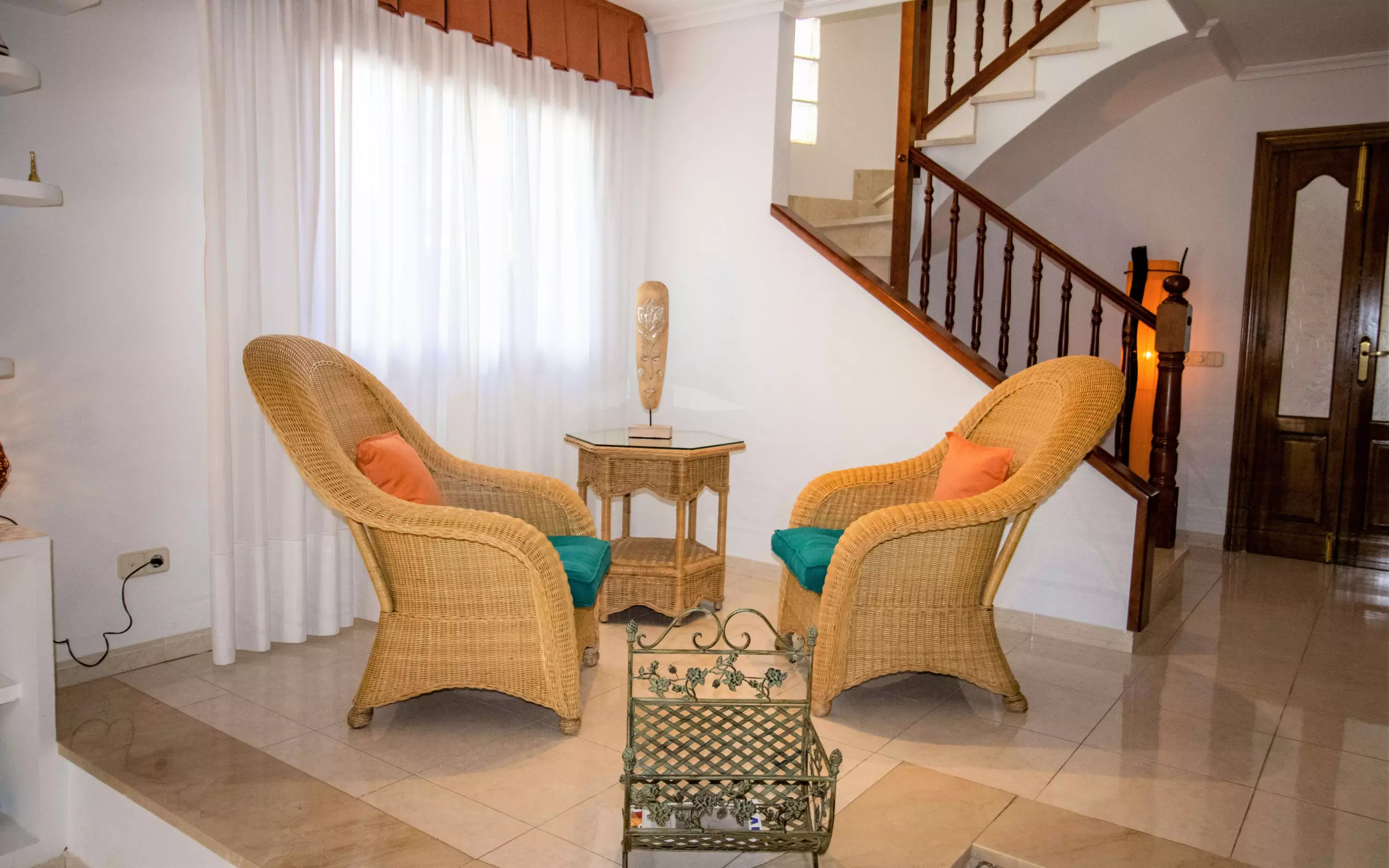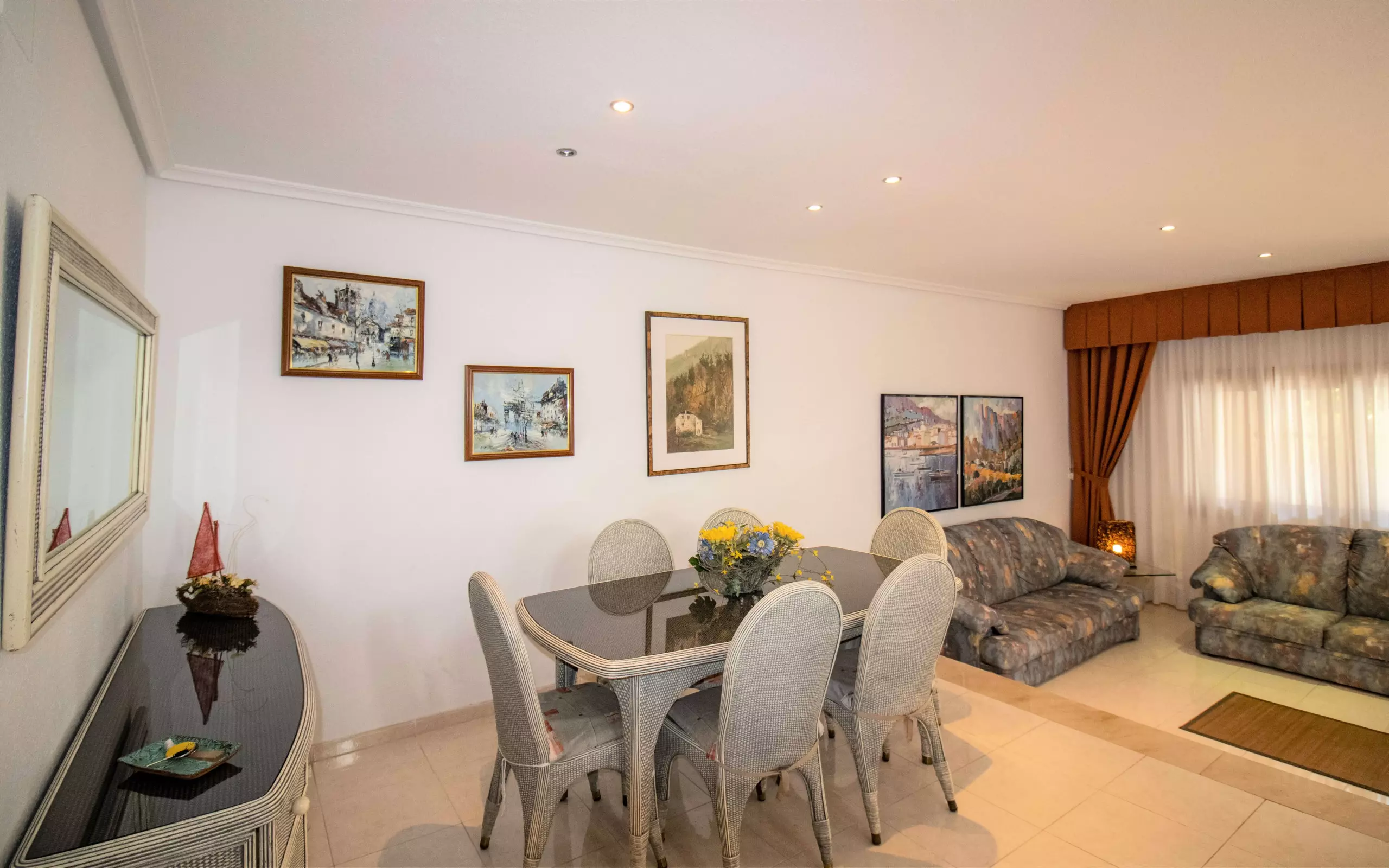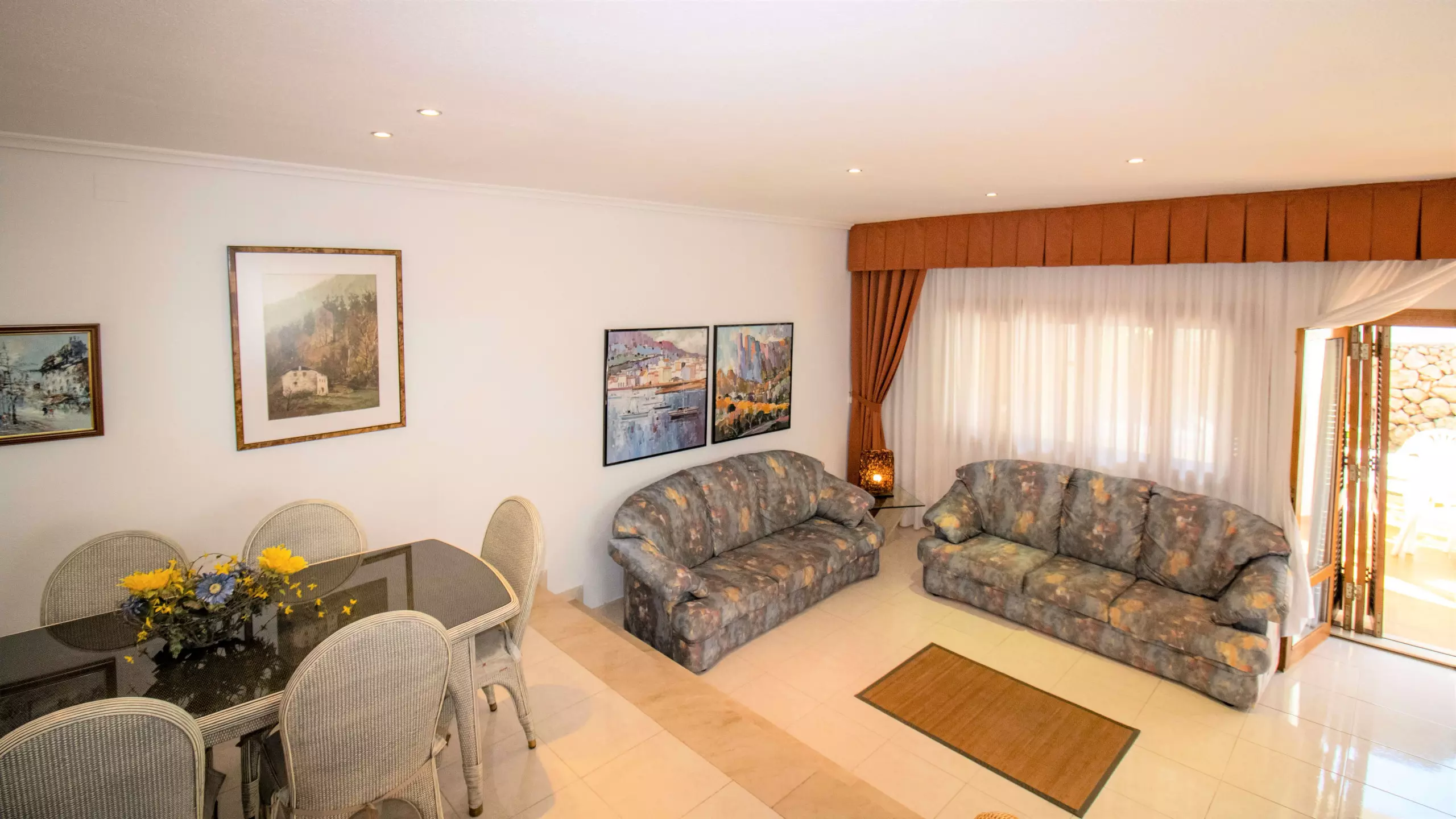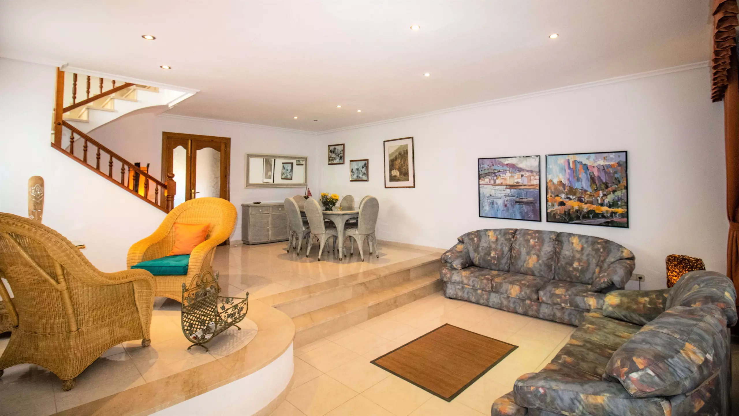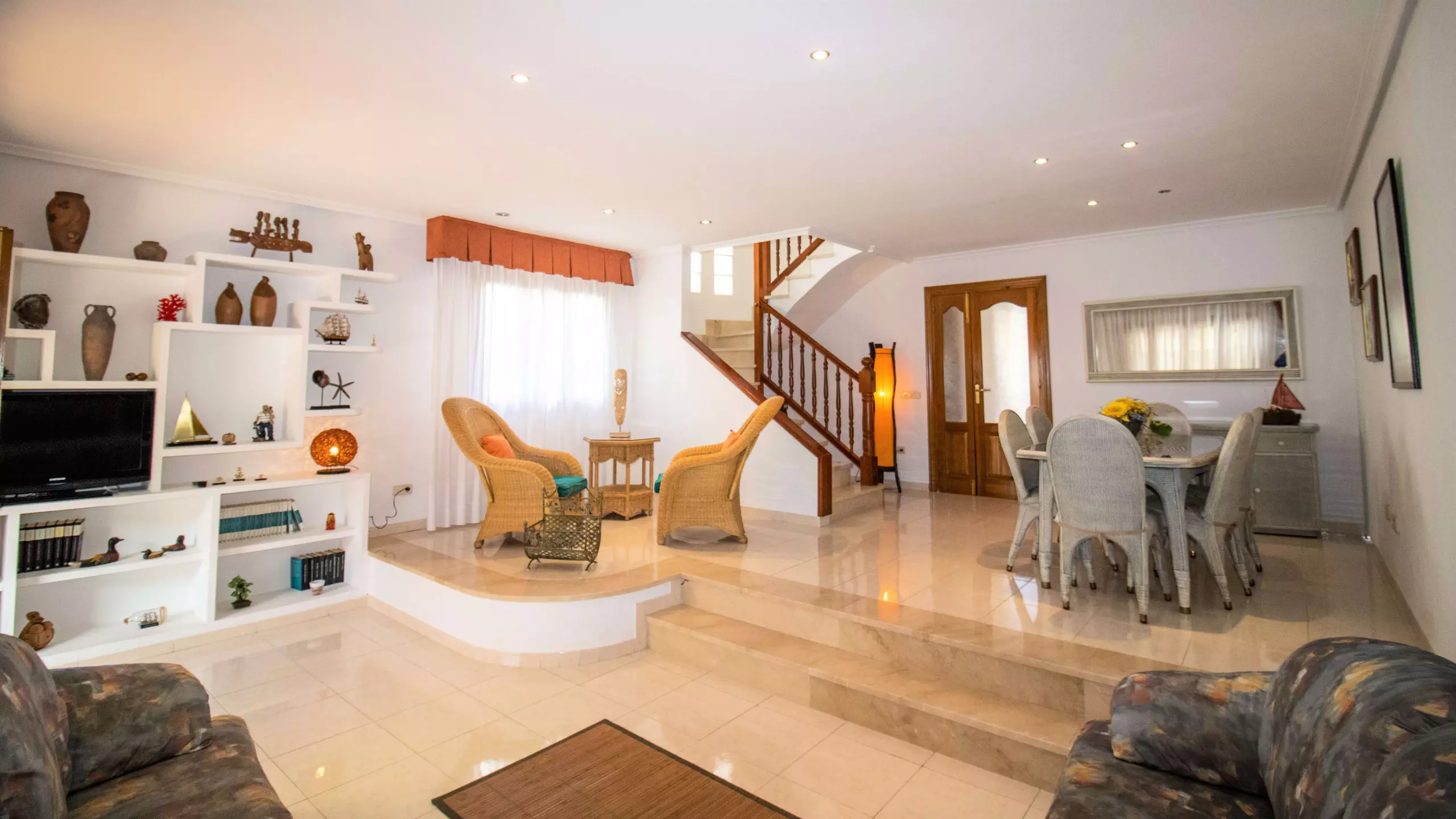 We continue with the living-dining room, very spacious and bright, double height. It has two sofas, a dining area, a small space with two armchairs where you can read or have a drink, and a television.