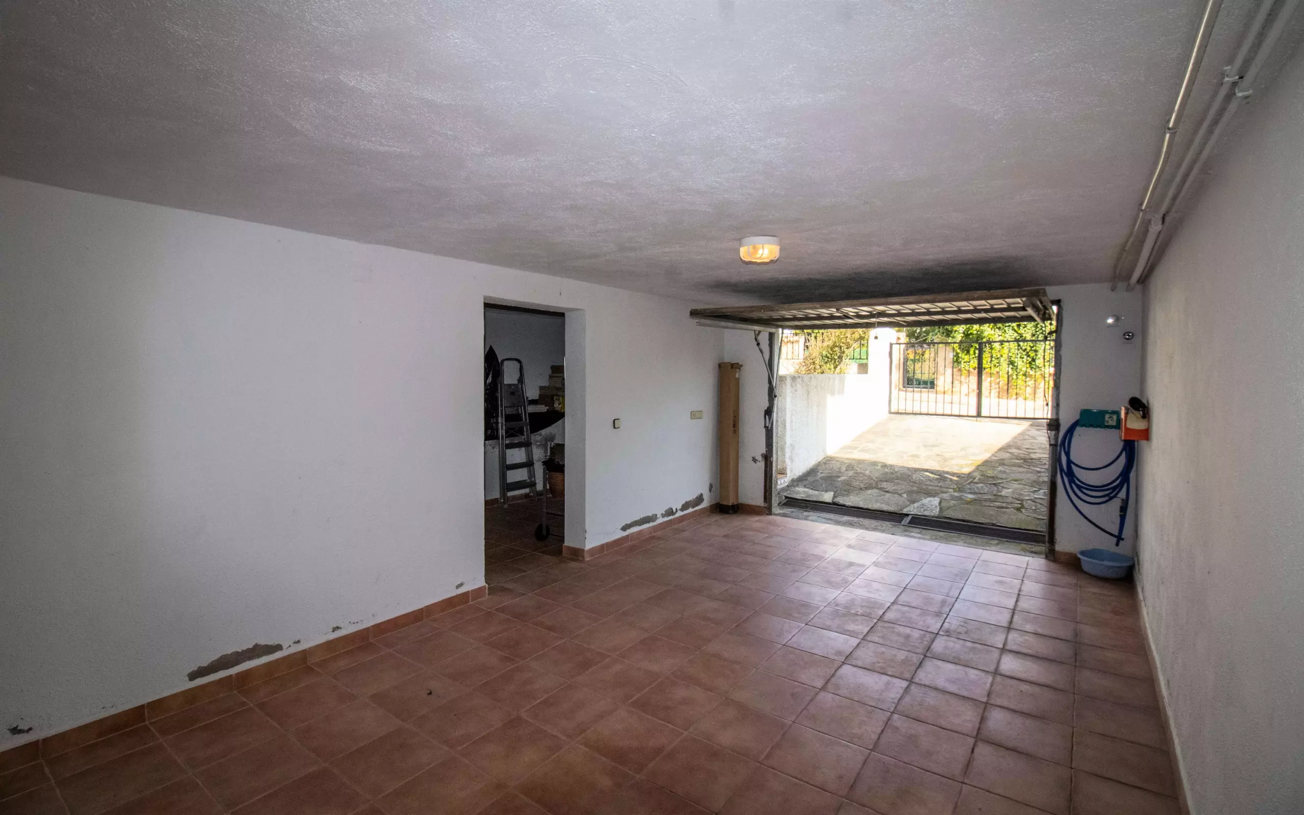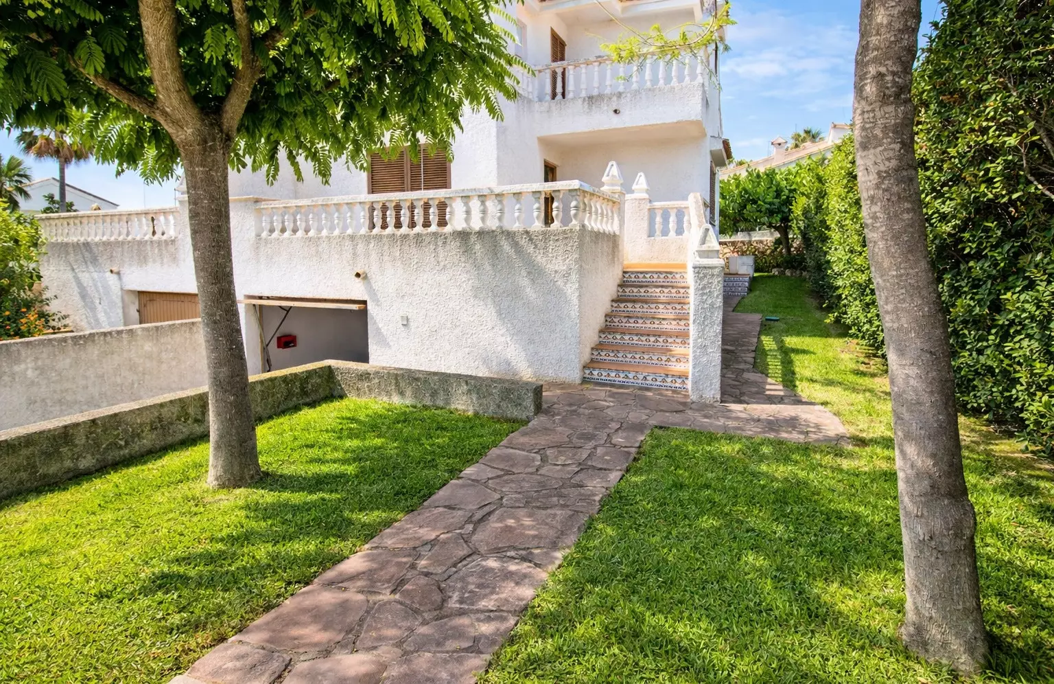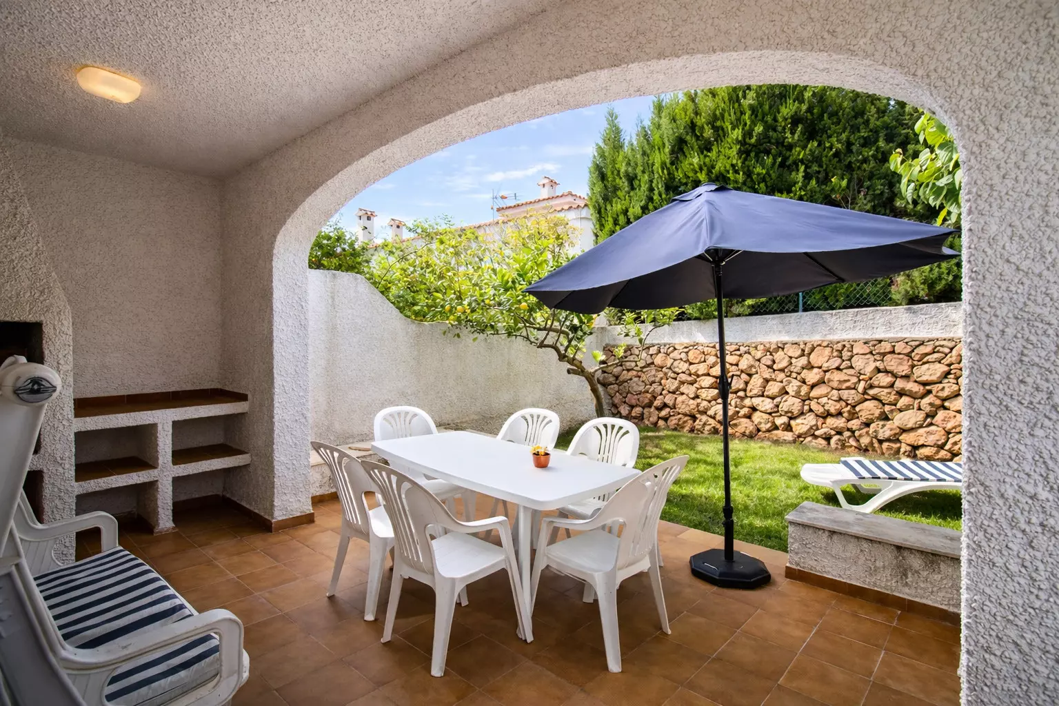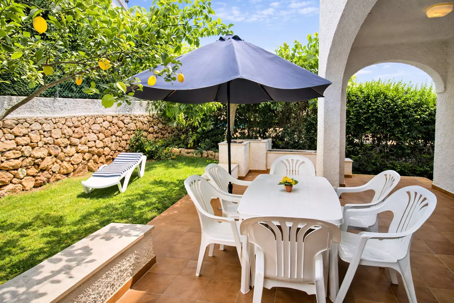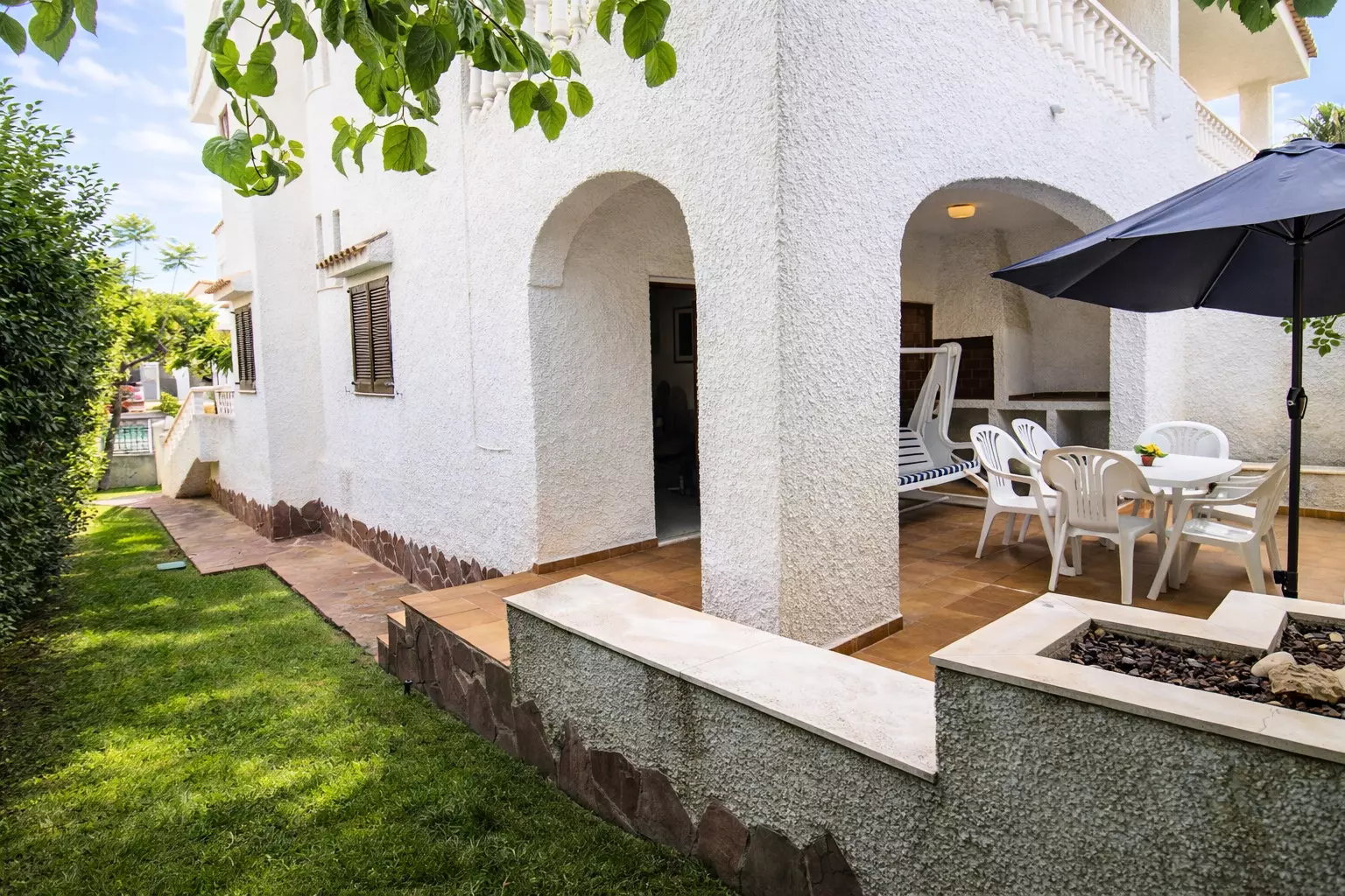 On the lower level, at the back of the house, we have a pleasant and cool outdoor space with a garden, a terrace with a dining table, and a parasol for the hottest hours. An ideal space to relax and enjoy total privacy.