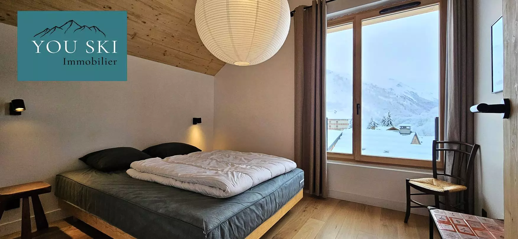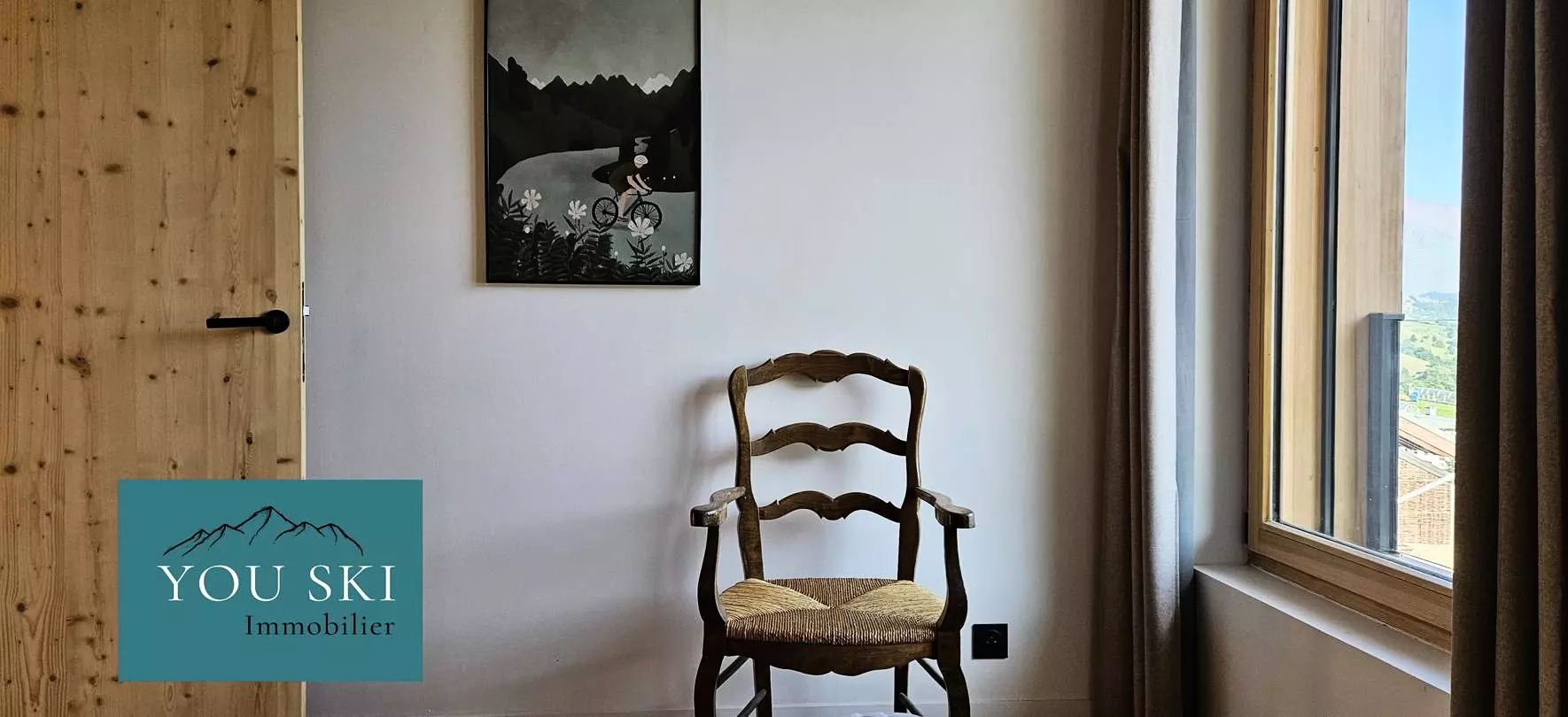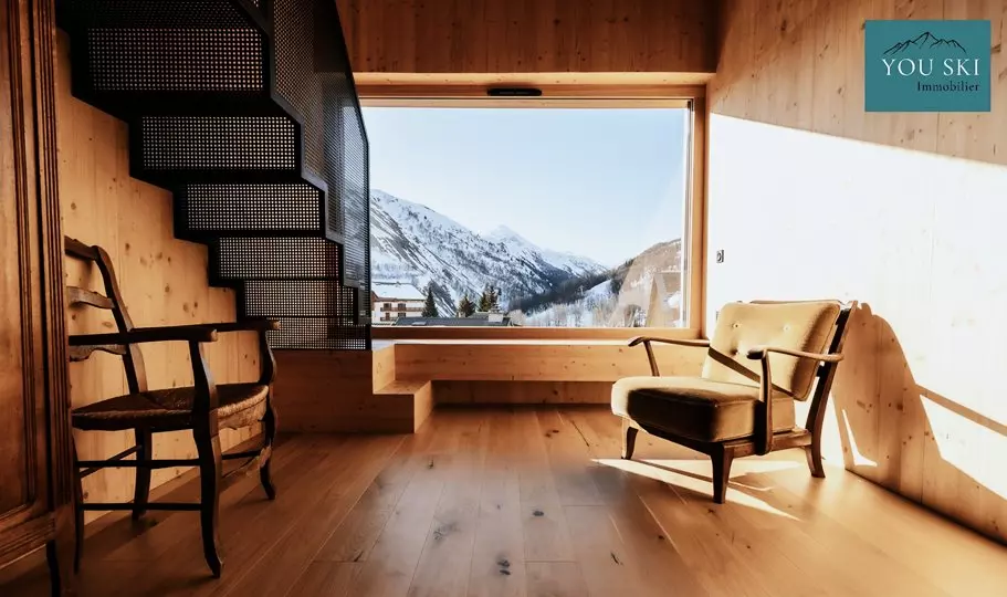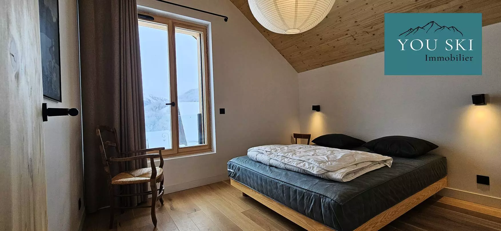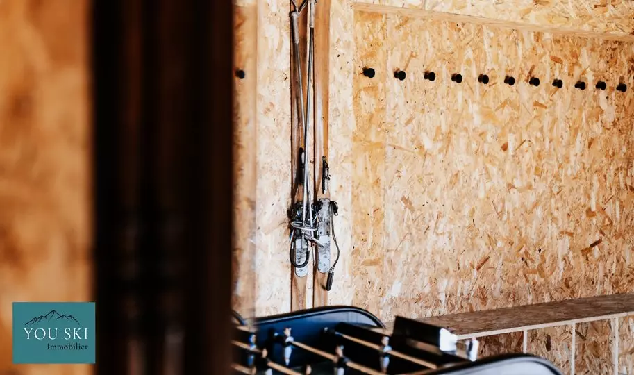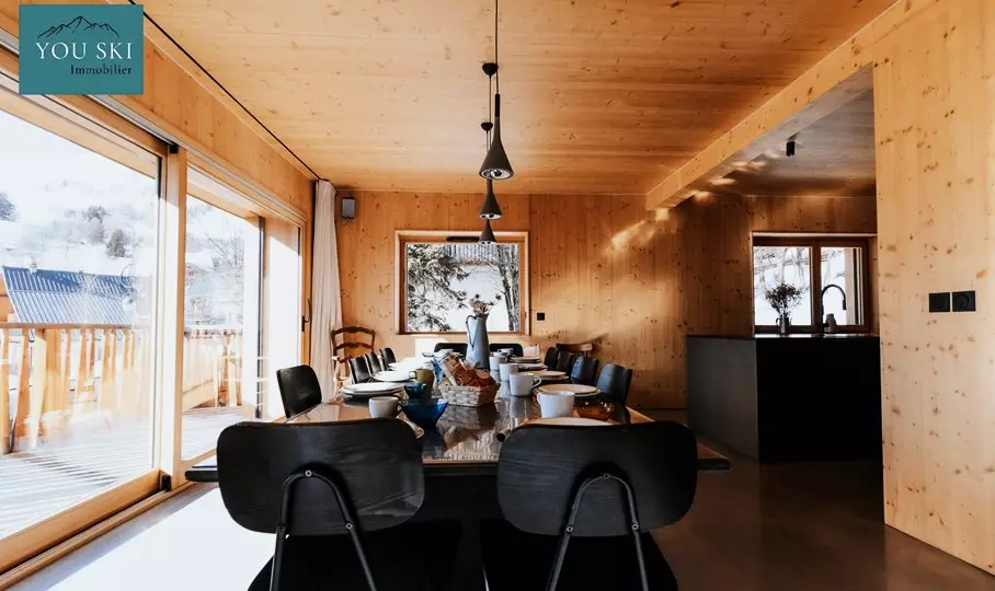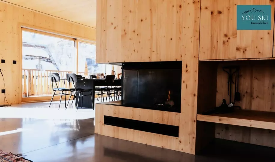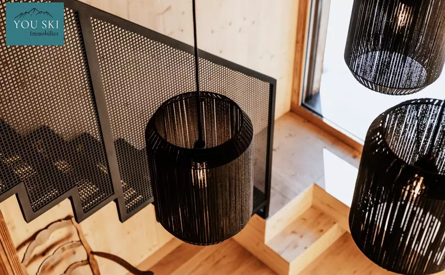 Upstairs, a magnificent living room composed of a cocooning corner with fireplace, a WC, a spacious dining area with huge bay windows opening onto a balcony from where you can admire the skiers and the view of the mountain as well as a modern kitchen with plenty of storage space.