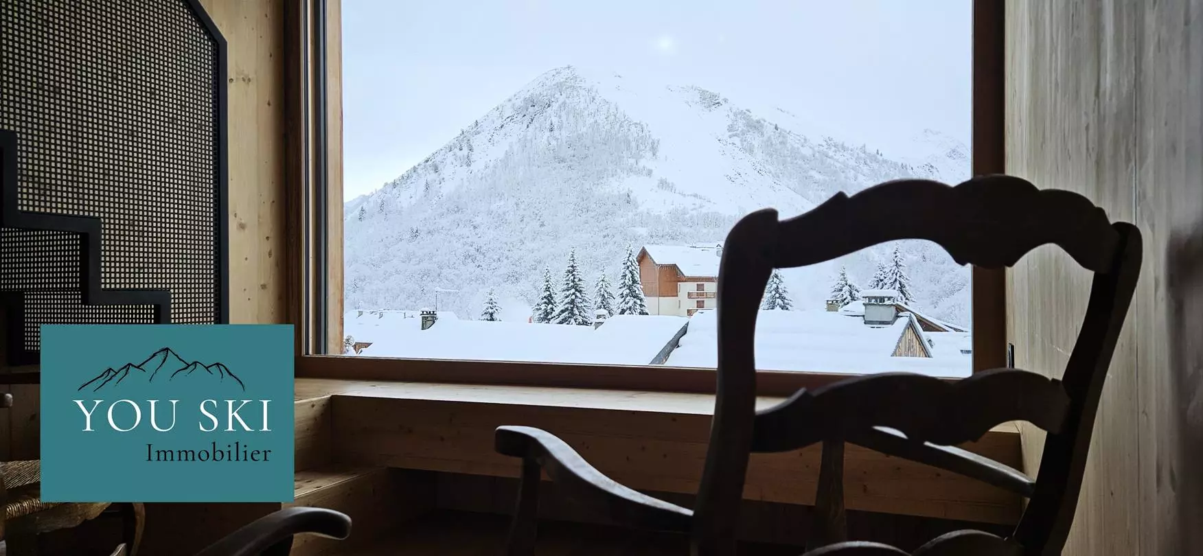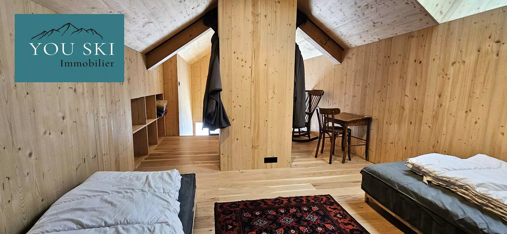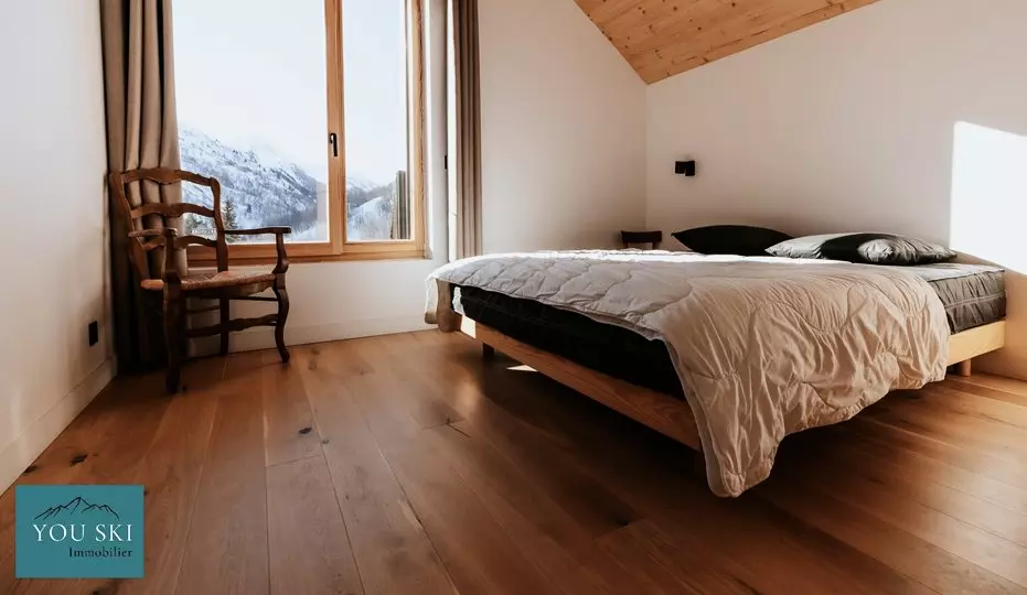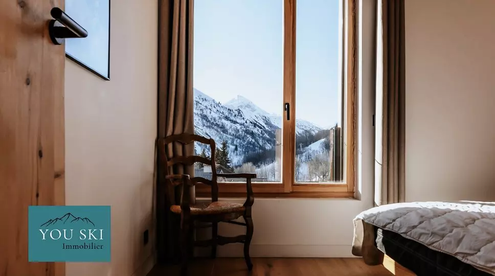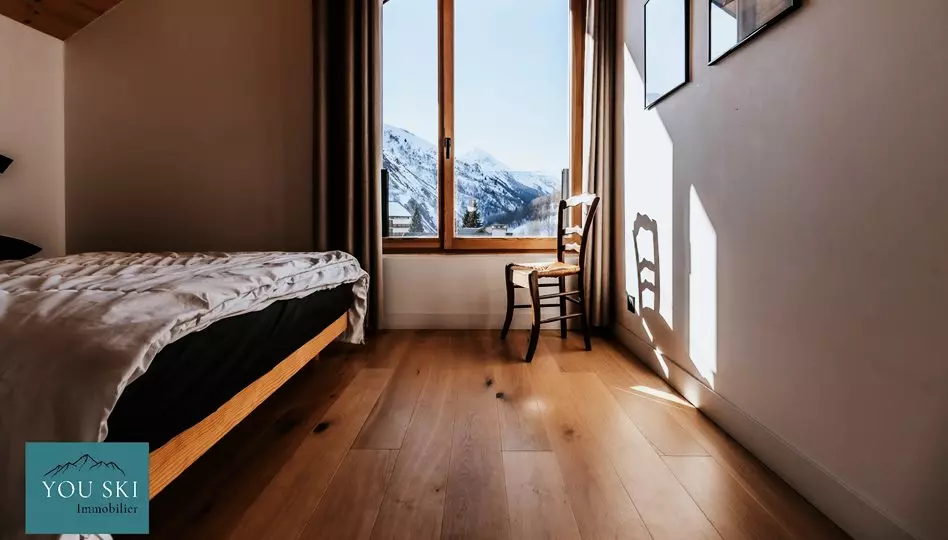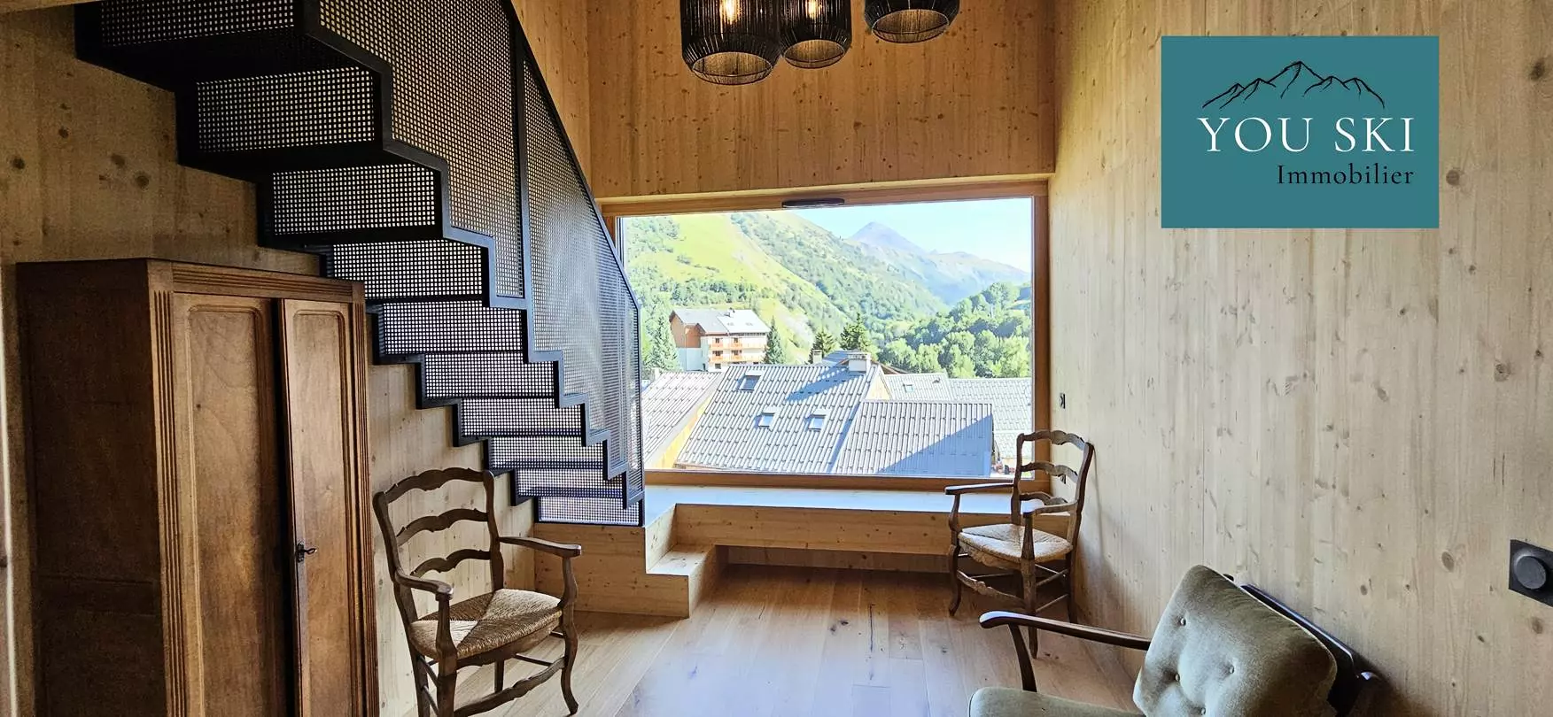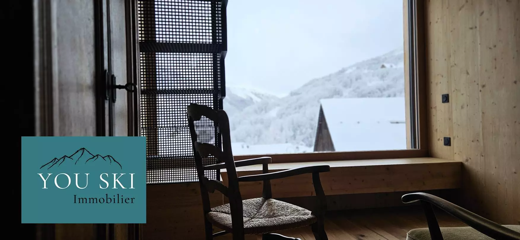 Upstairs, a magnificent living room composed of a cocooning corner with fireplace, a WC, a spacious dining area with huge bay windows opening onto a balcony from where you can admire the skiers and the view of the mountain as well as a modern kitchen with plenty of storage space.