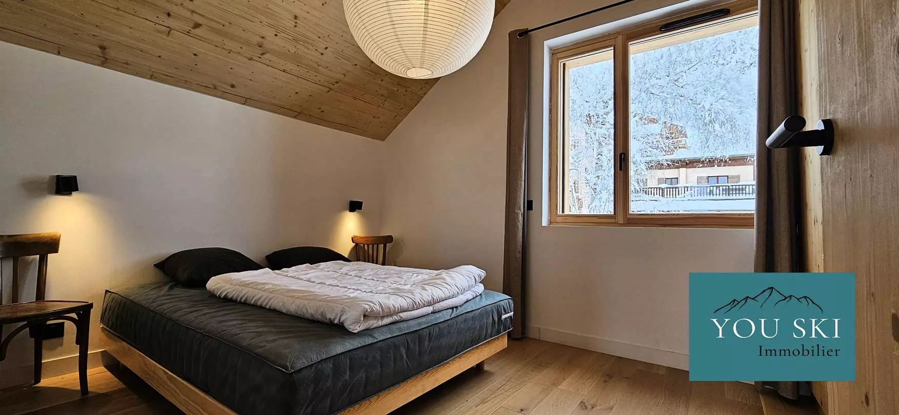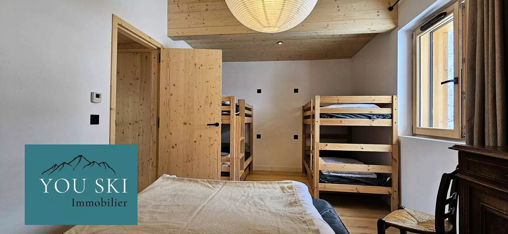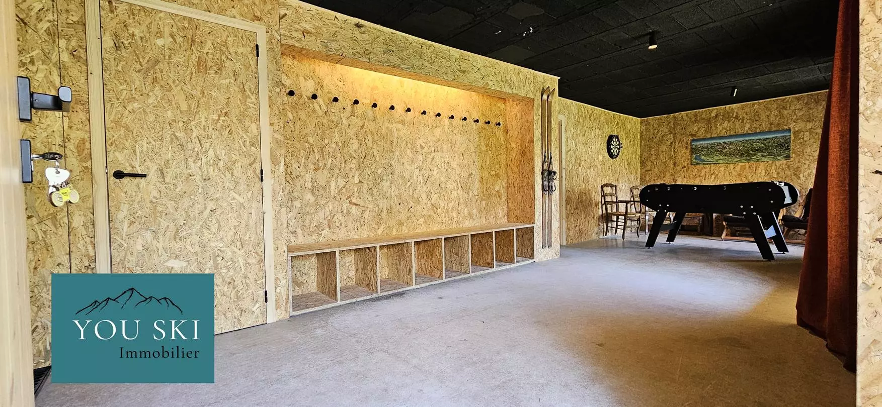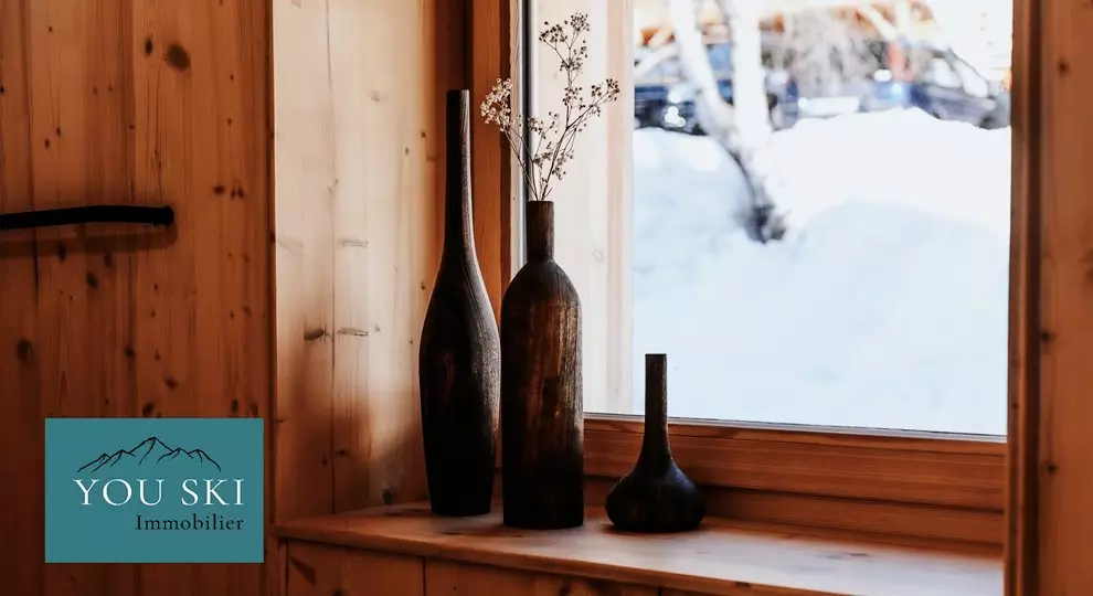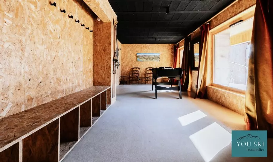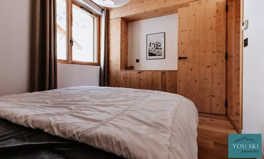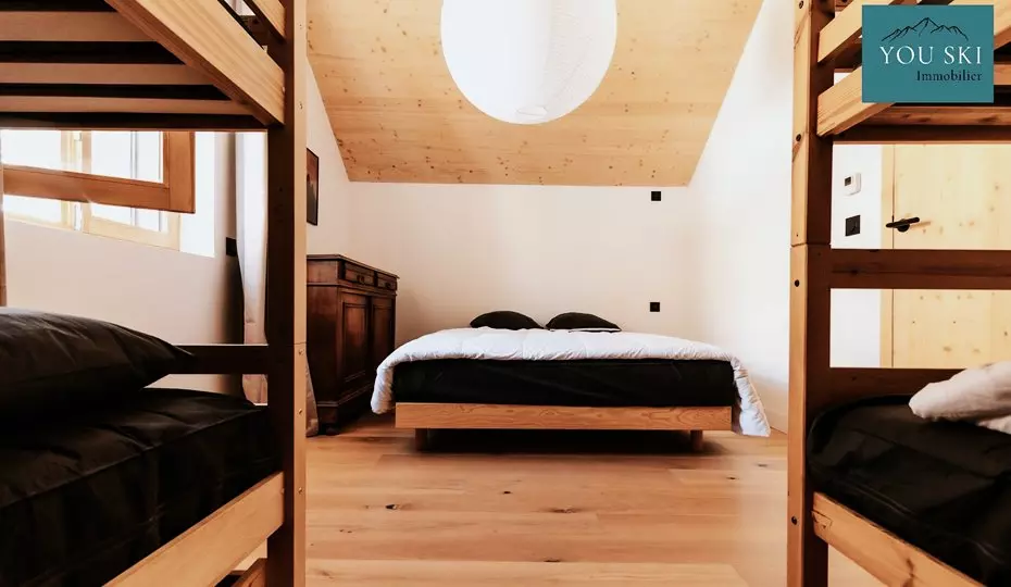 Upstairs, a magnificent living room composed of a cocooning corner with fireplace, a WC, a spacious dining area with huge bay windows opening onto a balcony from where you can admire the skiers and the view of the mountain as well as a modern kitchen with plenty of storage space.