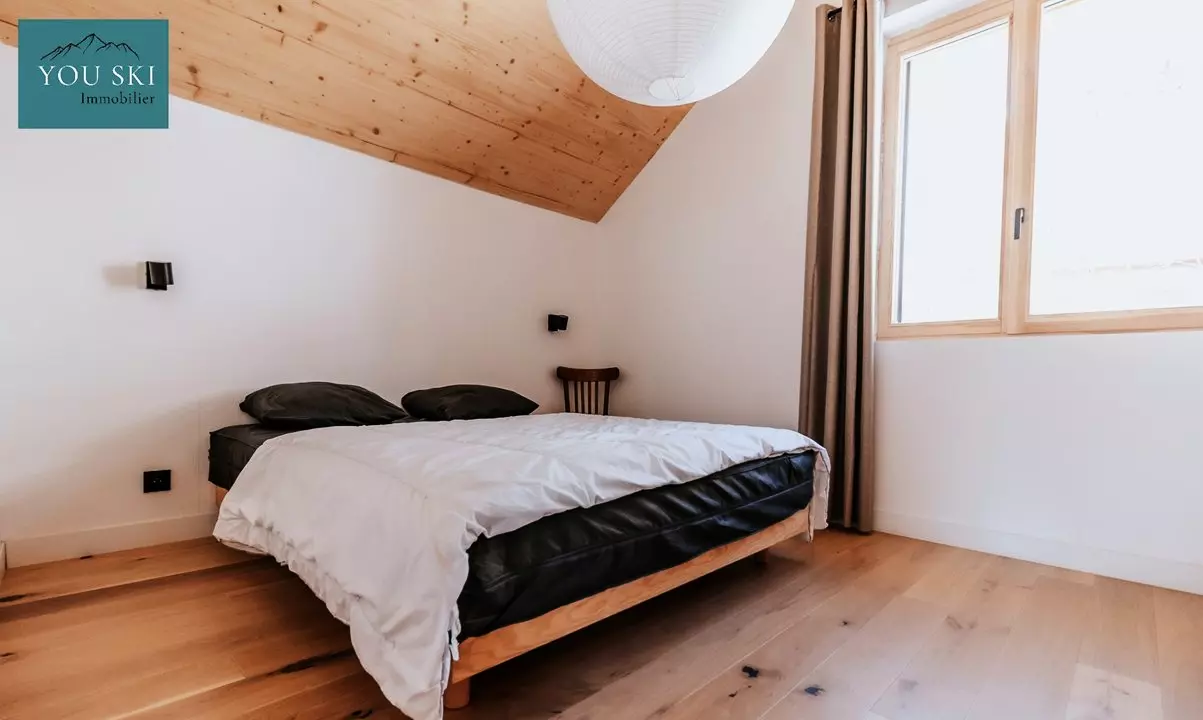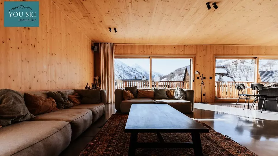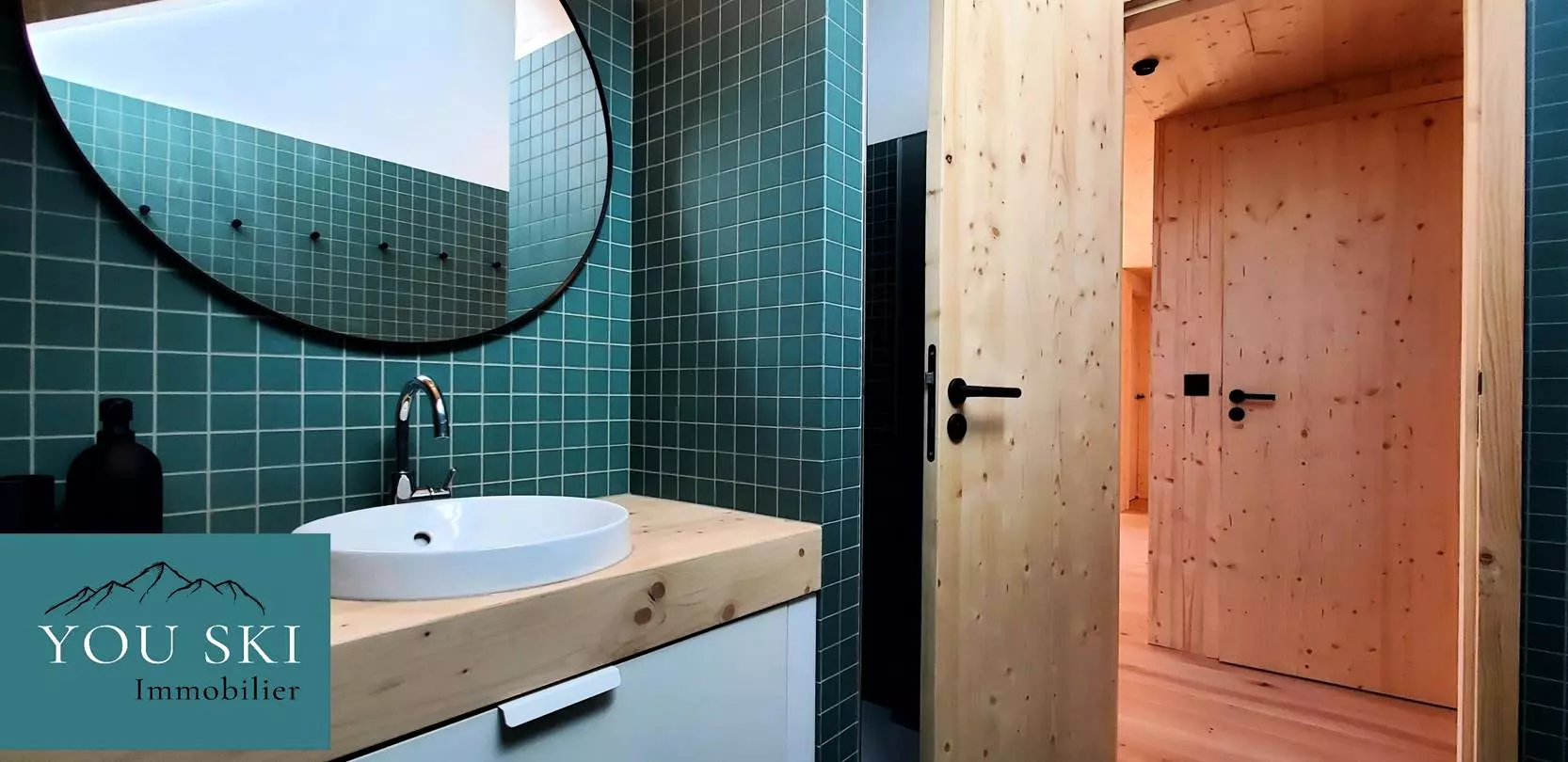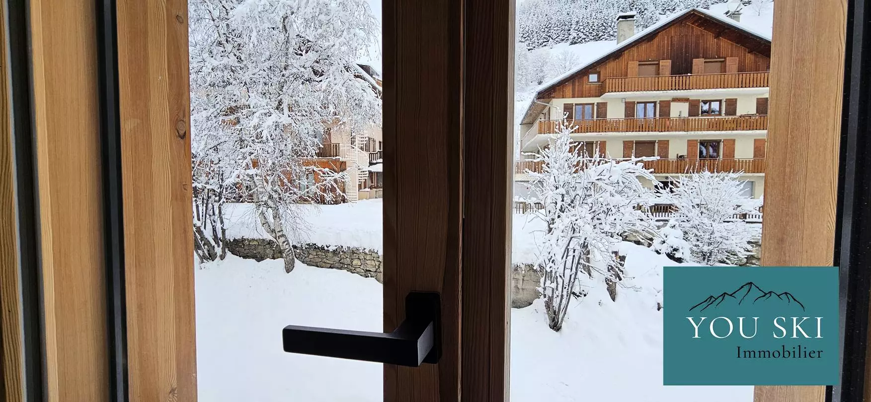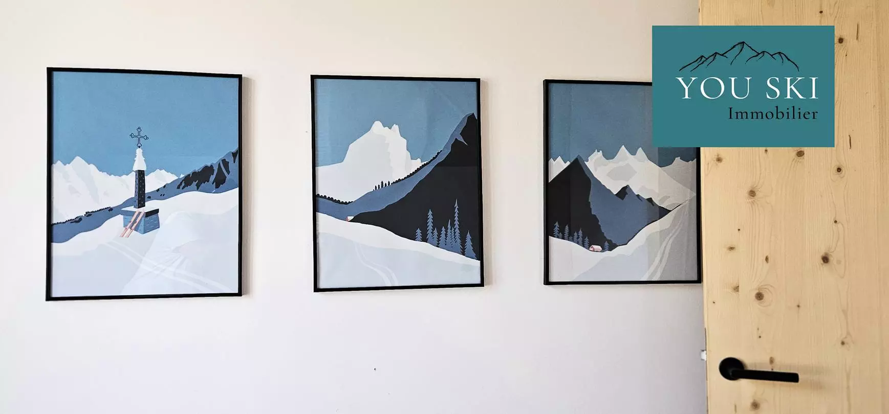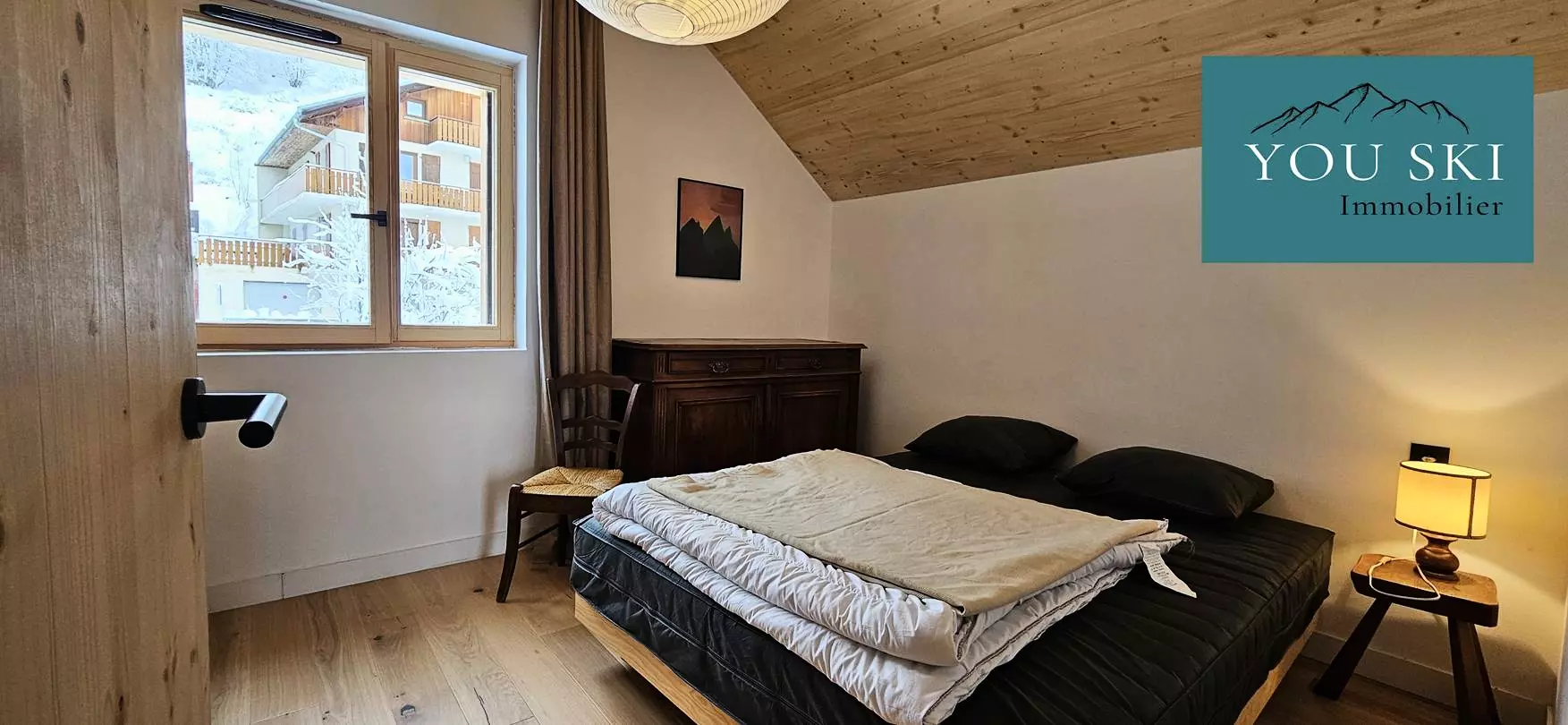 Upstairs, a magnificent living room composed of a cocooning corner with fireplace, a WC, a spacious dining area with huge bay windows opening onto a balcony from where you can admire the skiers and the view of the mountain as well as a modern kitchen with plenty of storage space.