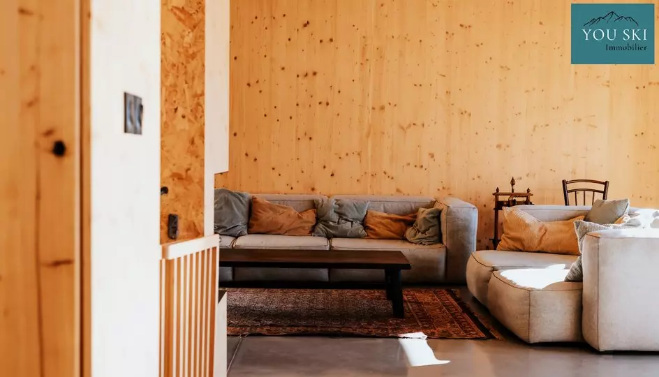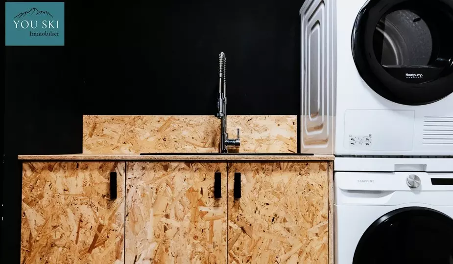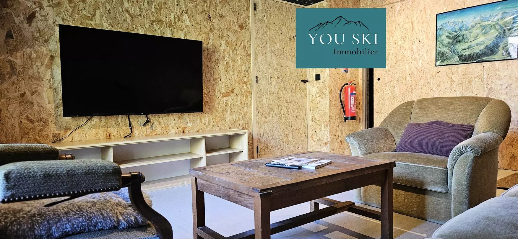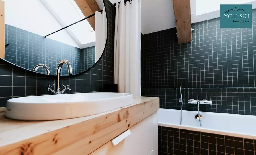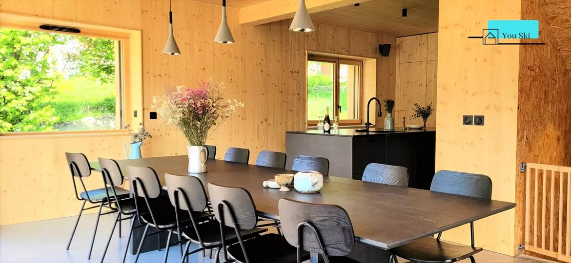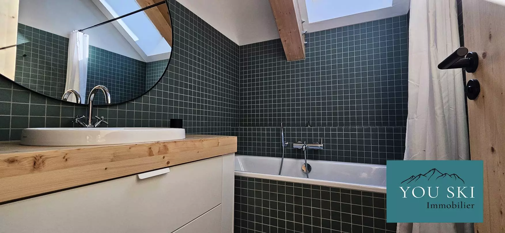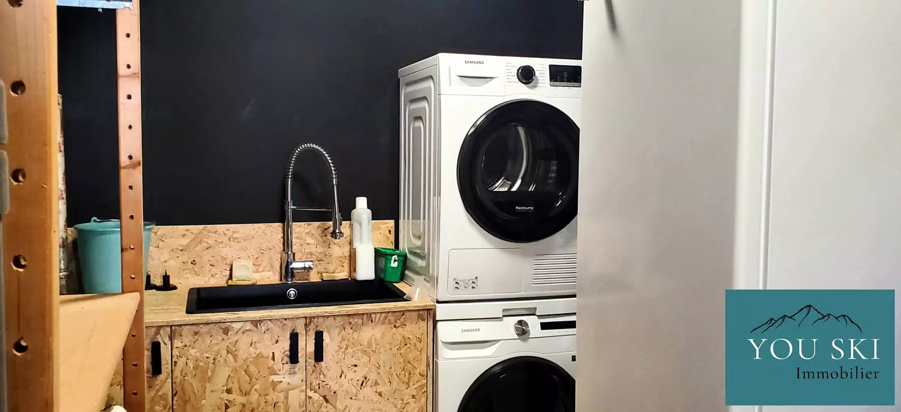 Upstairs, a magnificent living room composed of a cocooning corner with fireplace, a WC, a spacious dining area with huge bay windows opening onto a balcony from where you can admire the skiers and the view of the mountain as well as a modern kitchen with plenty of storage space.