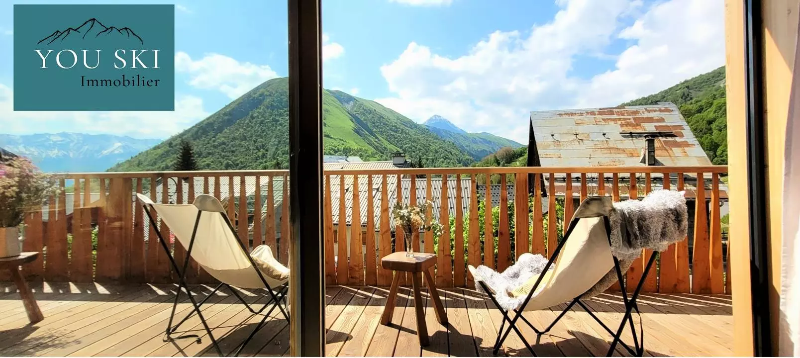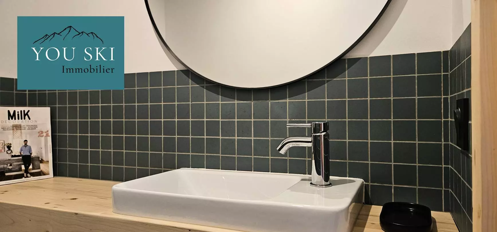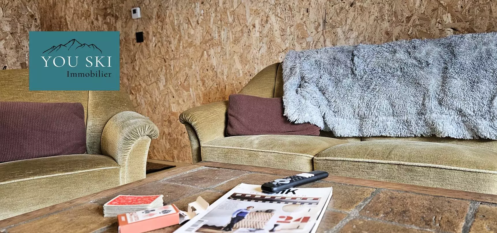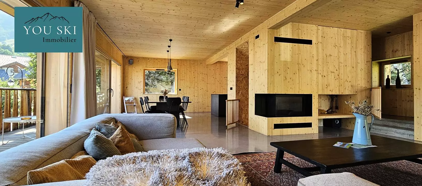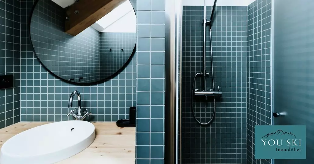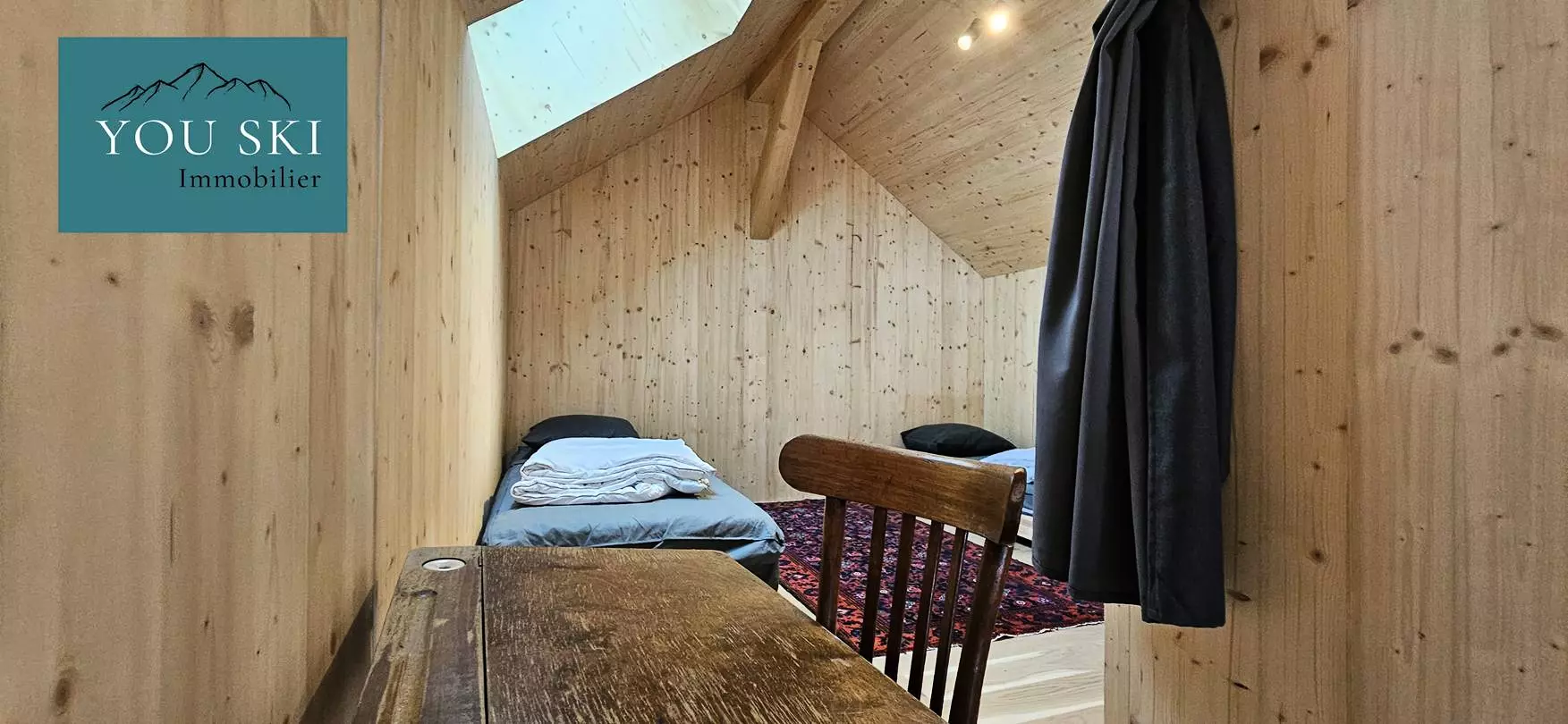 Upstairs, a magnificent living room composed of a cocooning corner with fireplace, a WC, a spacious dining area with huge bay windows opening onto a balcony from where you can admire the skiers and the view of the mountain as well as a modern kitchen with plenty of storage space.