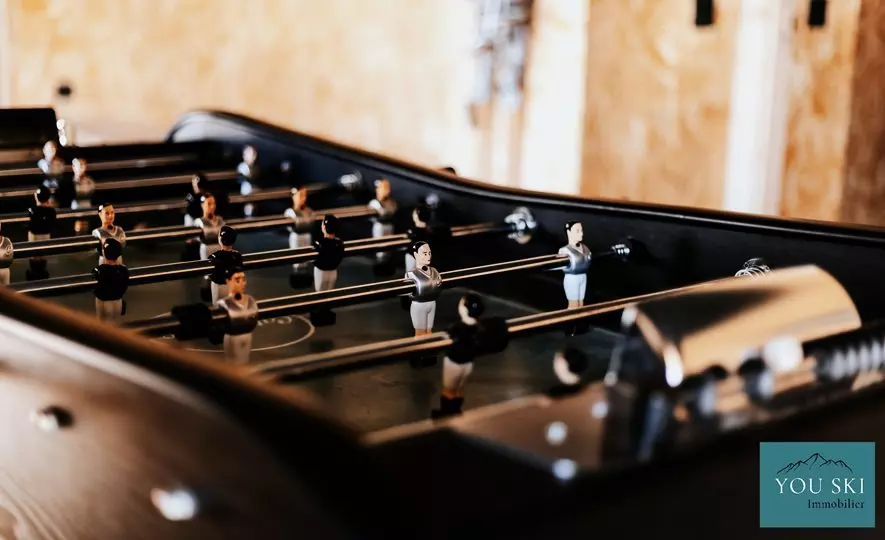 On the ground floor, an entrance hall with storage, a relaxation area with table football, a lounge area with TV, a laundry room with washing machine and dryer.