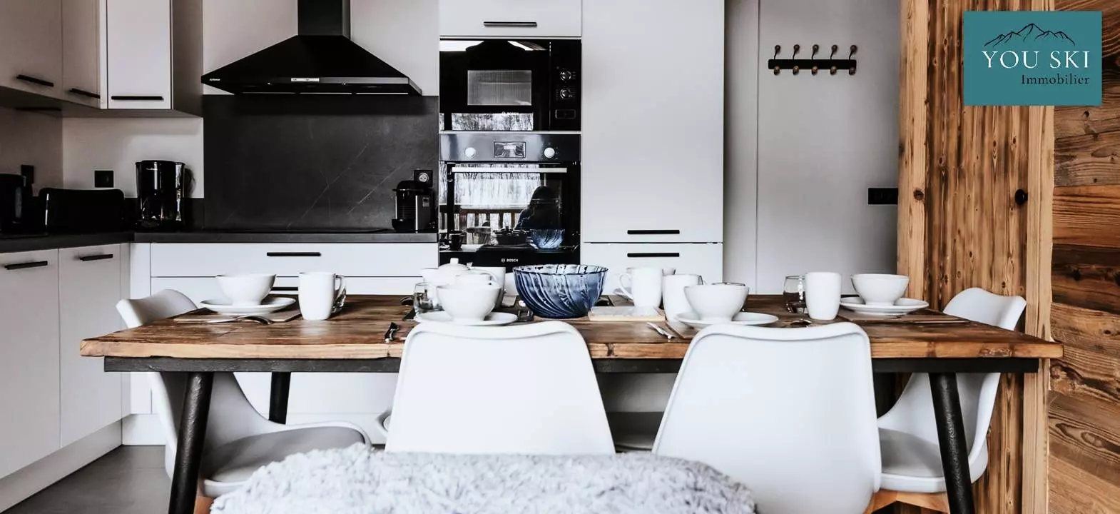 The kitchen is modern and equipped with a dishwasher, a large fridge, an oven, a coffee maker, a kettle, a toaster, and all the crockery for 6 people!
