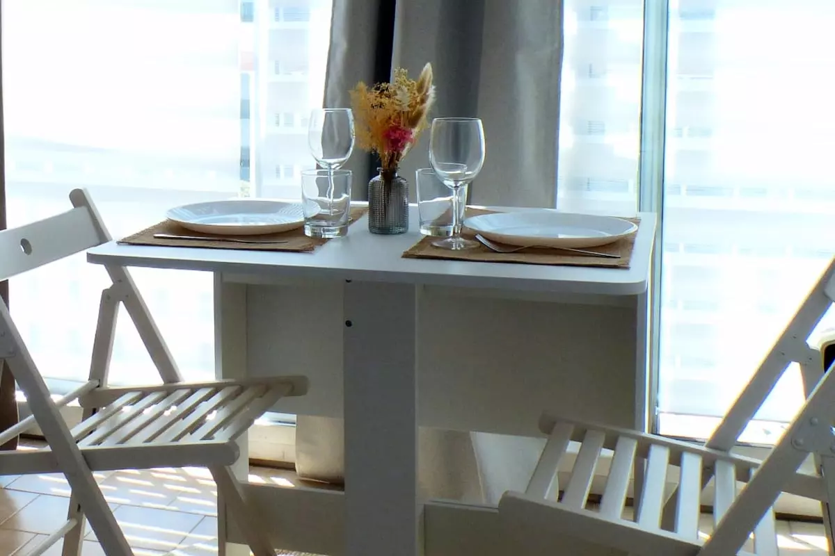 - a loggia with dining table and chairs.