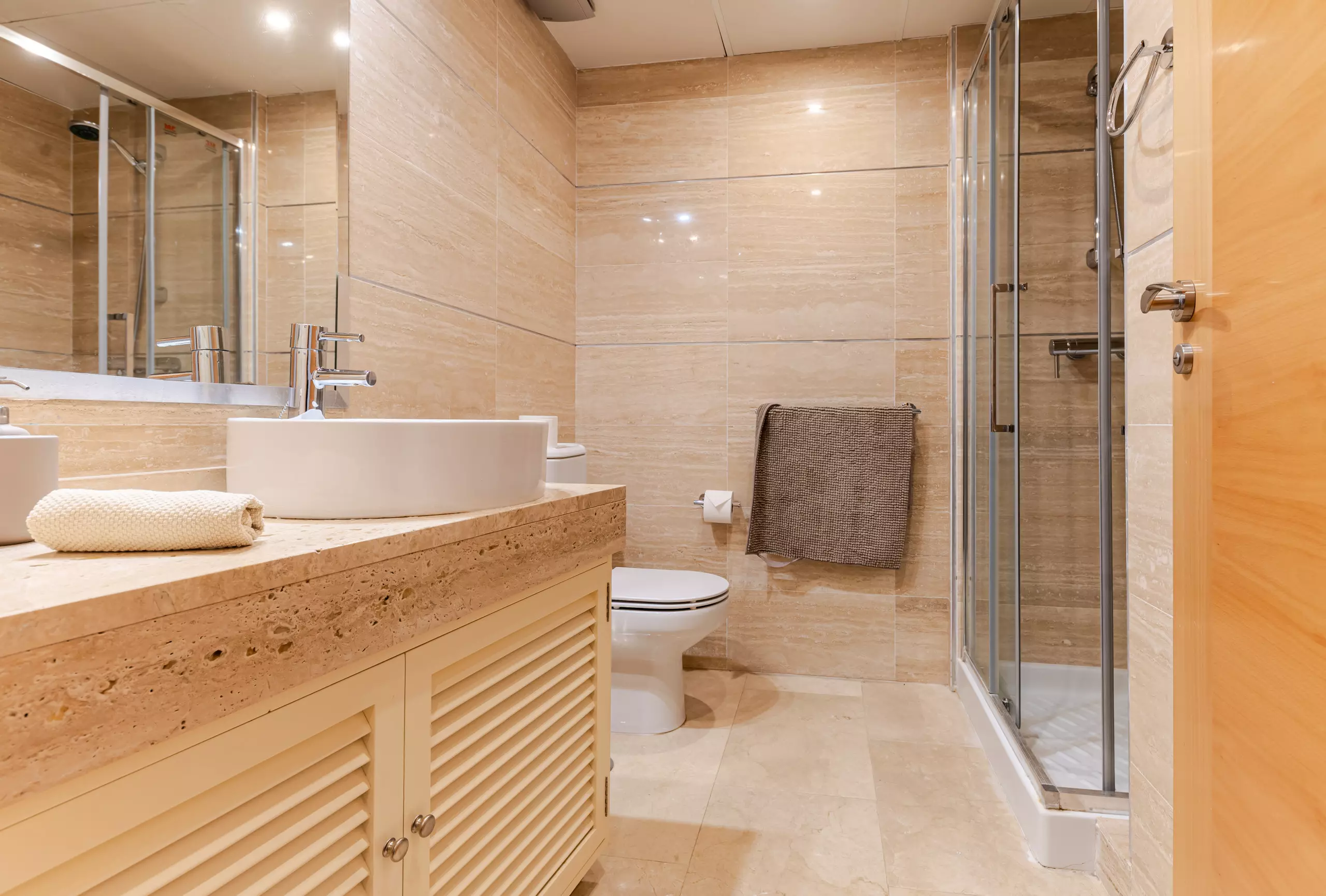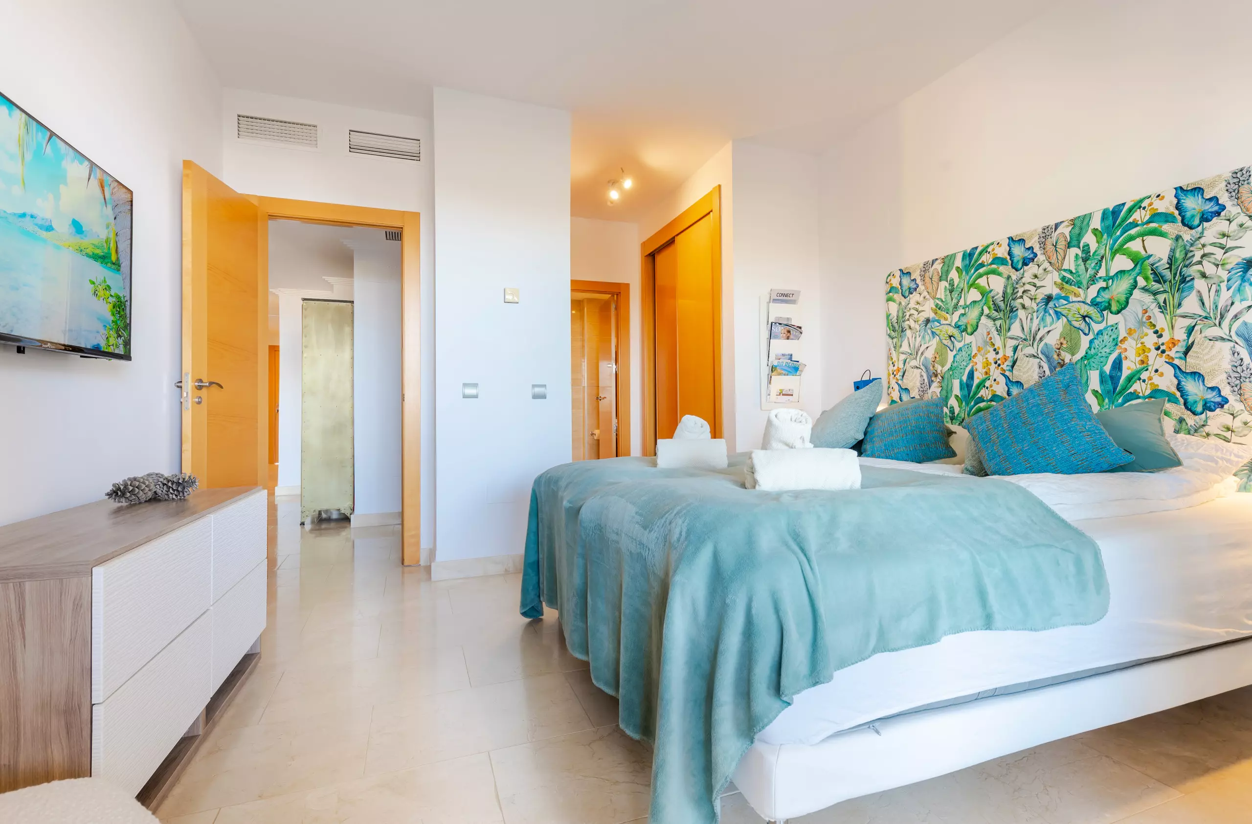 The master bedroom has a 1.80 x 2.00 m double bed, a built-in wardrobe and a private bathroom with a bath/shower, toilet and double sink. From this bedroom there is direct access to the east-facing terrace.