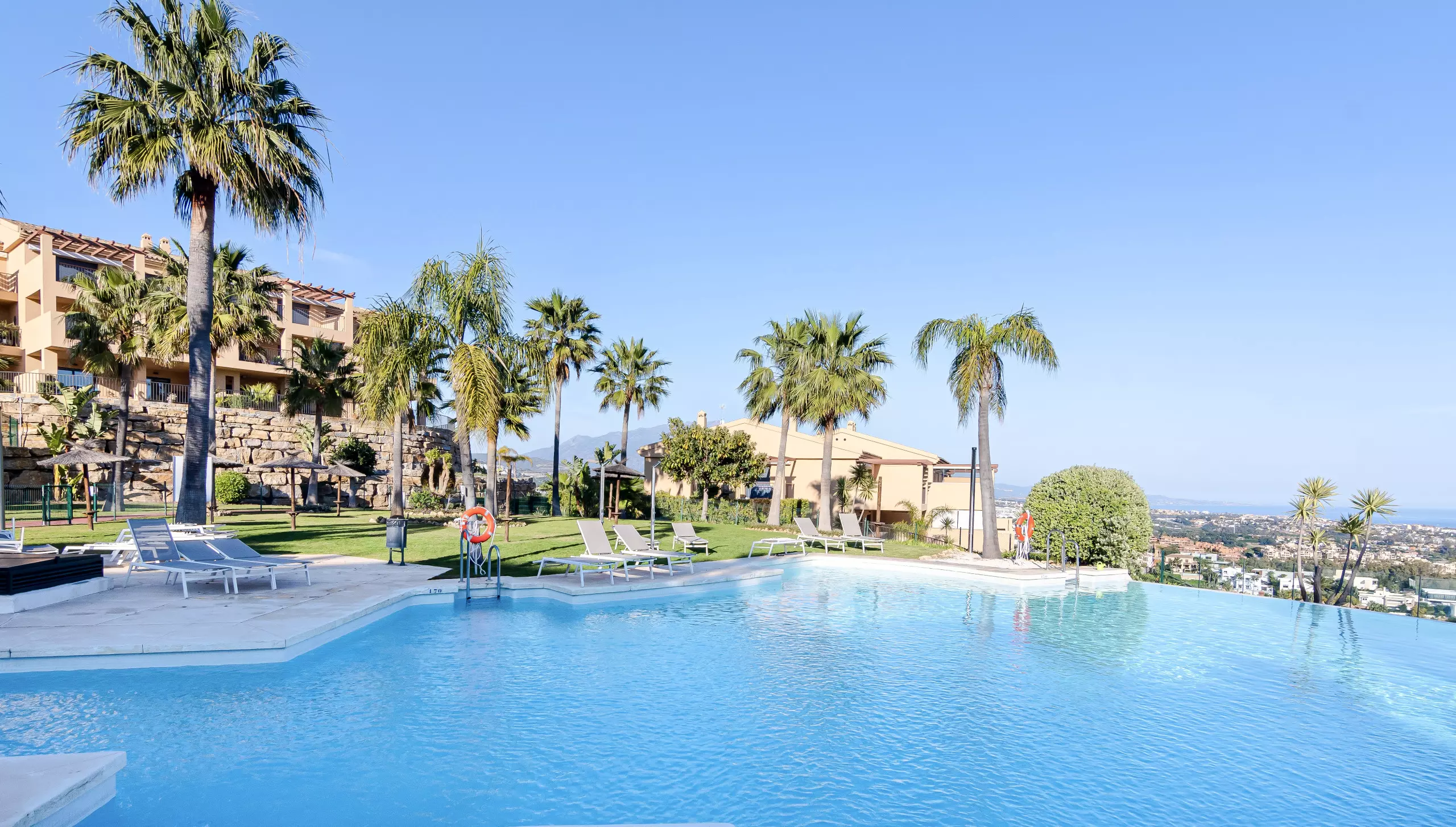 The La Hacienda community is gated and features landscaped gardens with four large swimming pools, including lounge chairs for residents. The infinity pool is heated during the winter.