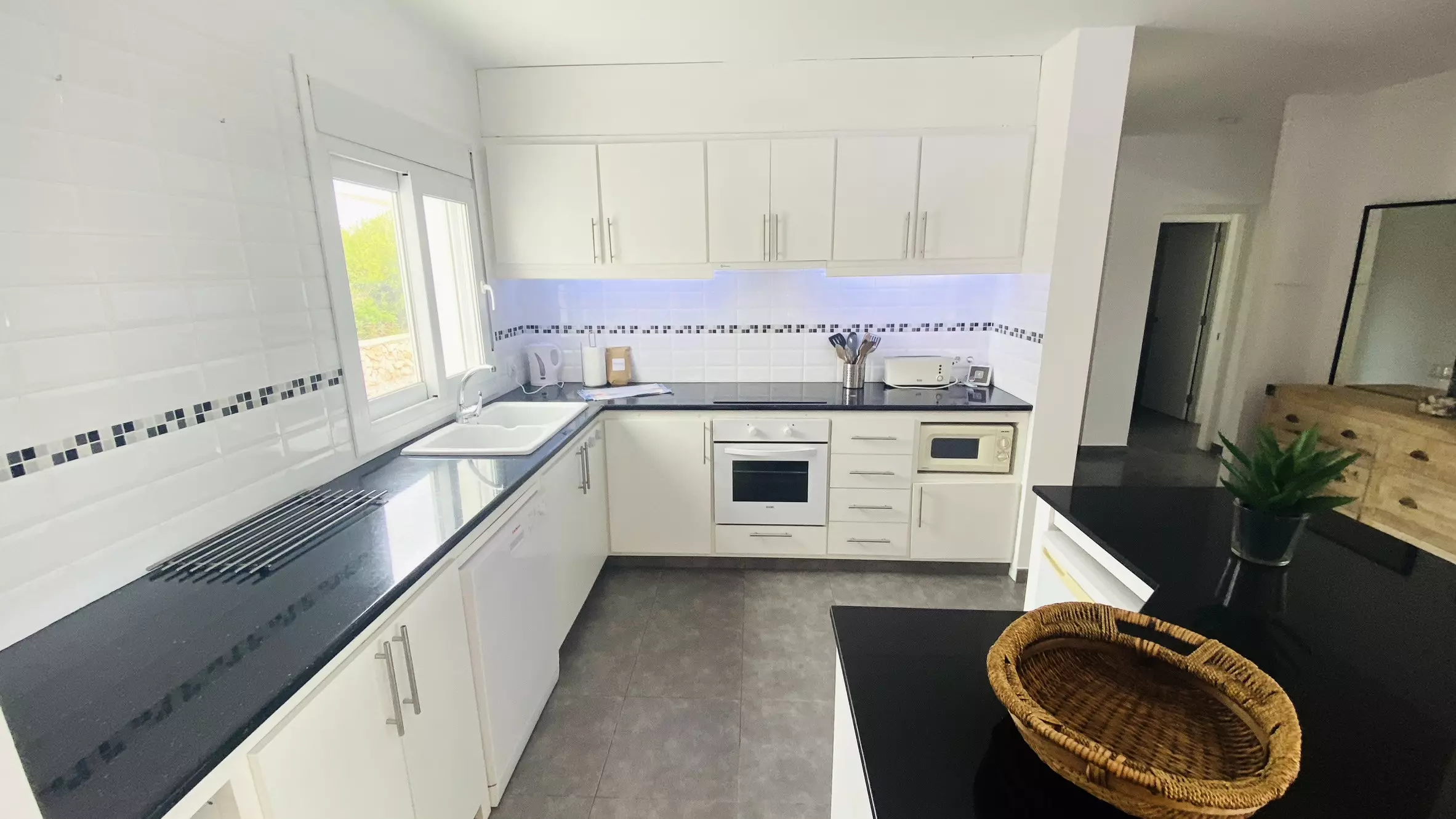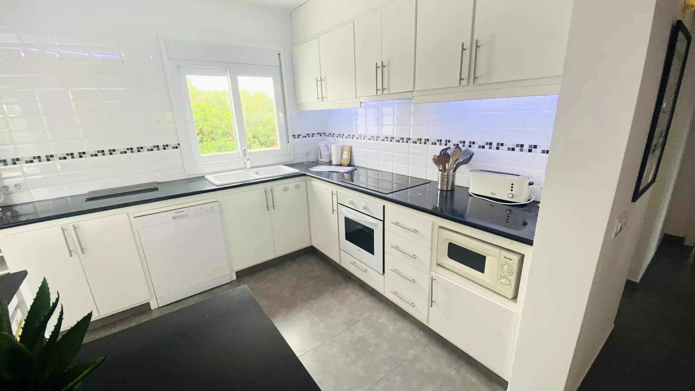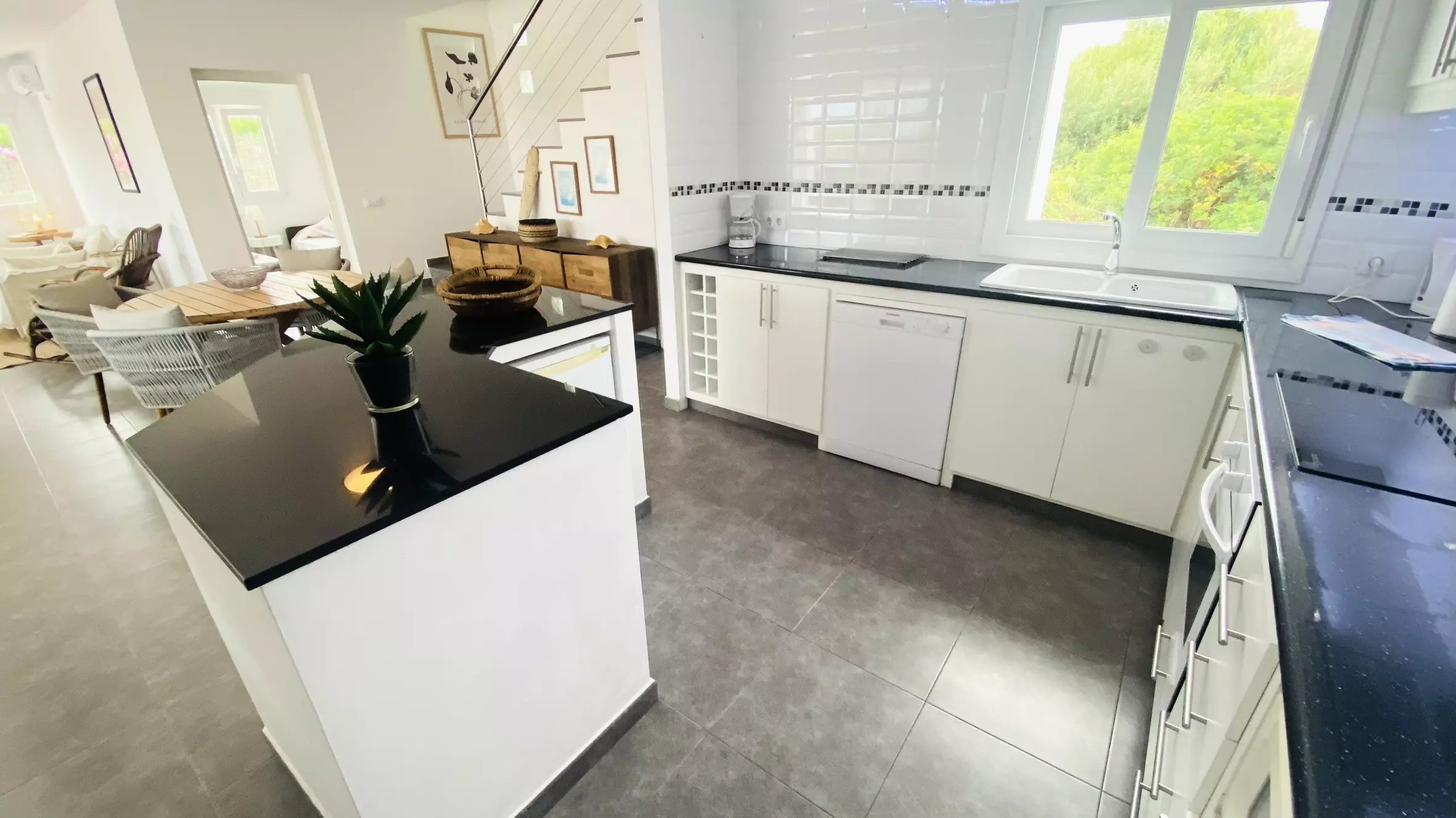 The open-plan kitchen is fully equipped with state-of-the-art appliances, including a washing machine, dishwasher, oven, microwave, coffee maker, and a wide variety of dishes. It also features air conditioning and a heat pump to maintain a perfect temperature year-round.
