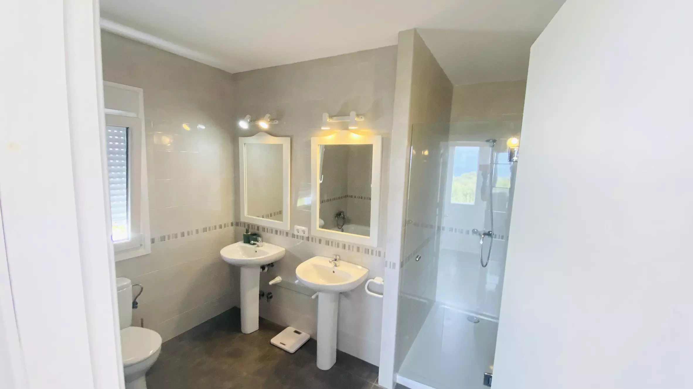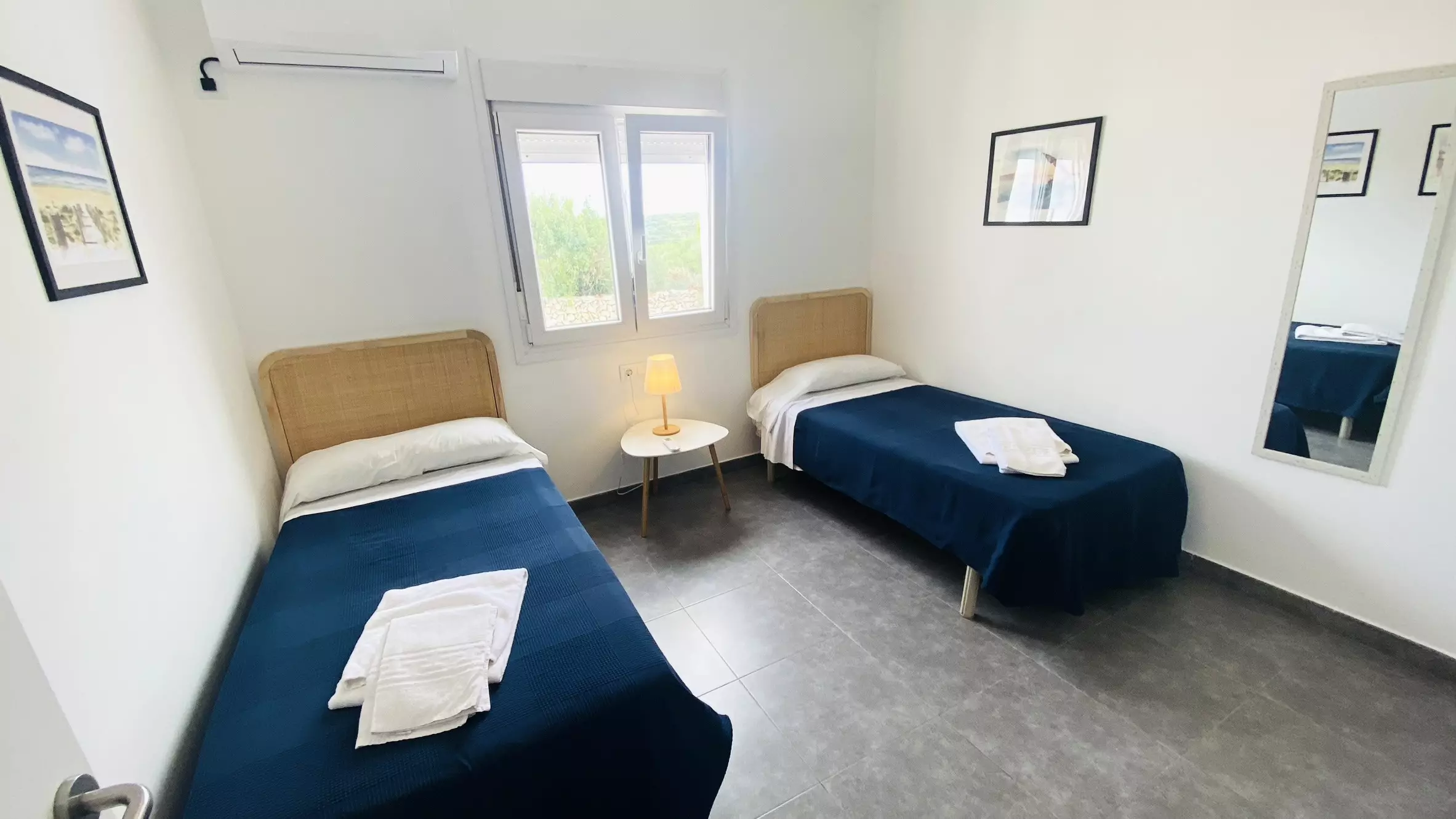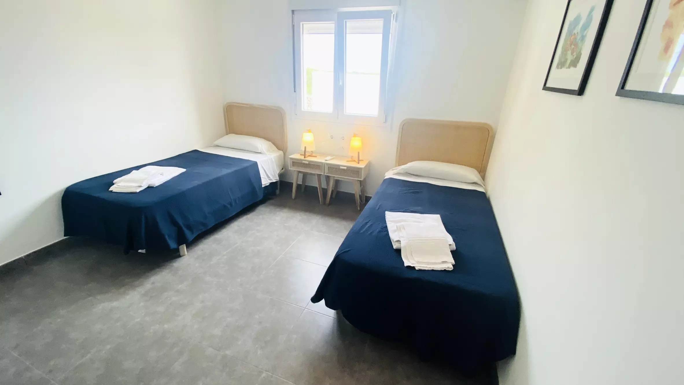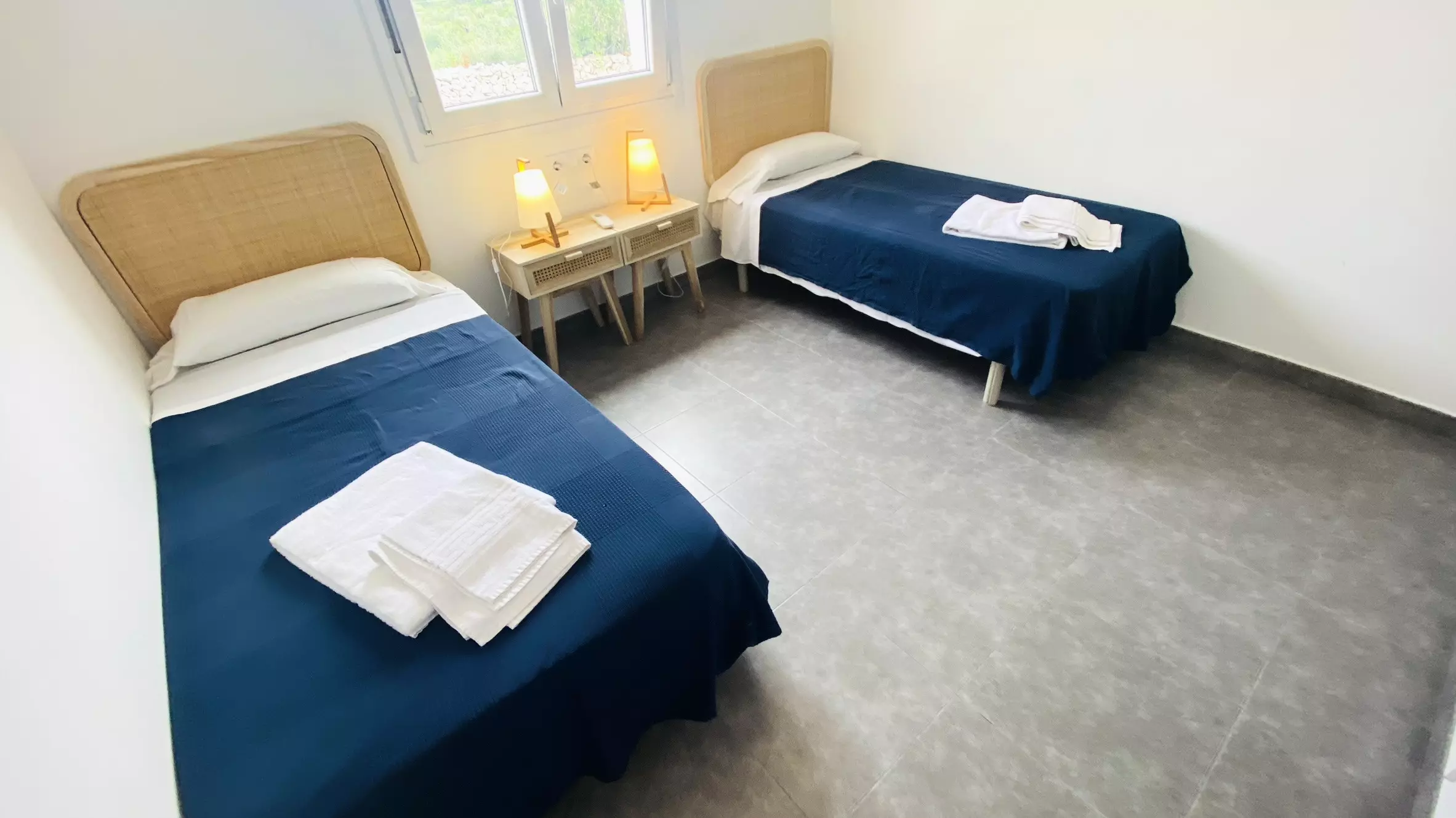 The villa features three fully equipped bedrooms: a master bedroom with a double bed and two additional bedrooms with single beds, ensuring restful rest for all guests. It includes three bathrooms, two with bathtubs and one with a shower, facilitating the daily routine of visitors.