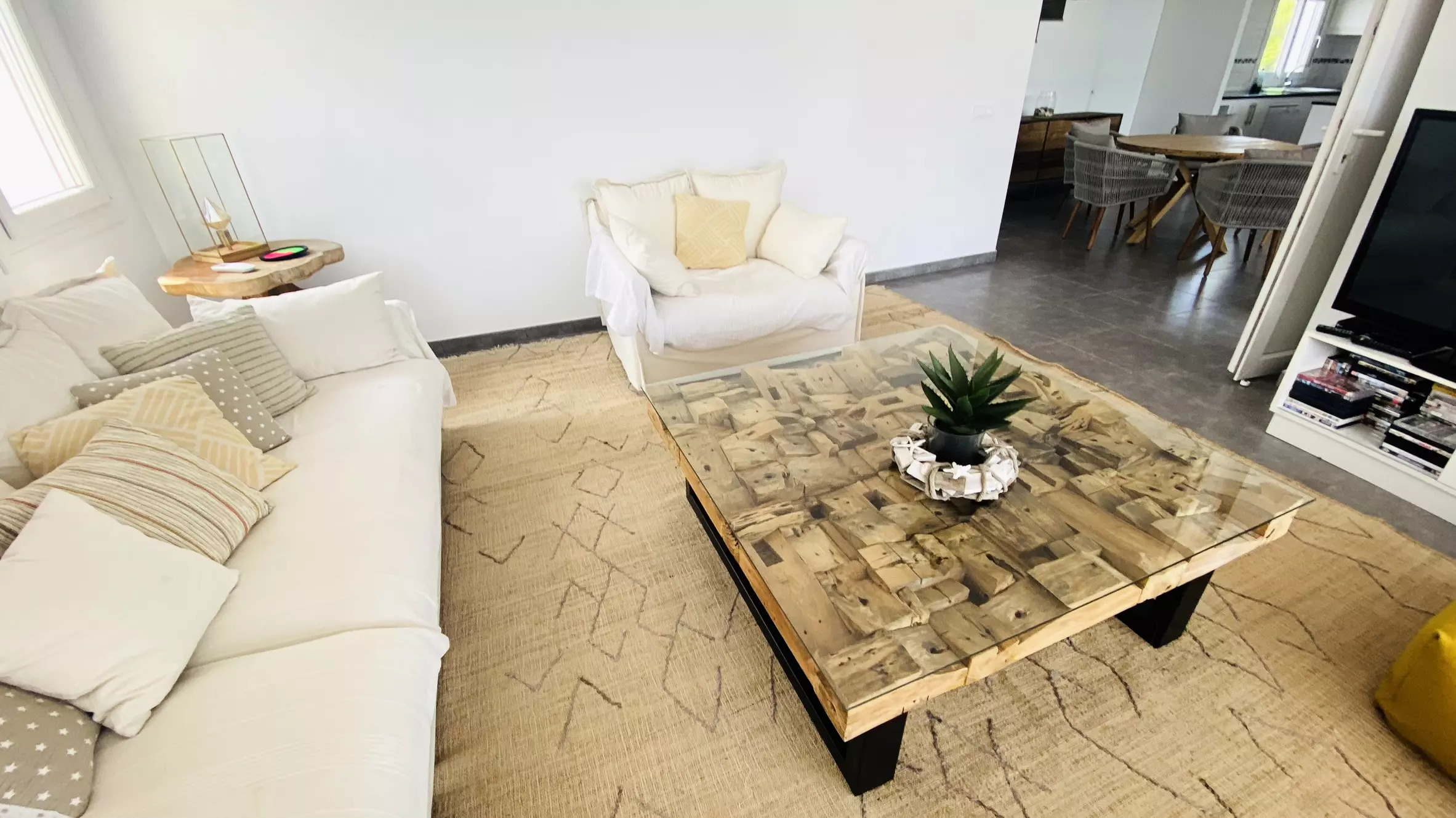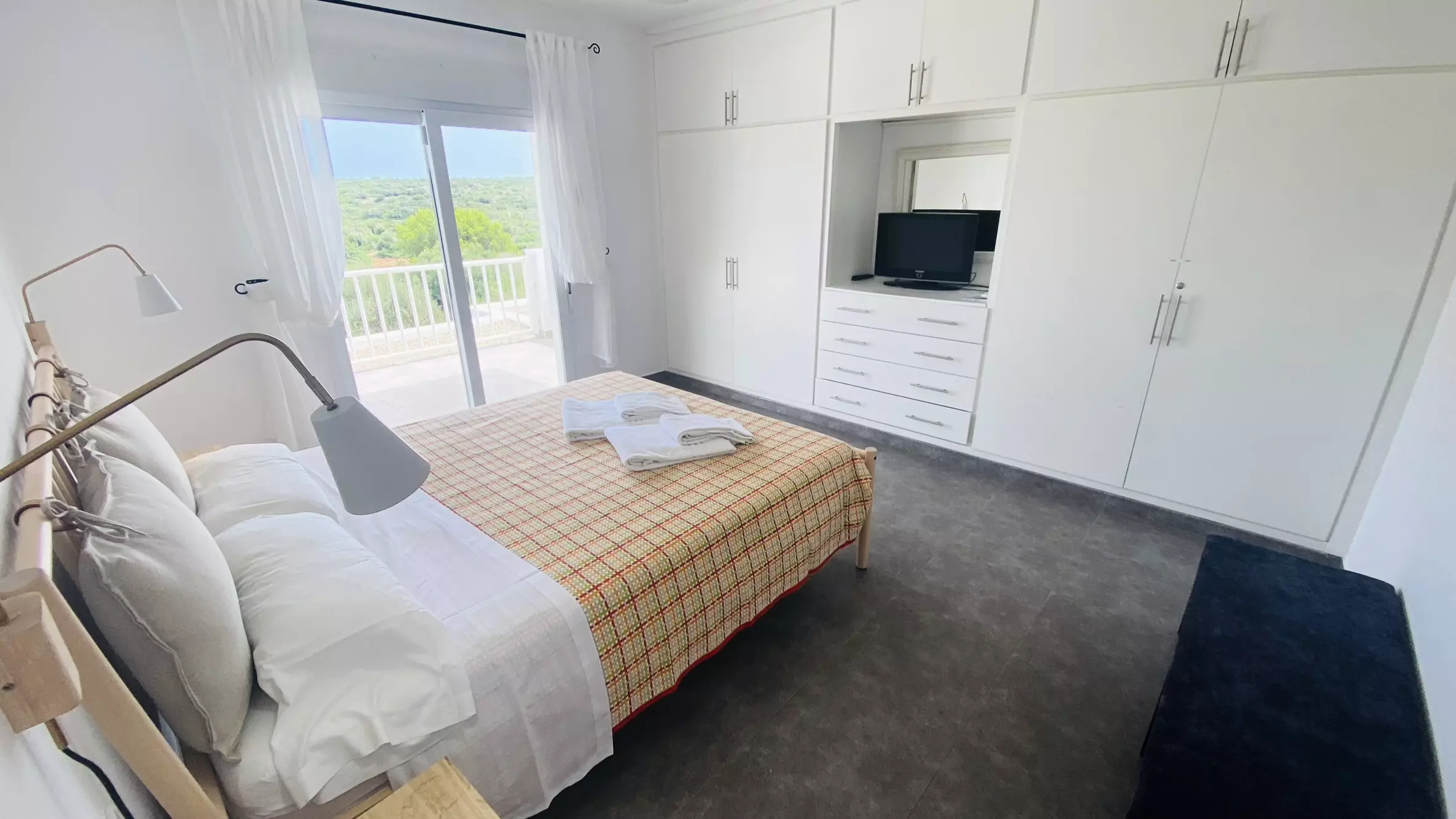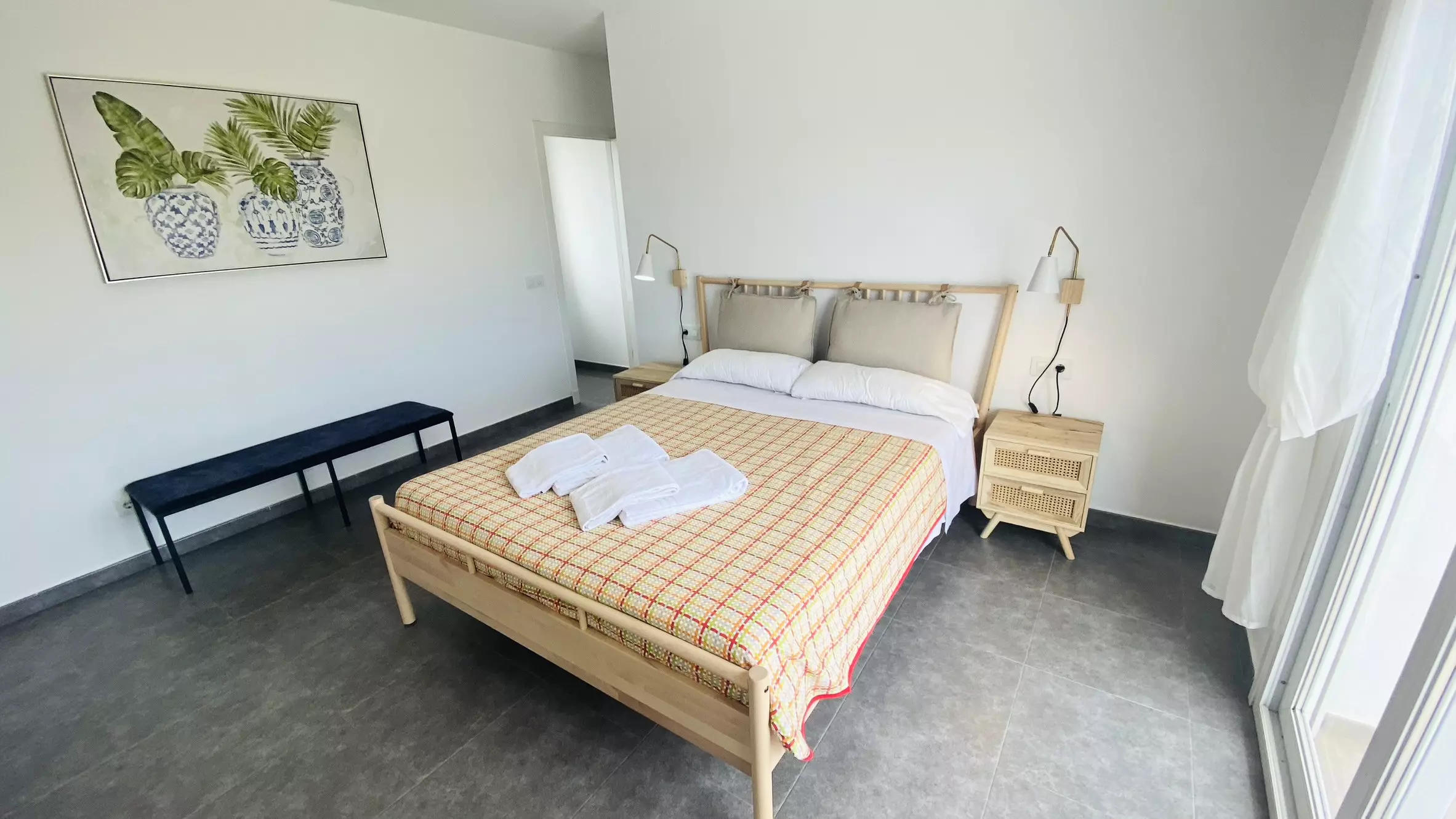 The villa features three fully equipped bedrooms: a master bedroom with a double bed and two additional bedrooms with single beds, ensuring restful rest for all guests. It includes three bathrooms, two with bathtubs and one with a shower, facilitating the daily routine of visitors.