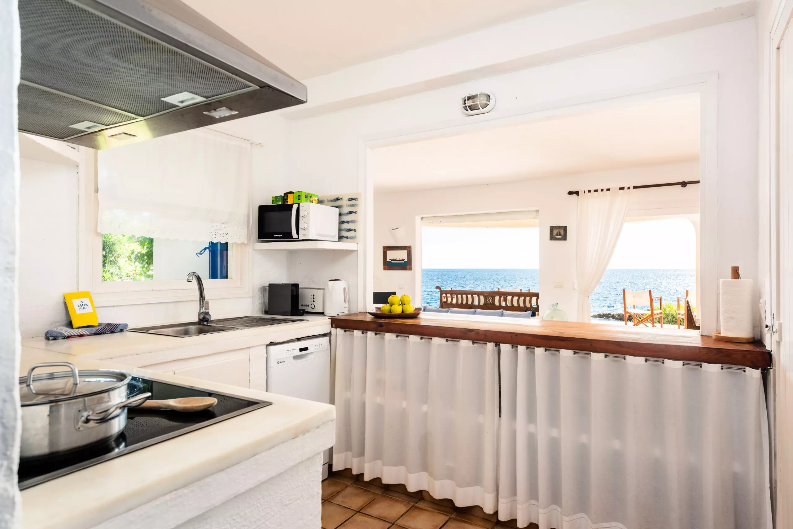 The open-plan kitchen, with ceramic hob, is equipped with a refrigerator, oven, freezer, dishwasher, dishes/cutlery, kitchen utensils, coffee maker, toaster, kettle and juicer.