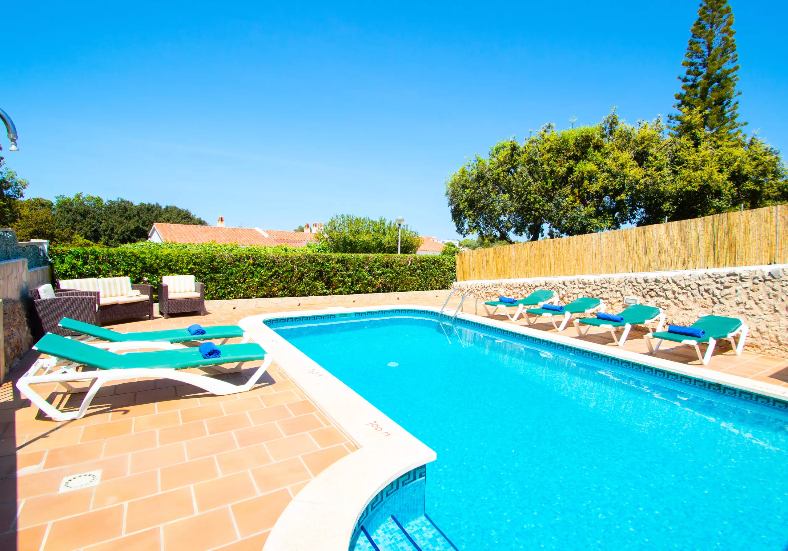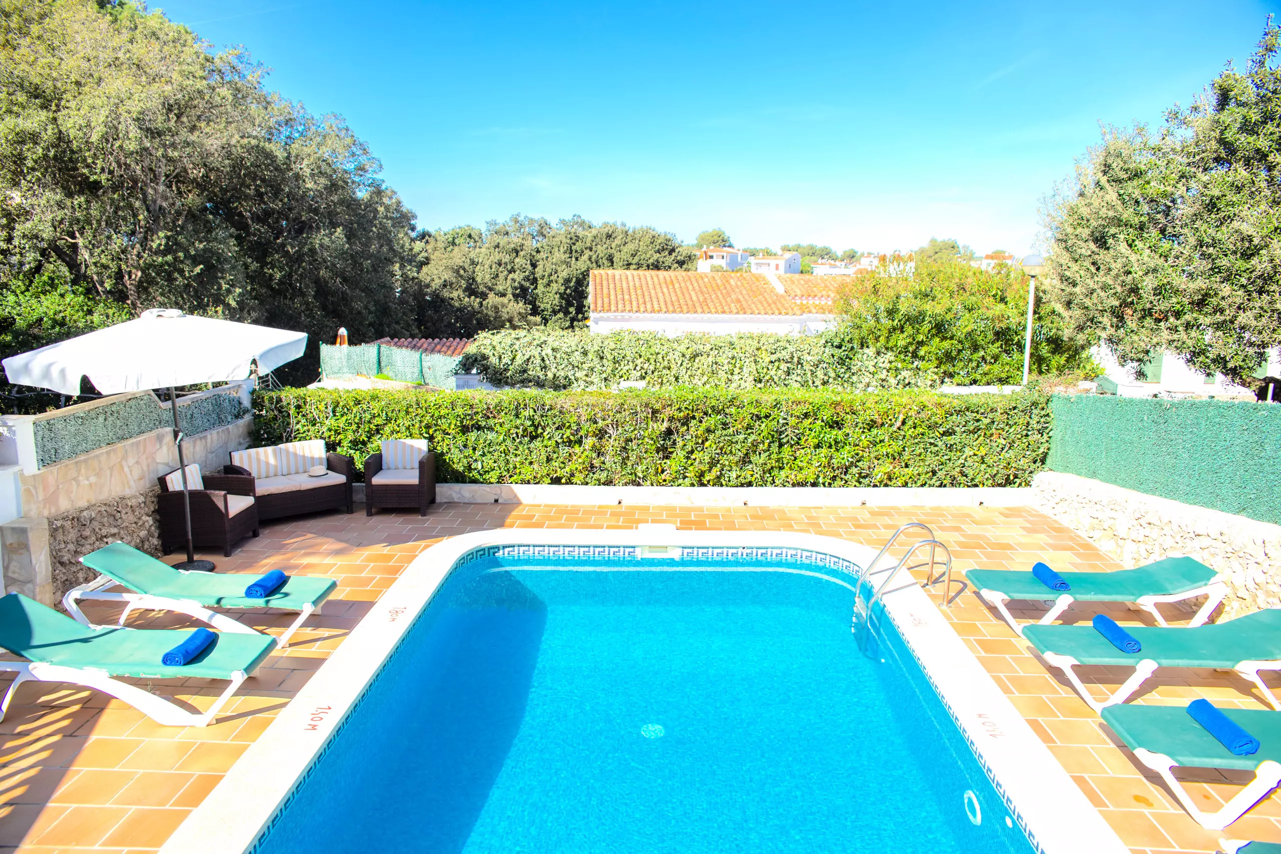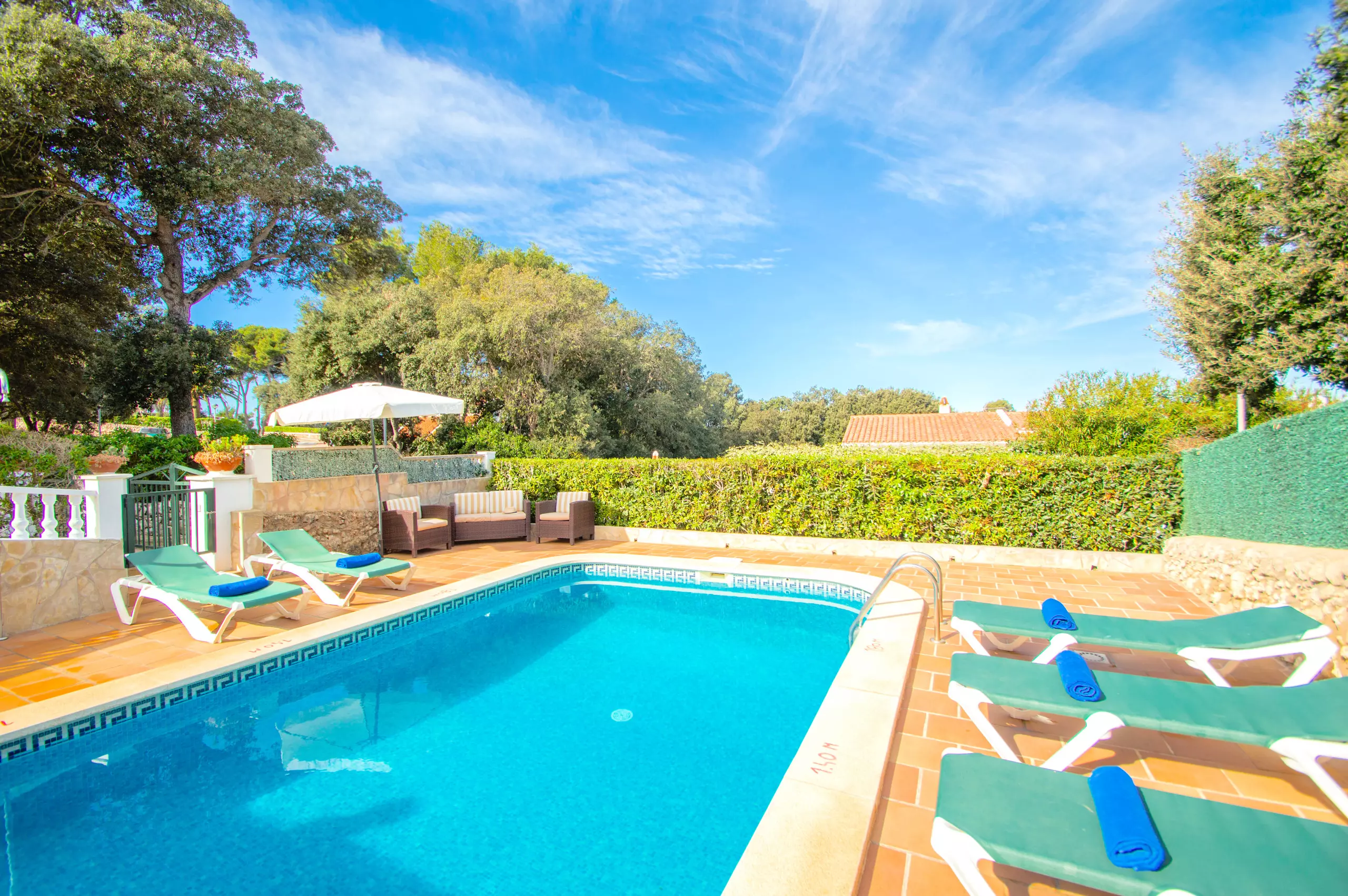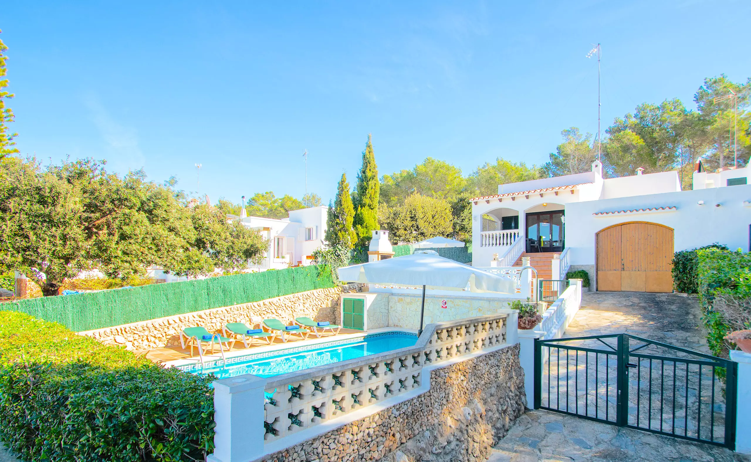 At the front of the Villa to rent in Menorca we find the private pool, the barbecue and the Menorcan style terrace with a large outdoor garden area. It has sunbeds, umbrellas and all the outdoor garden furniture necessary to enjoy the sun, the pool, and meals and evenings with the most loved ones.