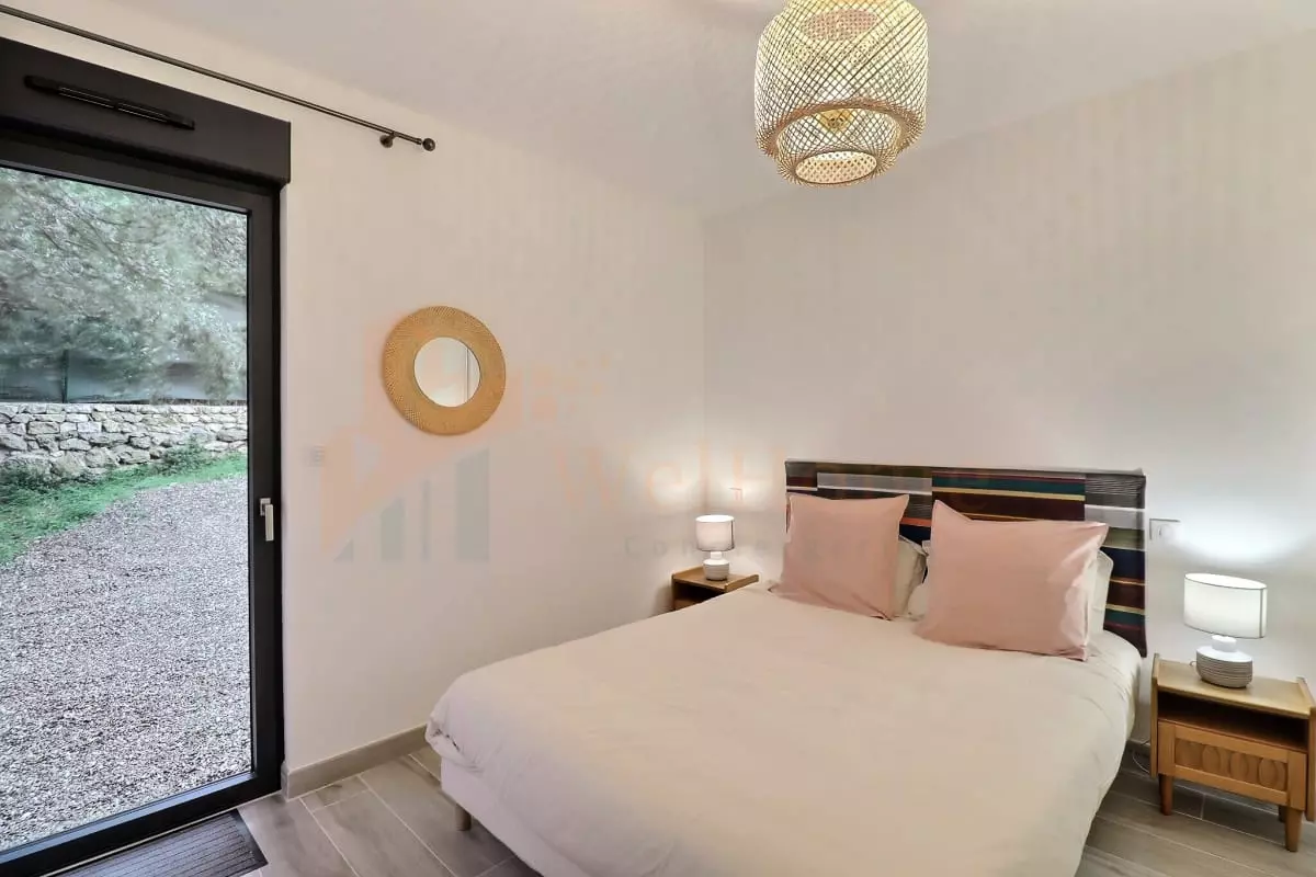 On the garden level, you will find two additional bedrooms, each with a 160 x 200 cm bed and a storage closet, fans, as well as another bathroom and an English courtyard.