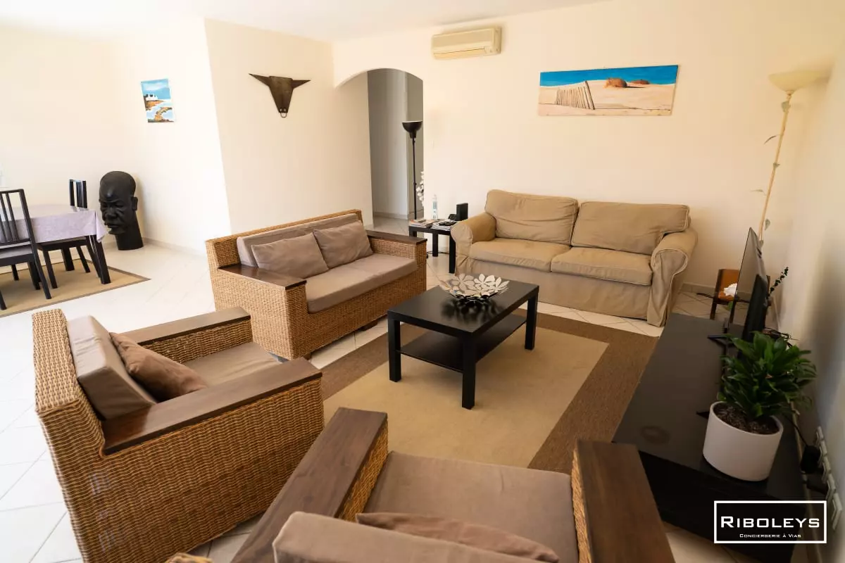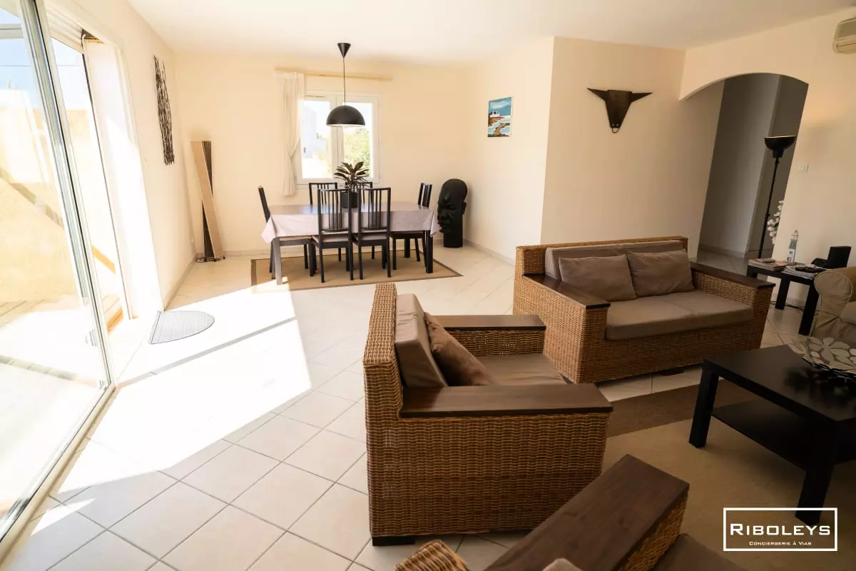 This spacious single-story villa, ideally located just 2.5 km from the sea, will charm you with its generous proportions and peaceful atmosphere. Nestled in a residential area, it offers an intimate and welcoming setting, perfect for a relaxing stay.