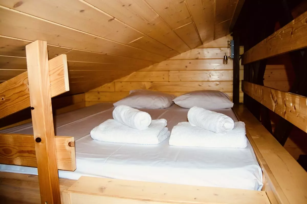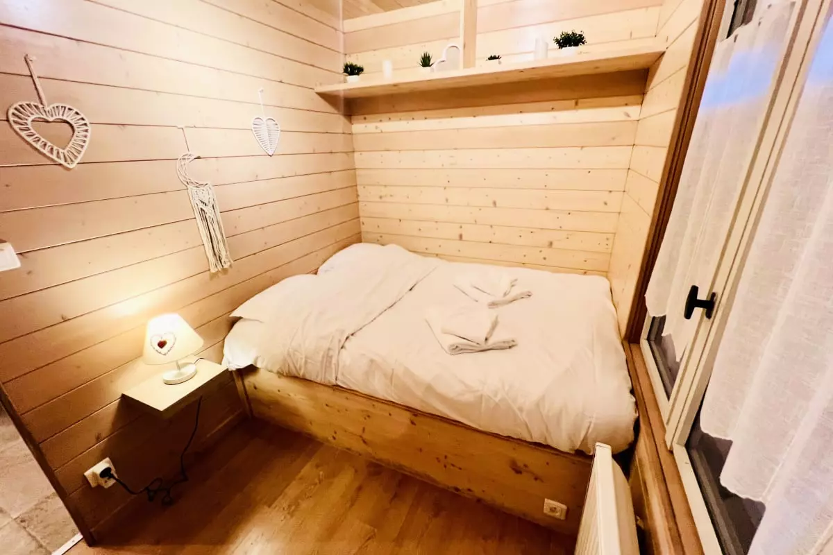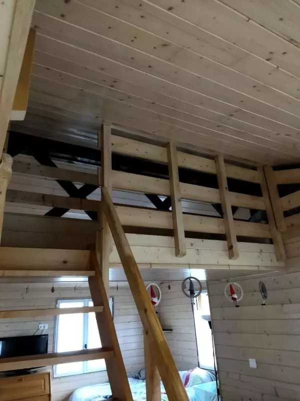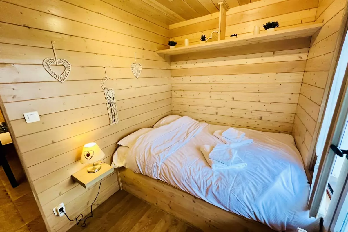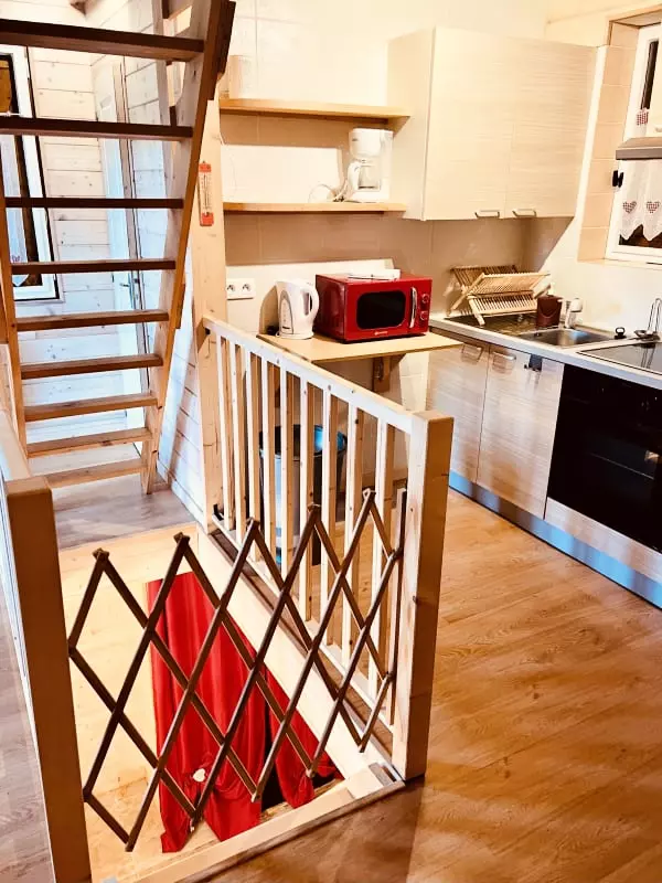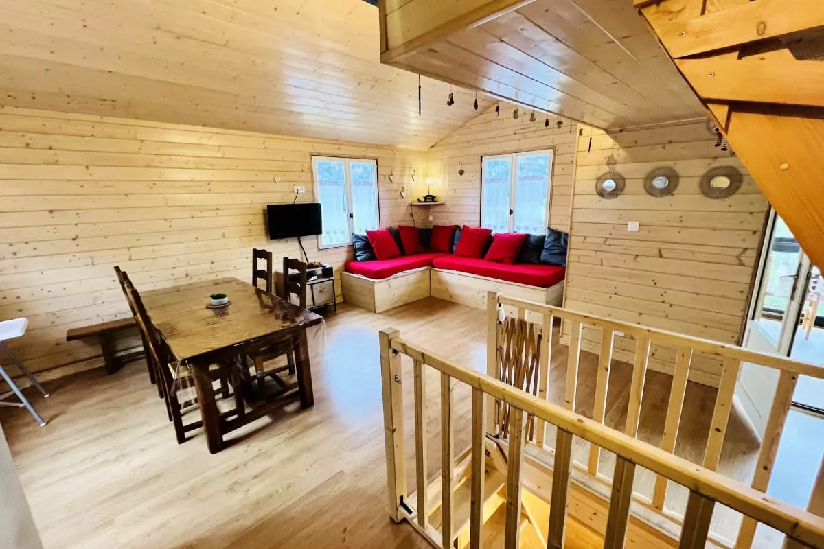 In this charming little chalet, you'll find a bedroom with a double bed, ideal for a comfortable rest. A bunk bed is also available, offering two single beds to accommodate more people. The living room features an open mezzanine, accessible via a staircase, where you'll find a double bed for additional sleeping space.