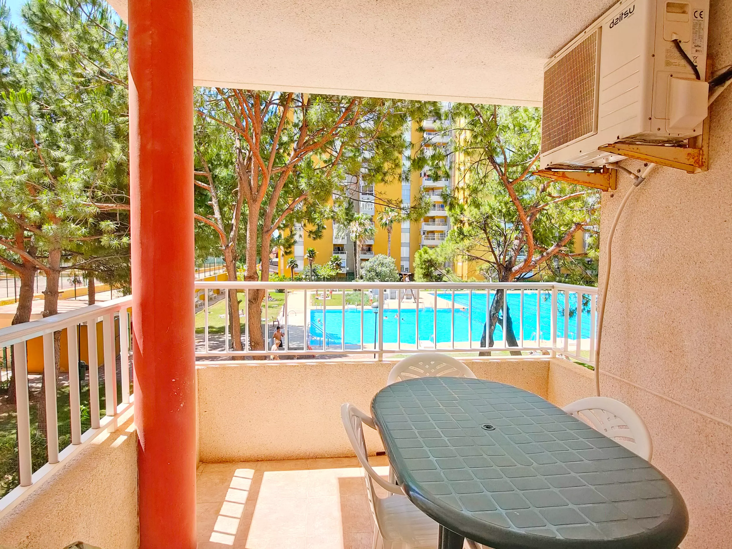 The 2-bedroom, 1-bathroom apartment features a convenient terrace with pool views.