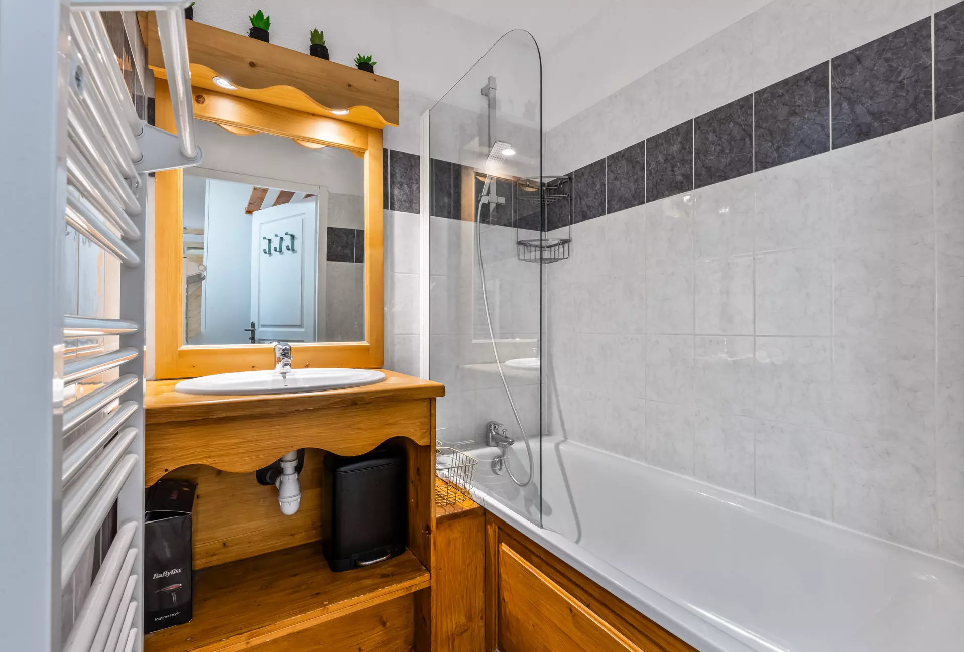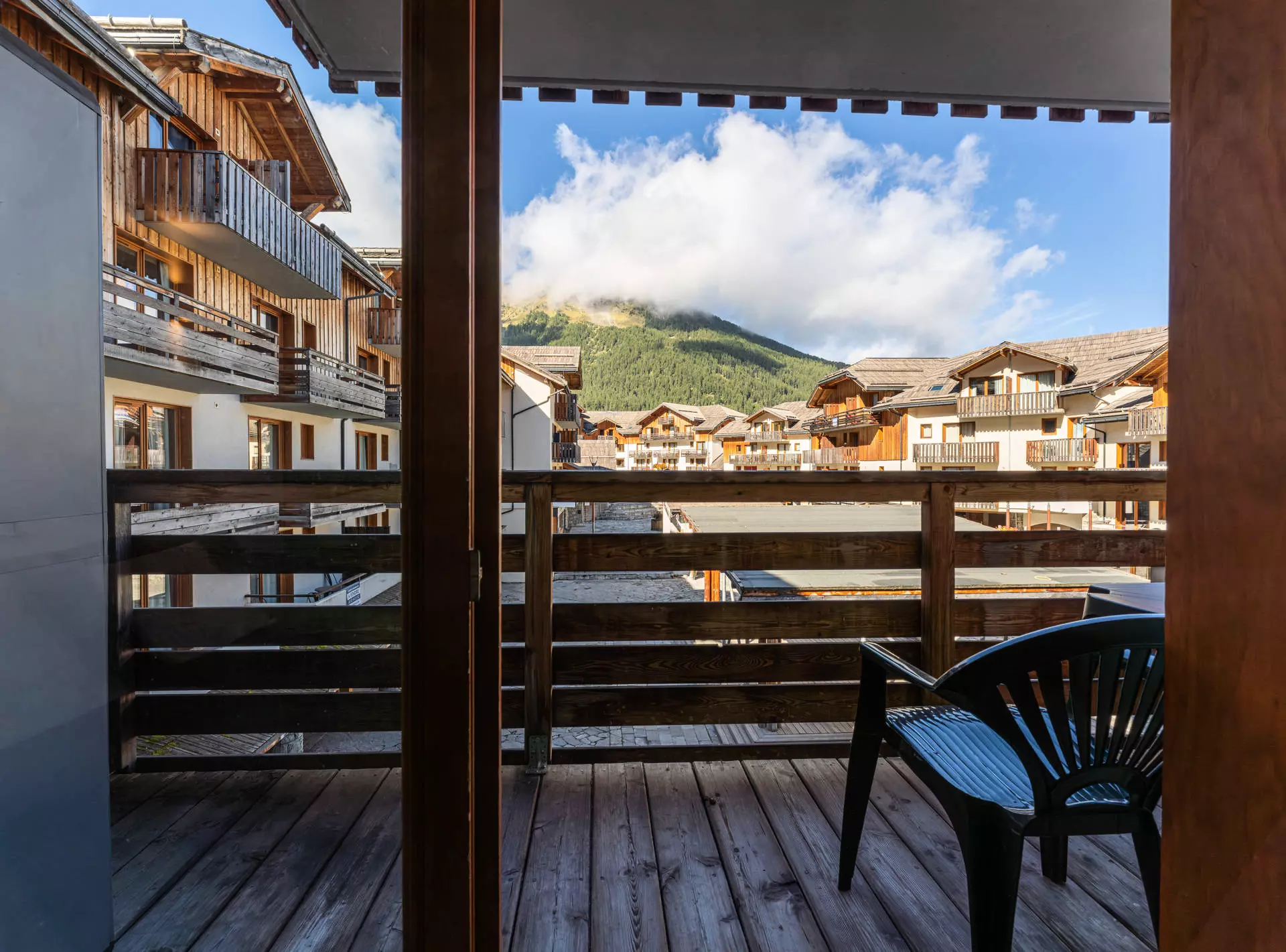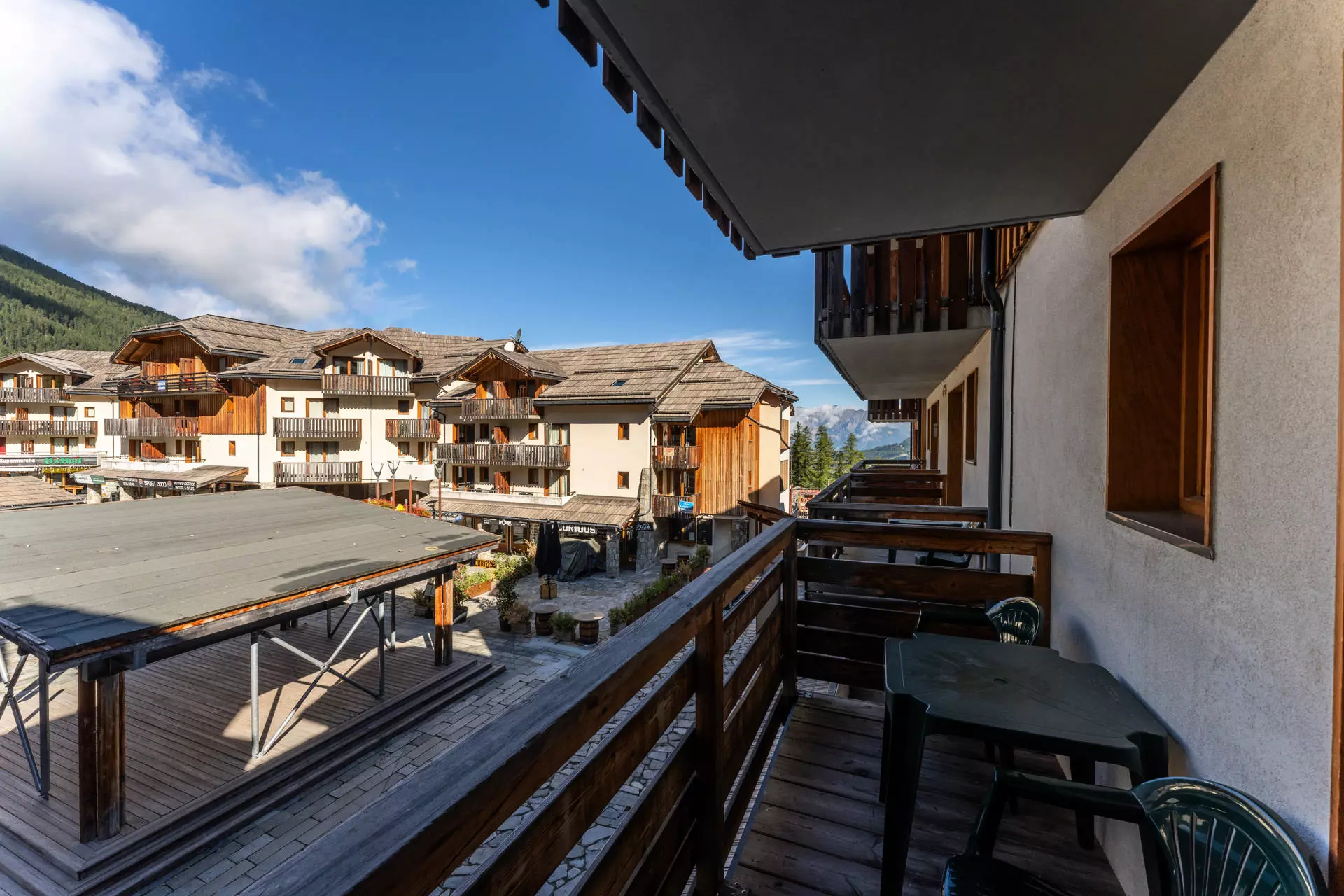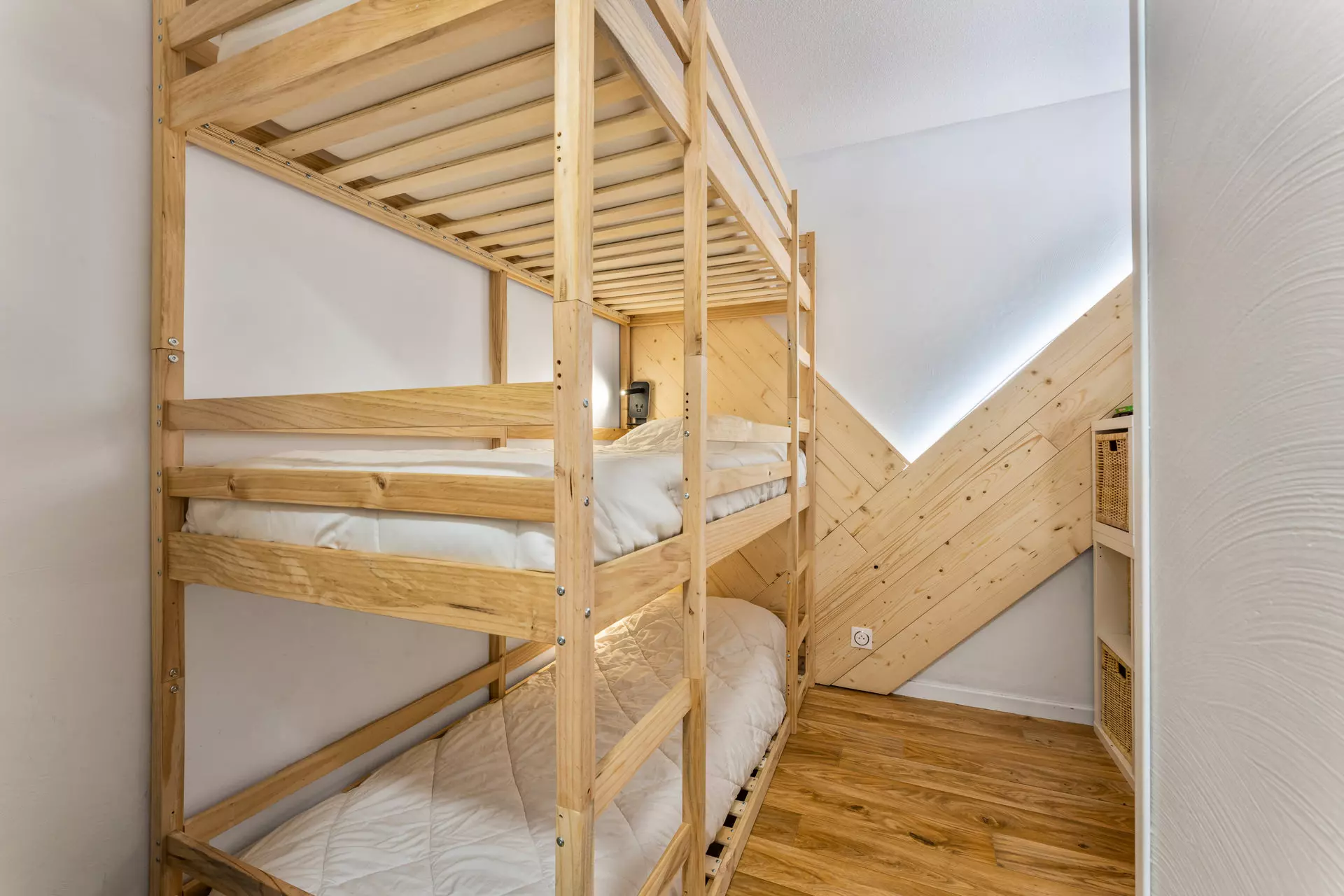 It has a living room with a lounge equipped with a pull-out sofa bed and a television, a fully equipped kitchen (dishwasher, microwave, filter coffee maker, kettle, toaster, etc.) and a dining area for 6 guests at the table; all opening onto a furnished balcony facing west, offering a view of the shopping square and the surrounding mountains.