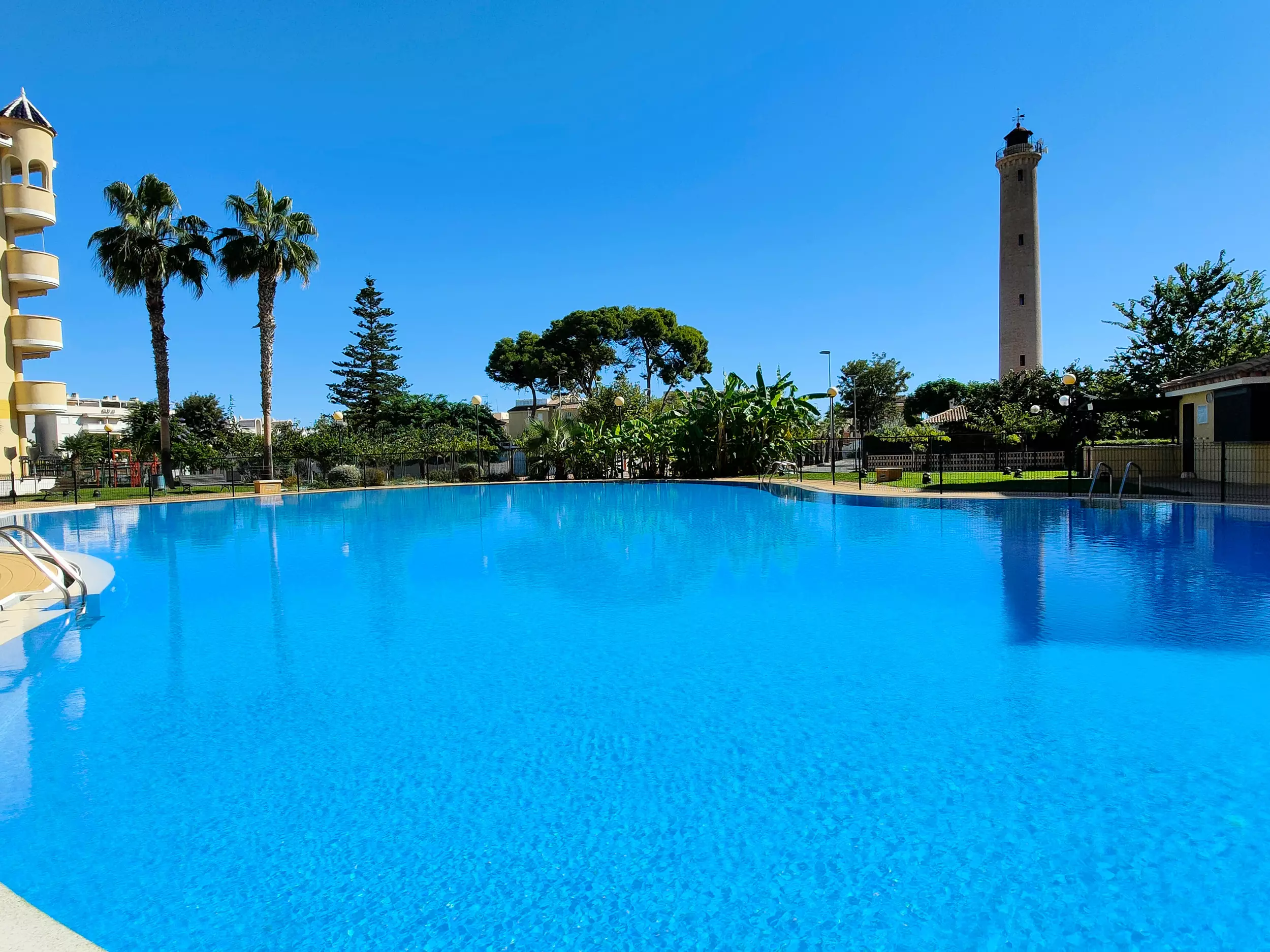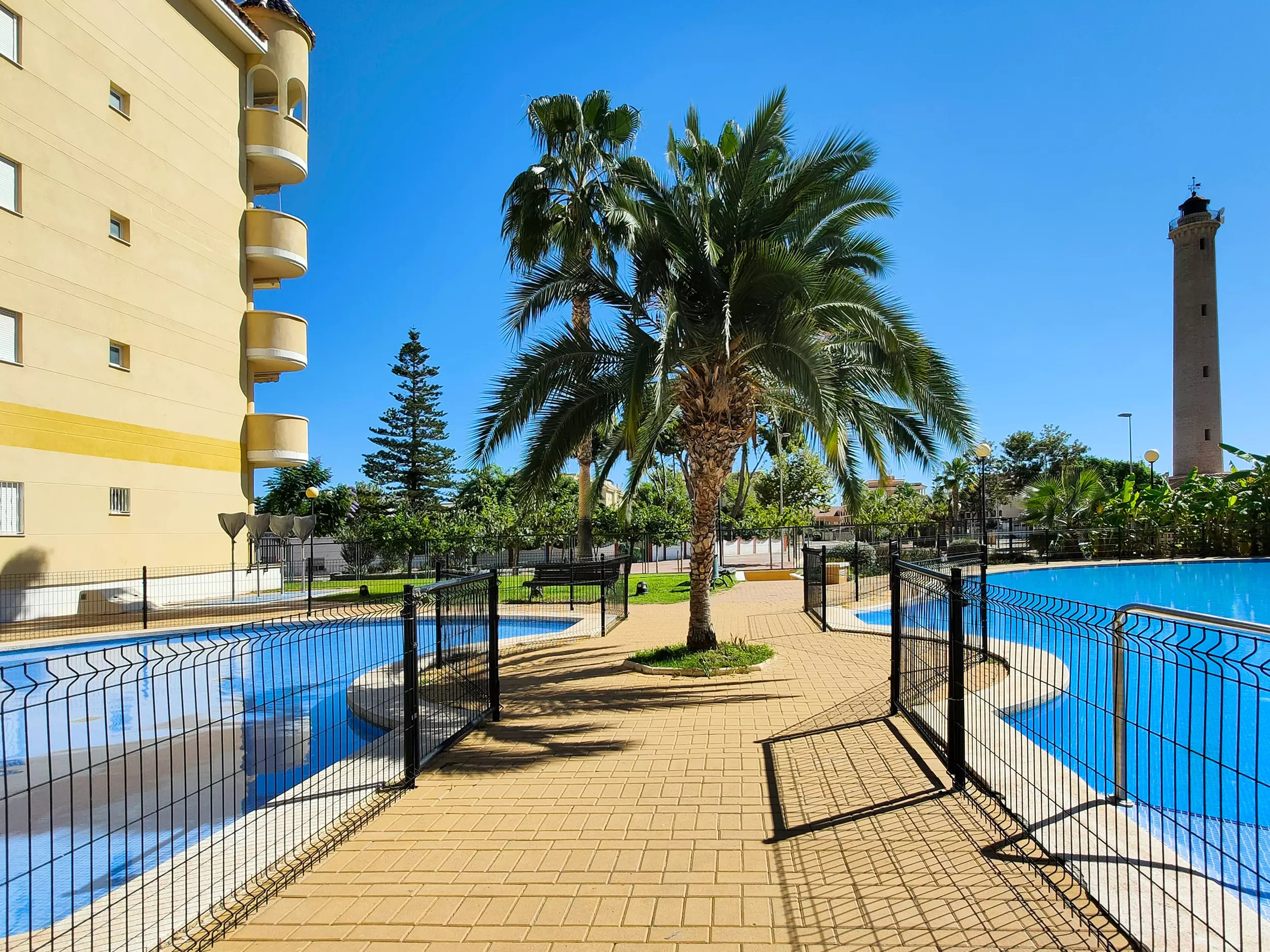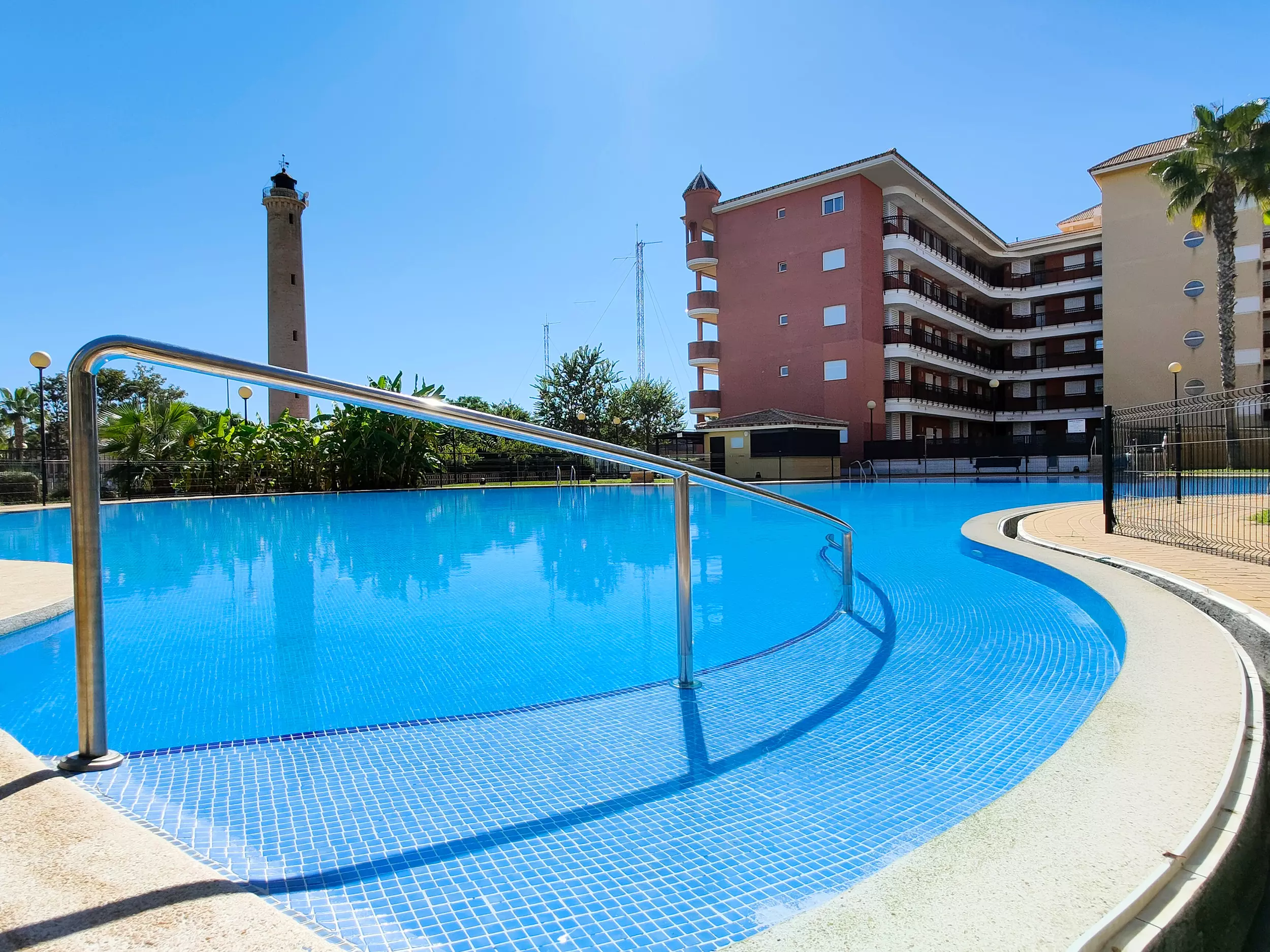It has a lift, garden furniture, washing machine, iron, internet access (wifi), hair dryer, balcony, heat pump heating, air conditioning throughout the accommodation, communal swimming pool + children's pool, garage in the same building, 1 TV, DVD.