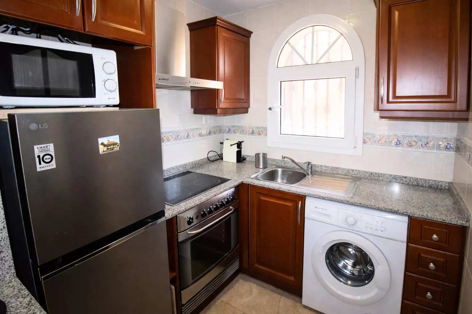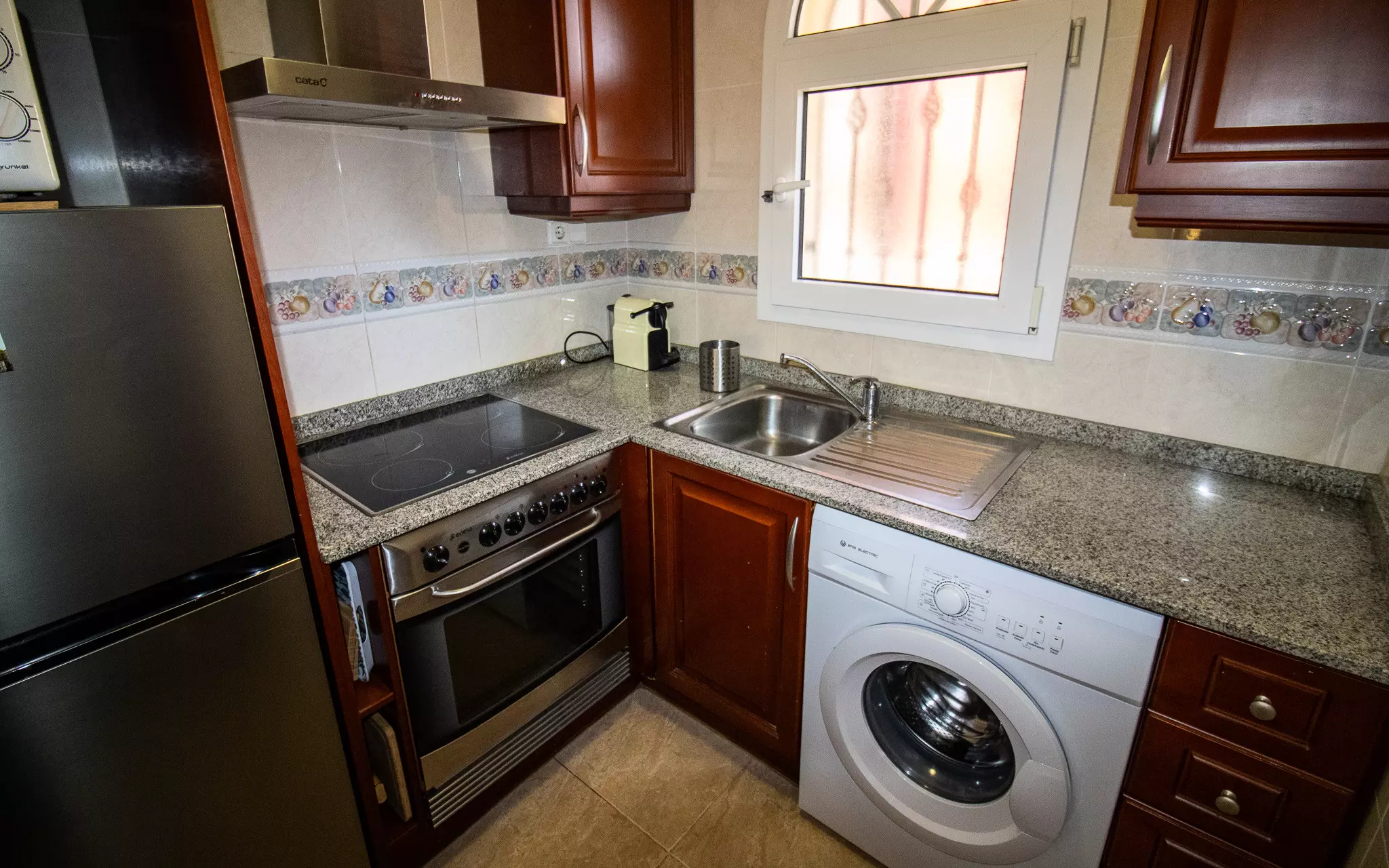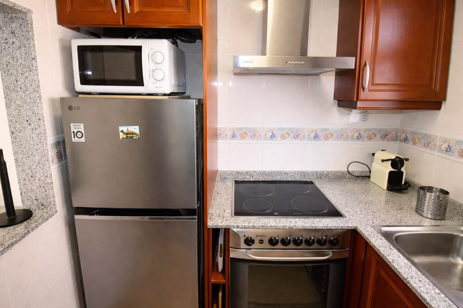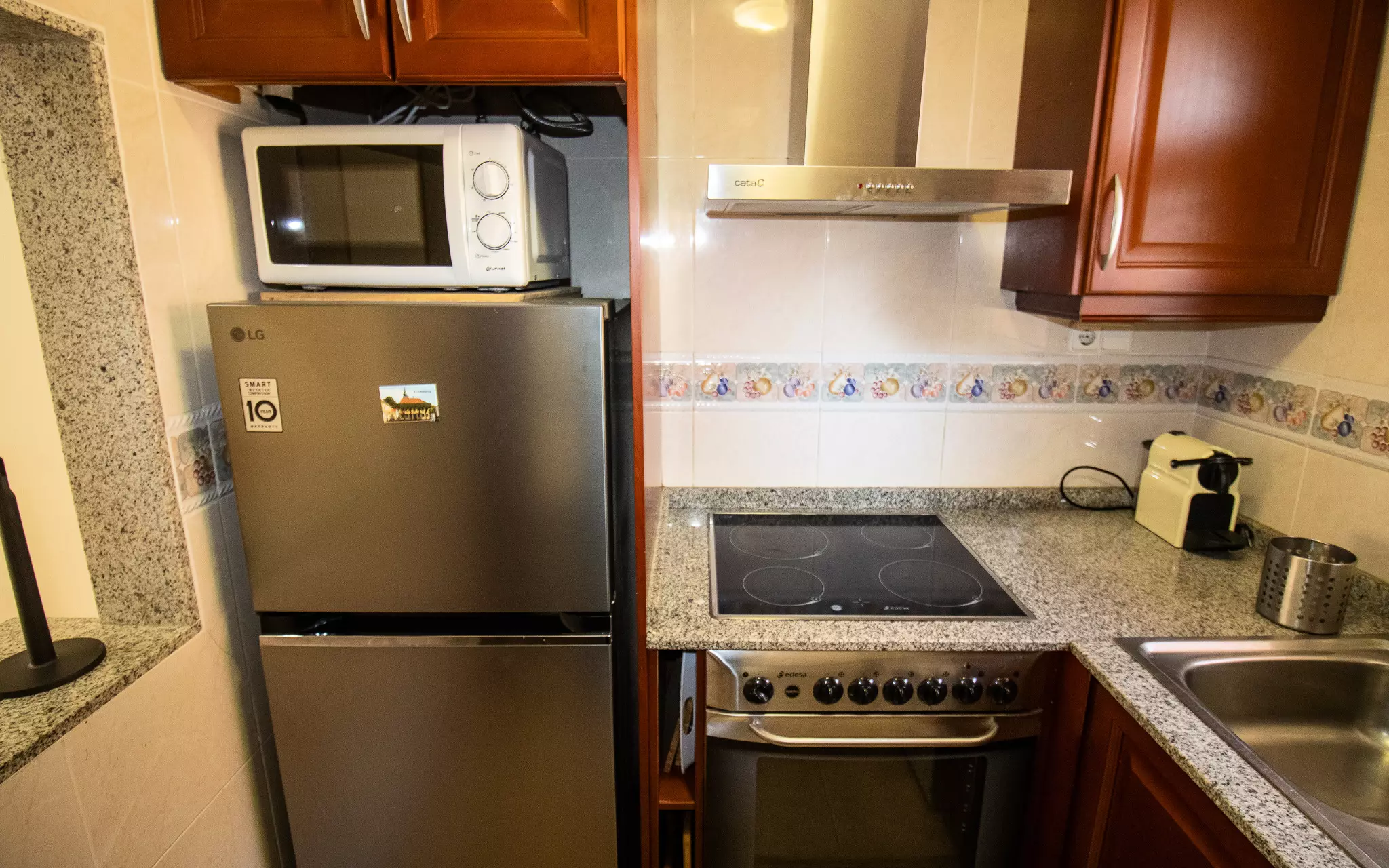 The open kitchen is fully equipped with a ceramic hob, fridge, microwave, oven, freezer and everything you need to prepare delicious meals at home, including crockery and cutlery, coffee machine and toaster.