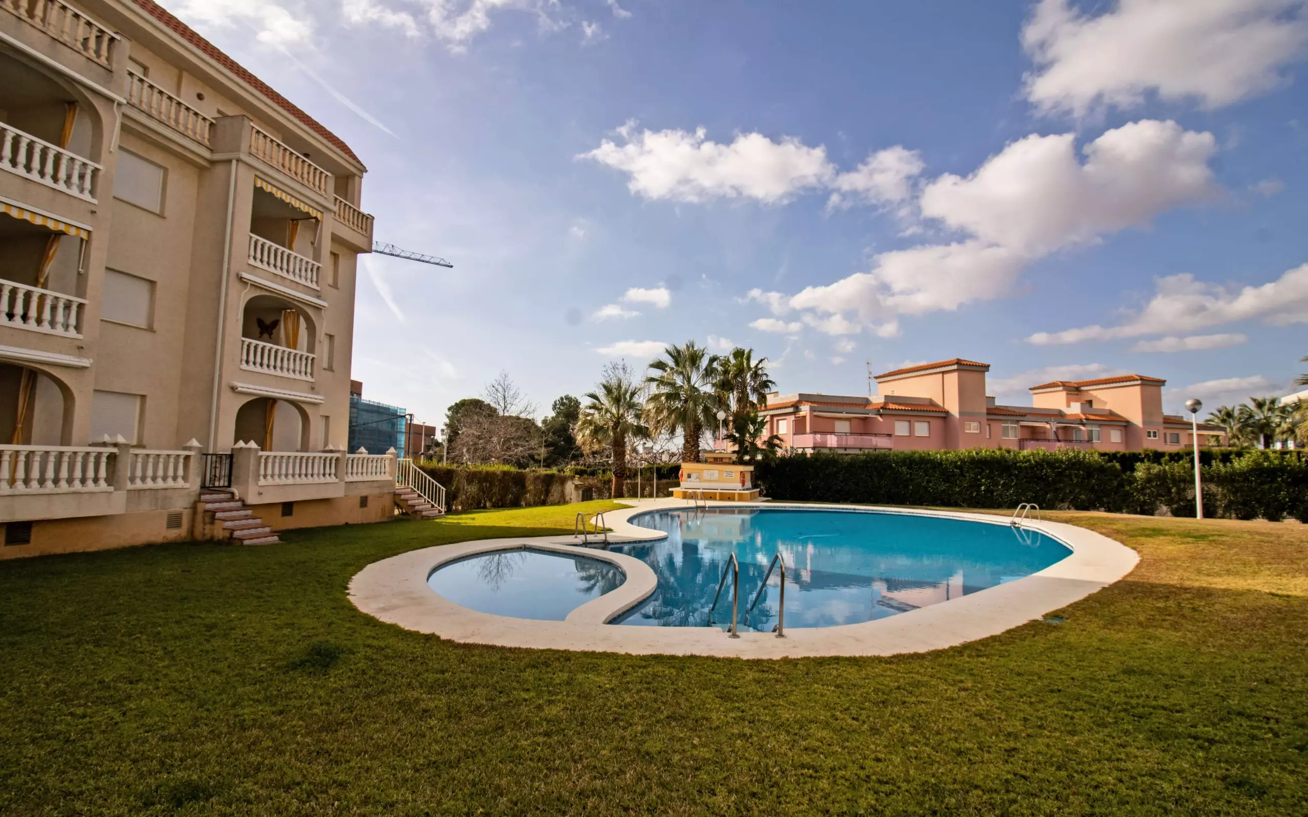 It has an elevator, terrace, washing machine, internet access (wifi), heat pump heating, air conditioning throughout, communal swimming pool + children's pool, outdoor parking in the same building, 1 TV.
