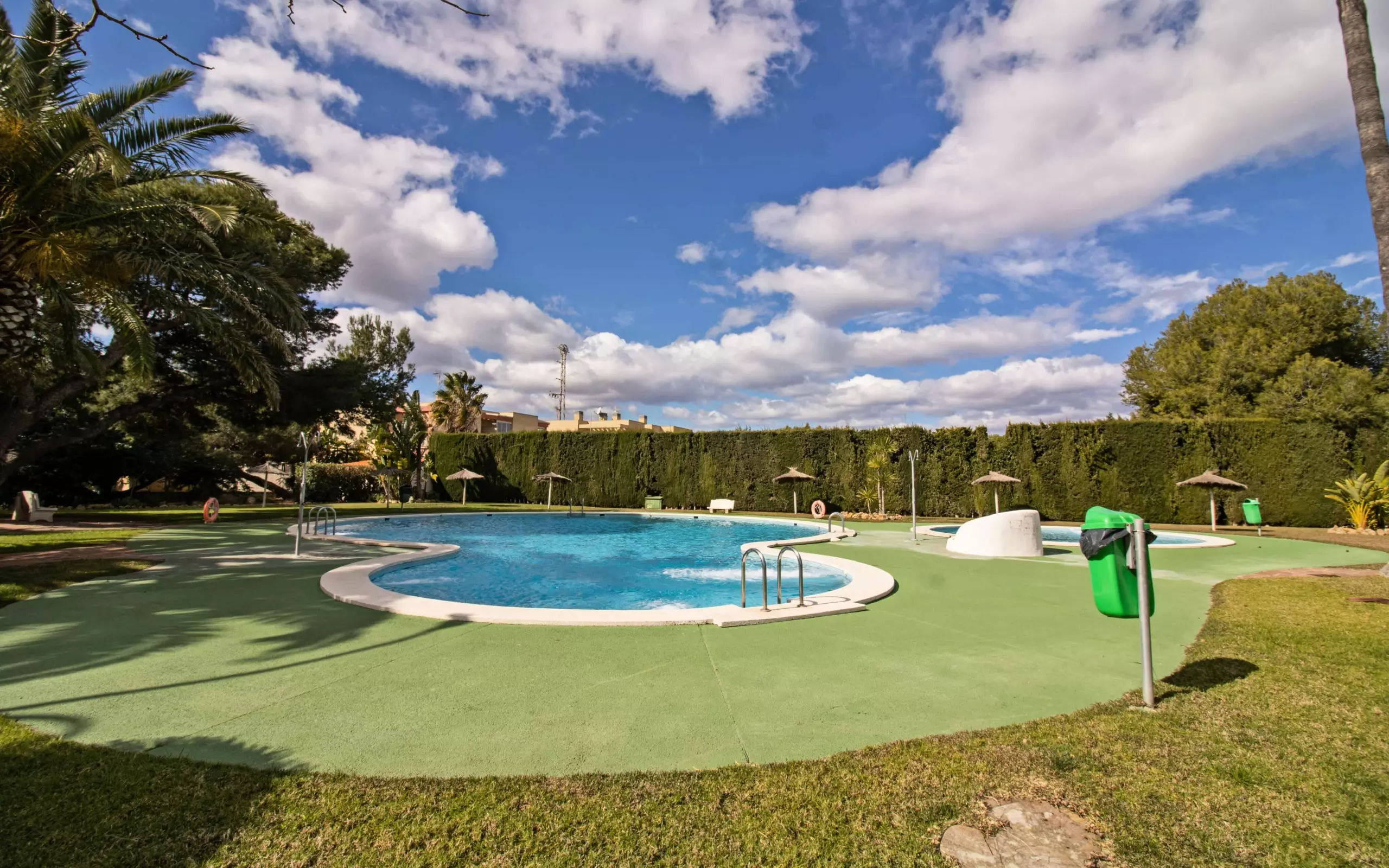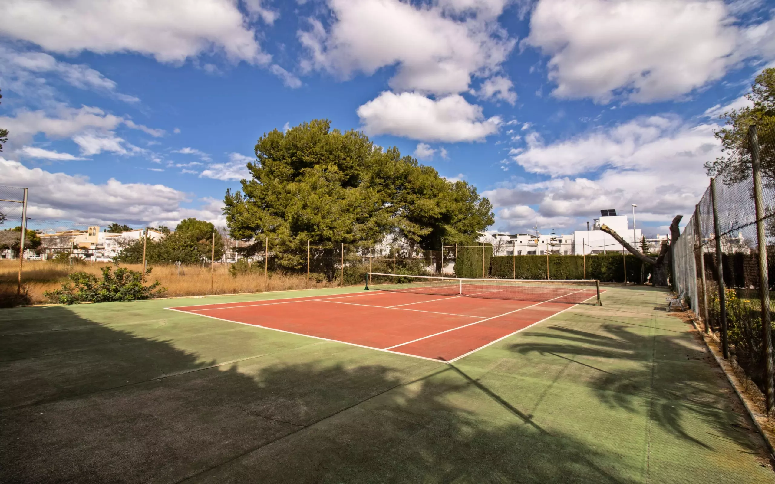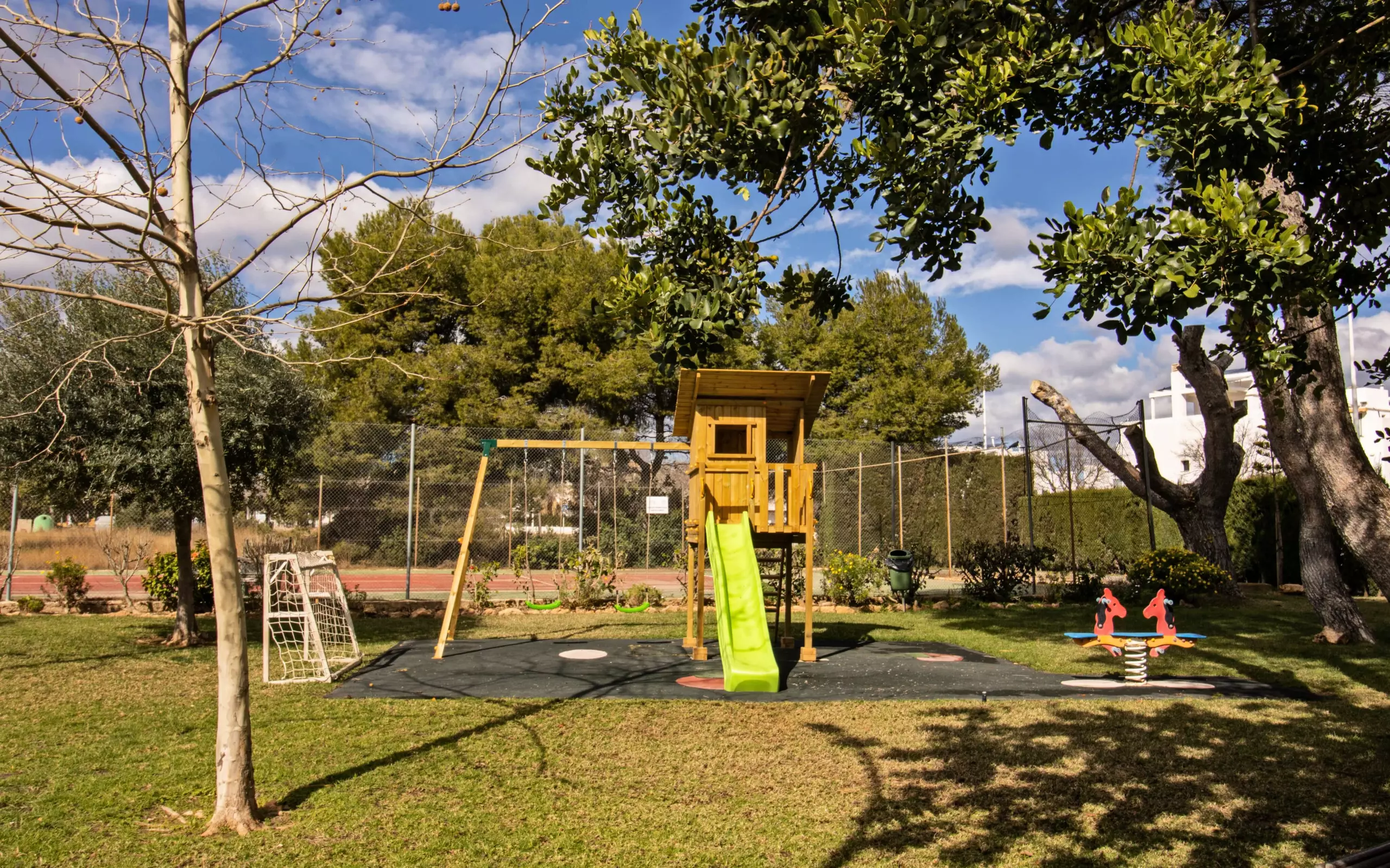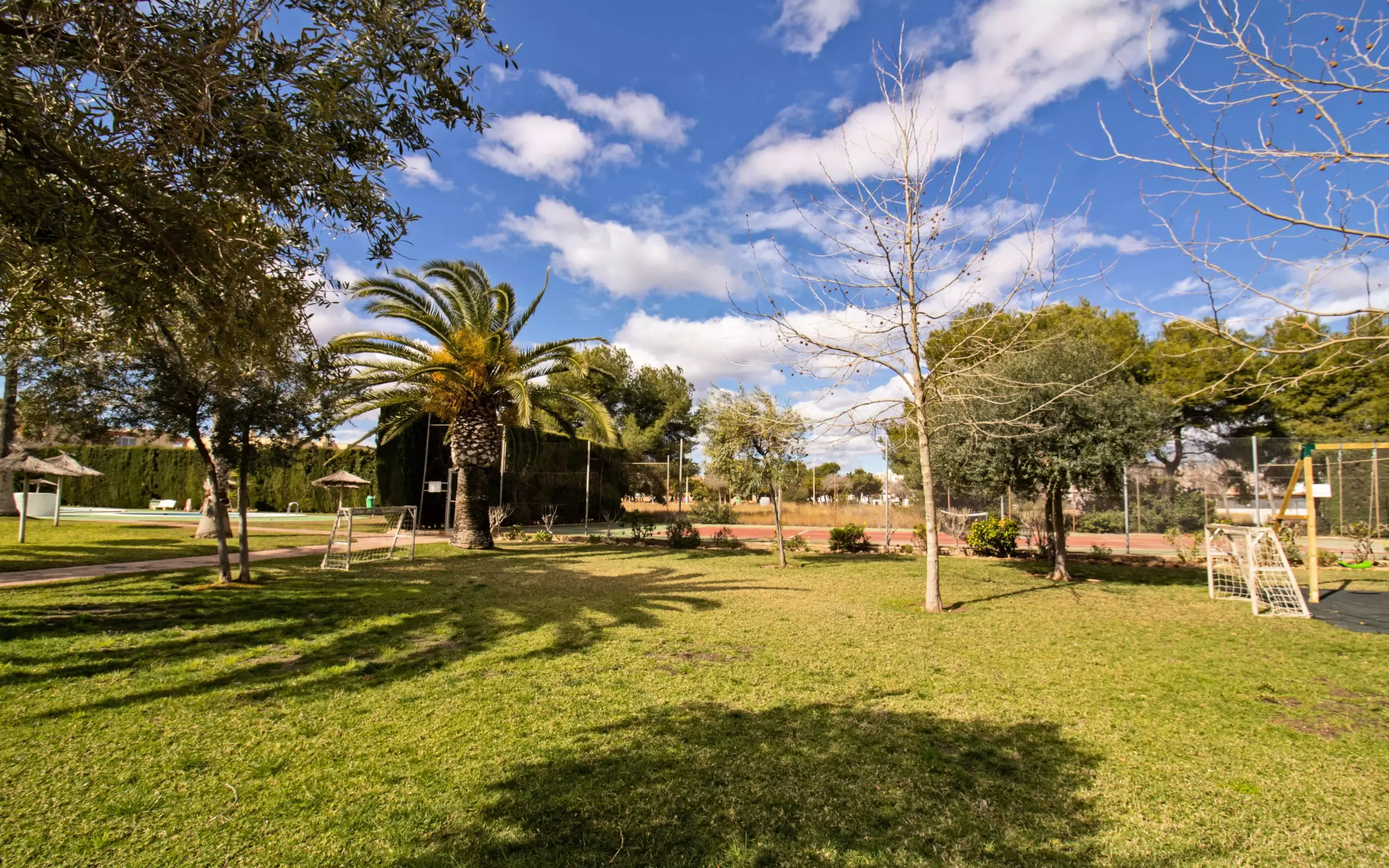 It has a garden, garden furniture, 20 m² terrace, washing machine, barbecue, internet access (wifi), tennis court, heat pump heating, air conditioning in the living room and some bedrooms, communal swimming pool + children's pool, outdoor parking in the same building, 5 fans, TV.