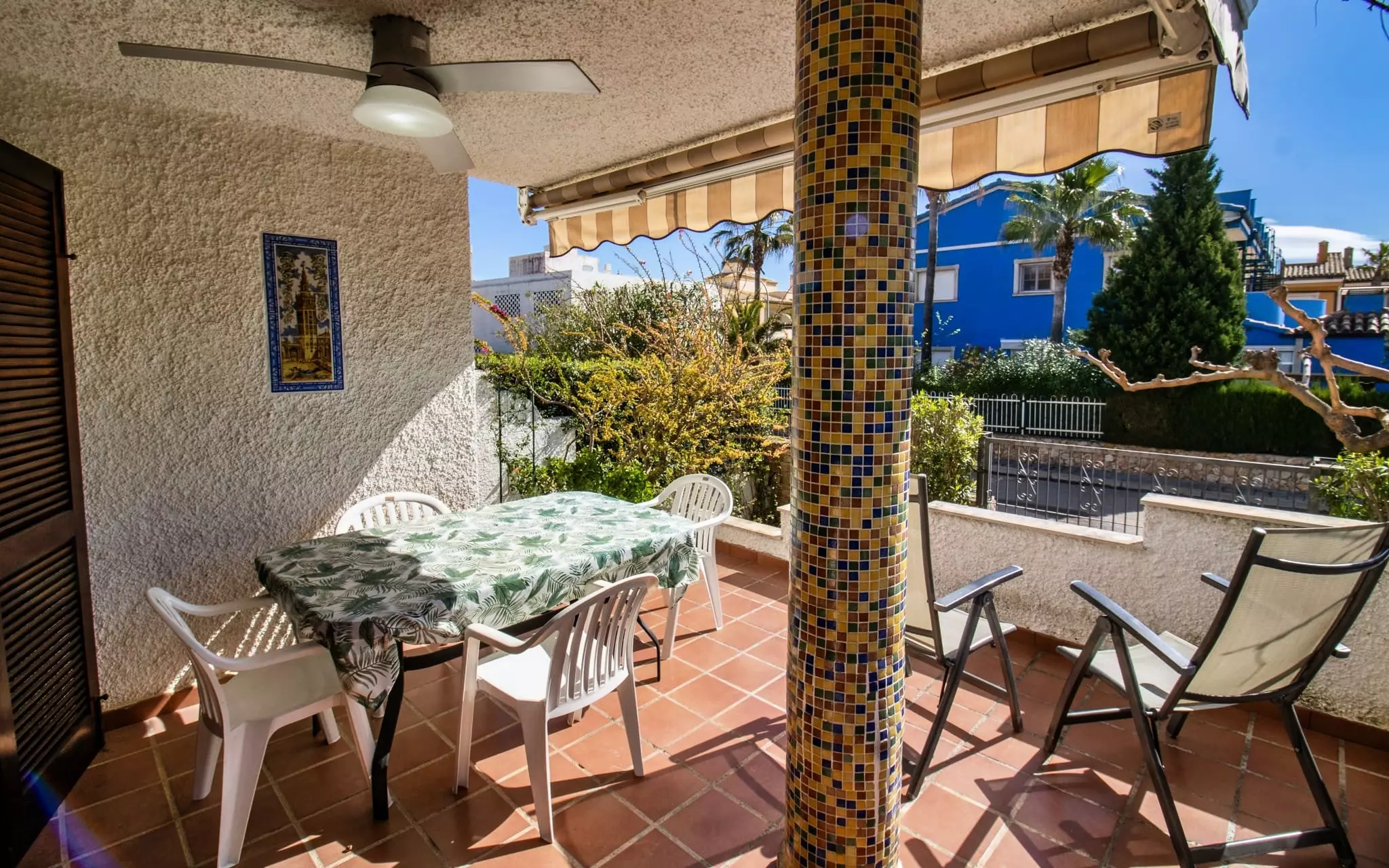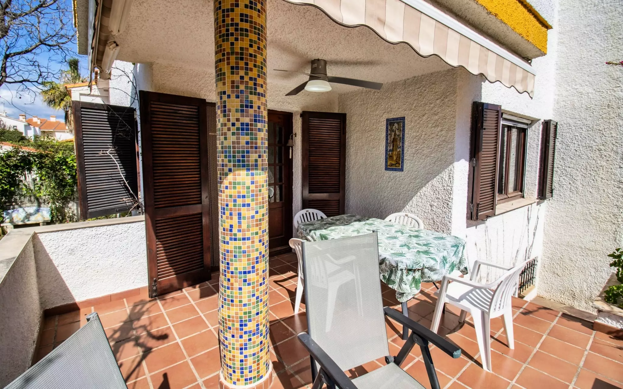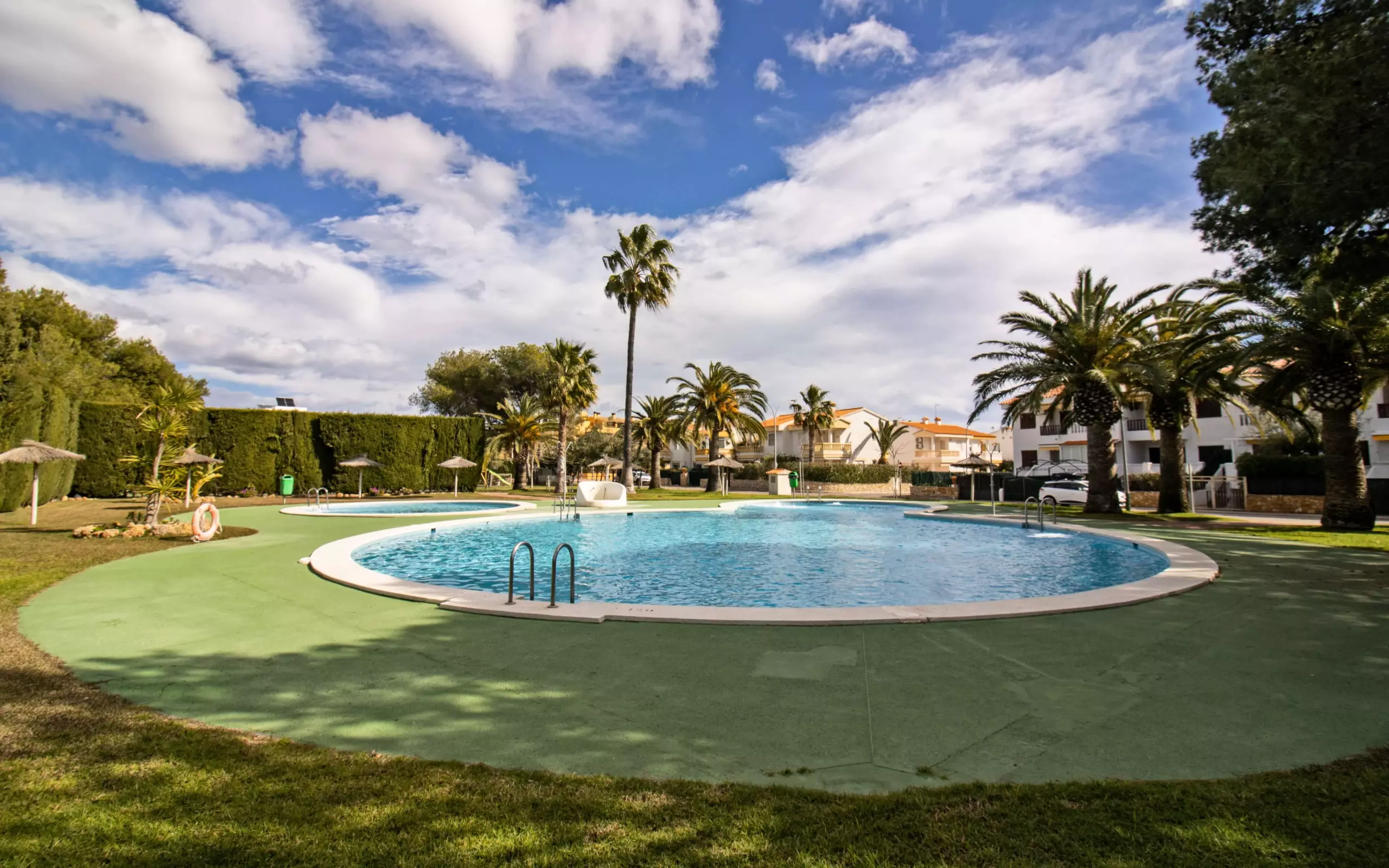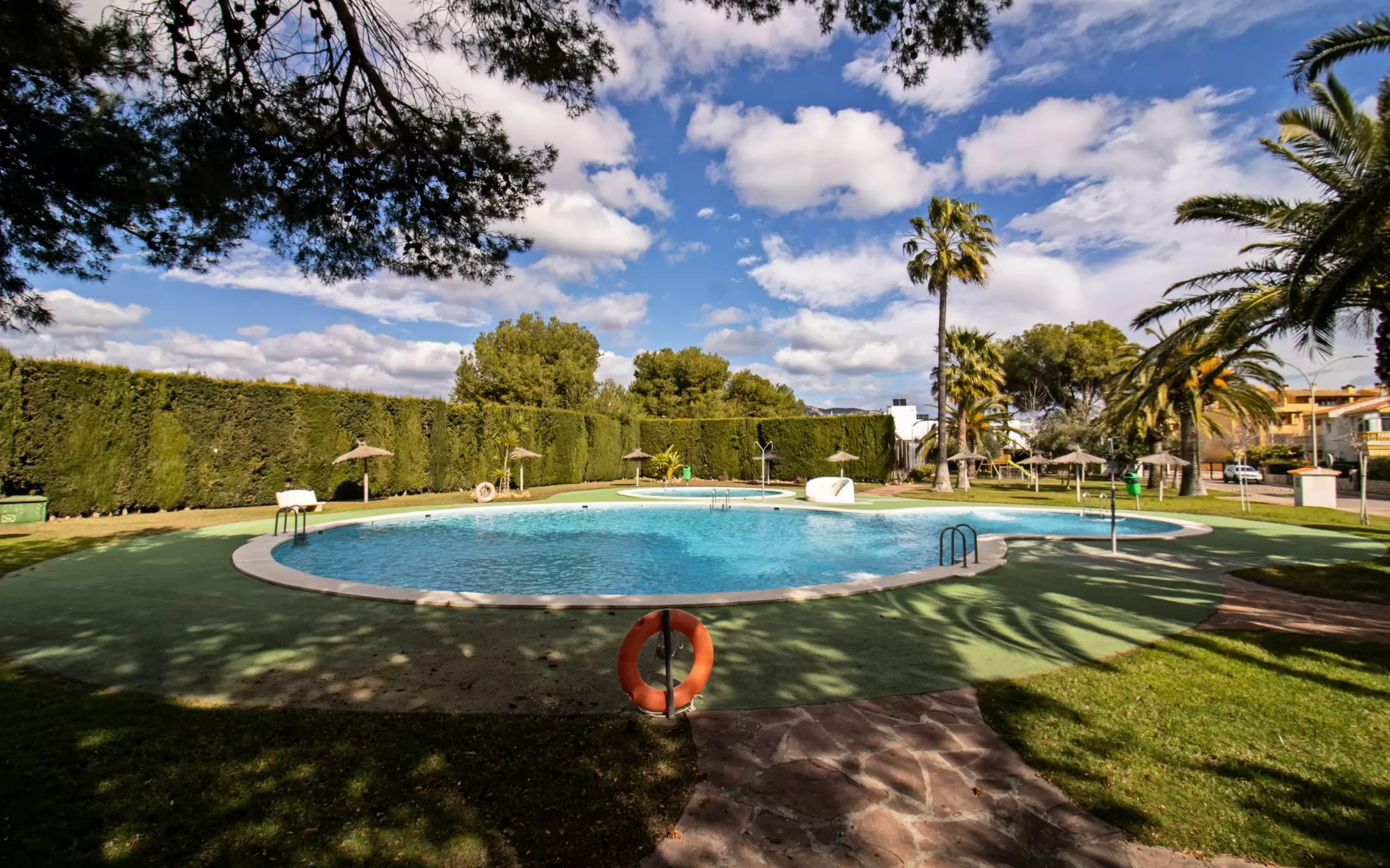 It has a garden, garden furniture, 20 m² terrace, washing machine, barbecue, internet access (wifi), tennis court, heat pump heating, air conditioning in the living room and some bedrooms, communal swimming pool + children's pool, outdoor parking in the same building, 5 fans, TV.