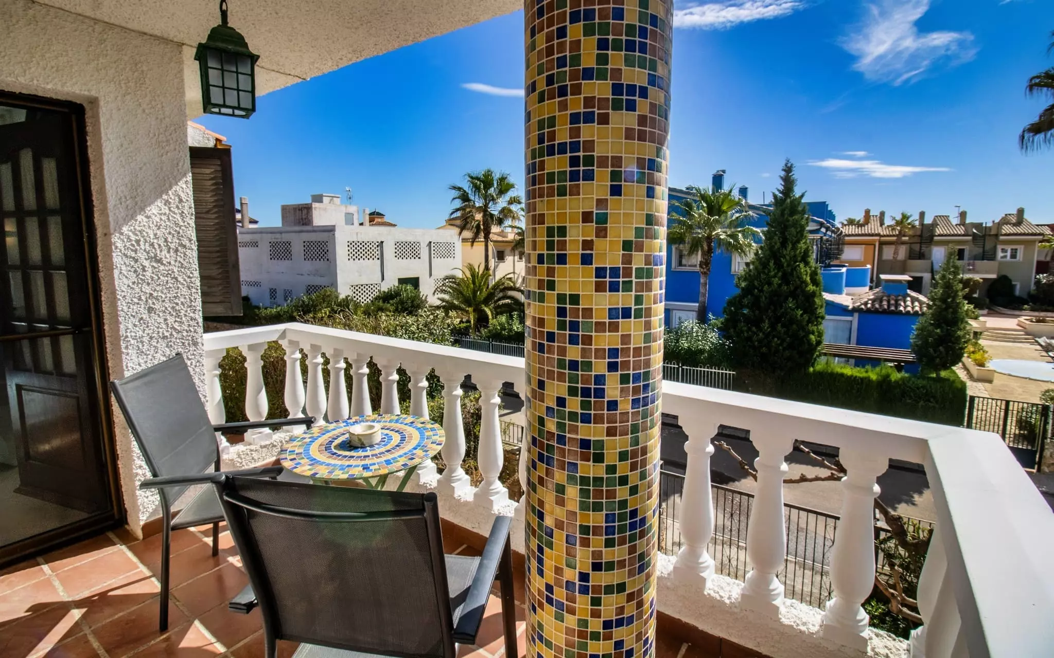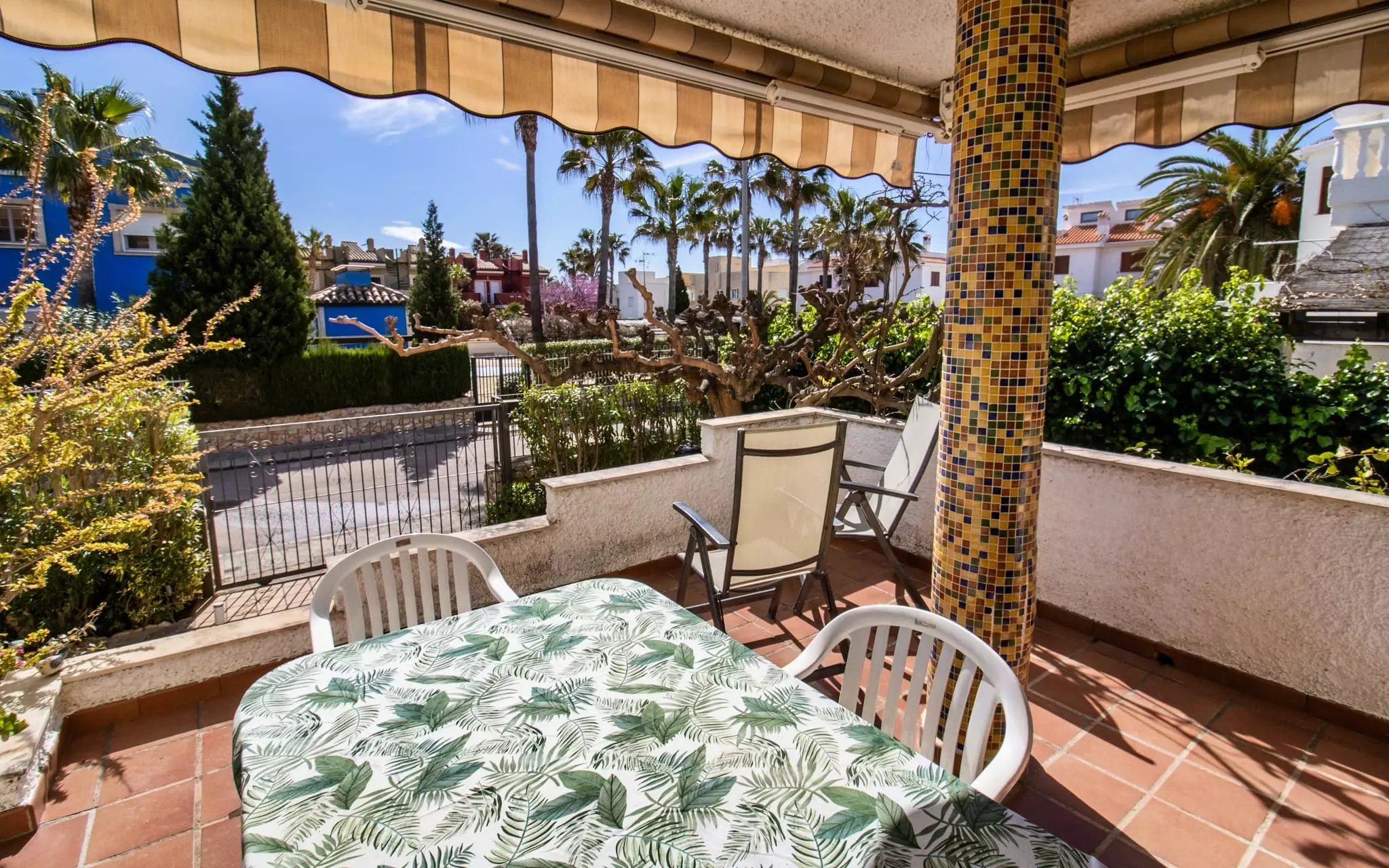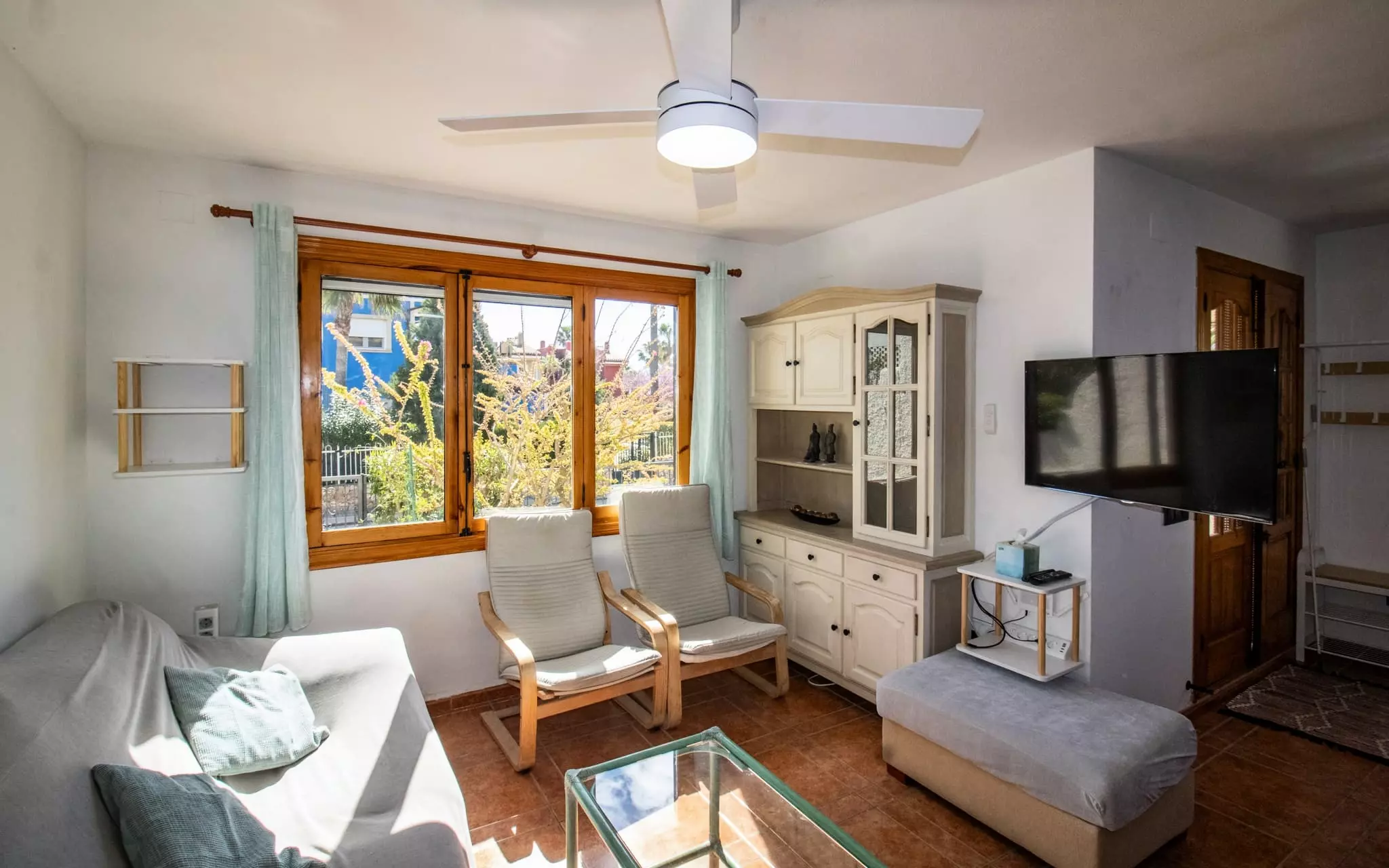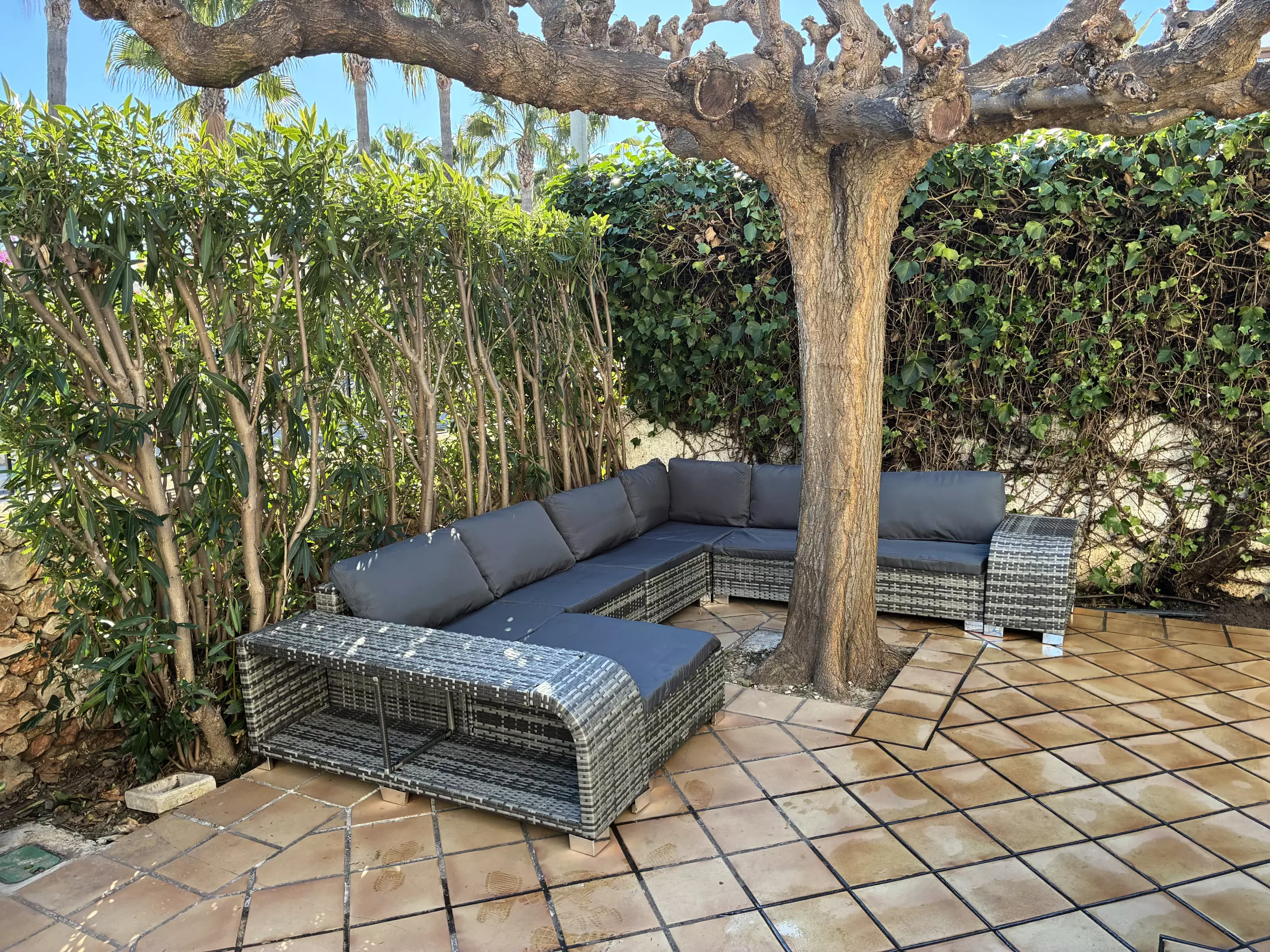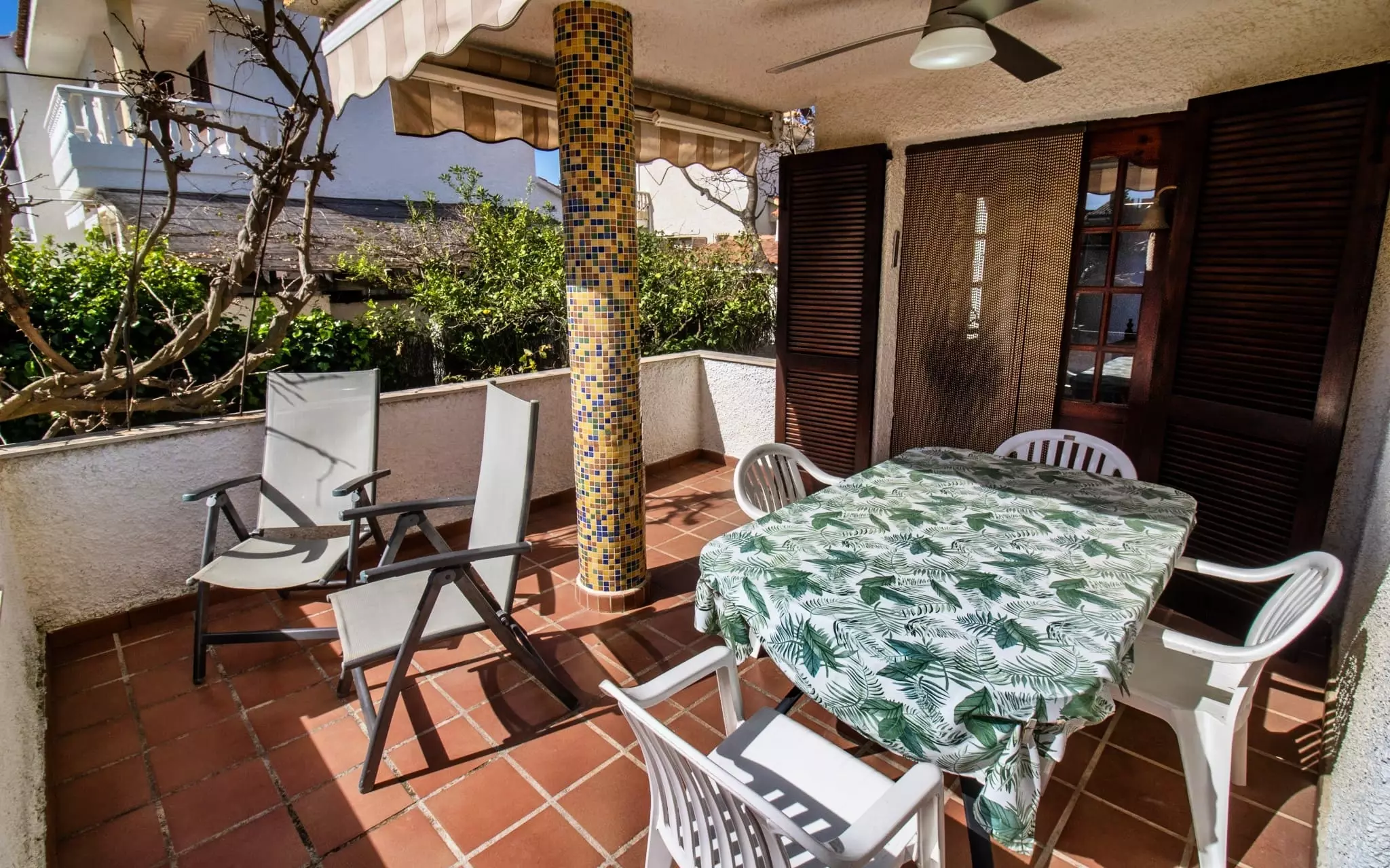 It has a garden, garden furniture, 20 m² terrace, washing machine, barbecue, internet access (wifi), tennis court, heat pump heating, air conditioning in the living room and some bedrooms, communal swimming pool + children's pool, outdoor parking in the same building, 5 fans, TV.
