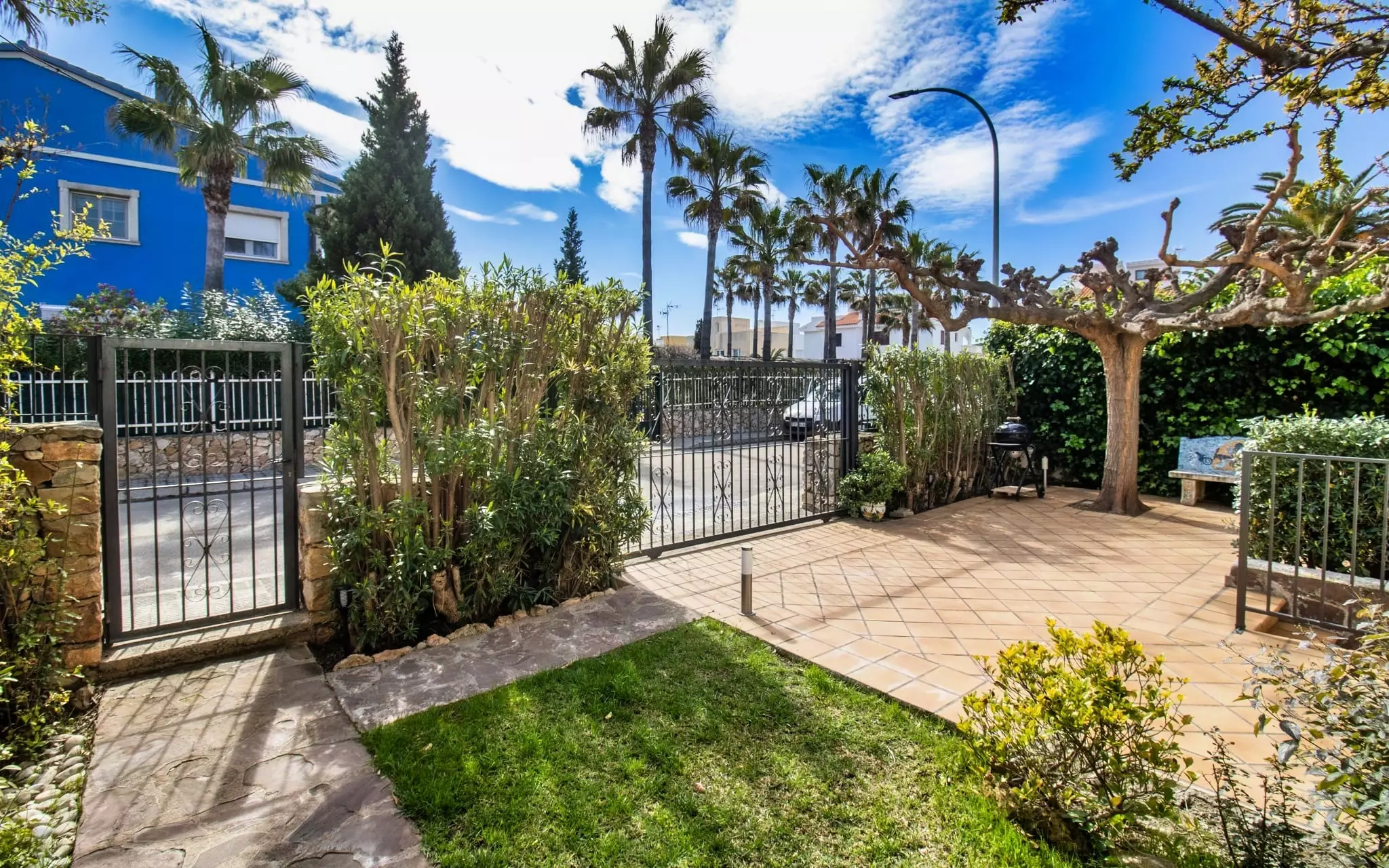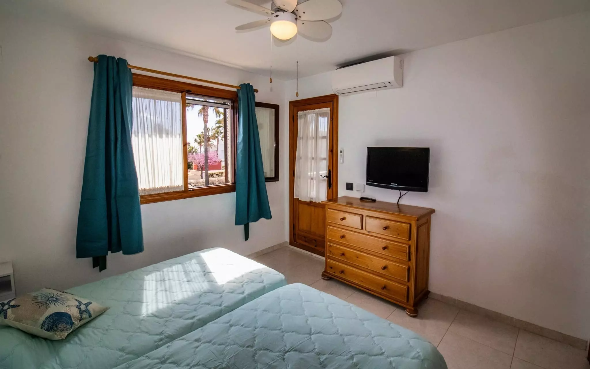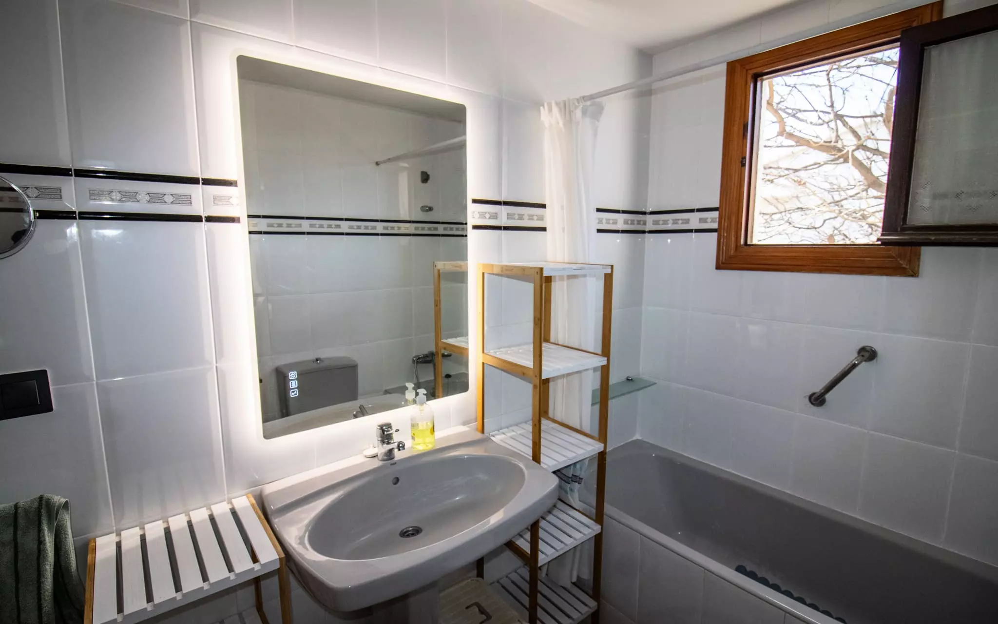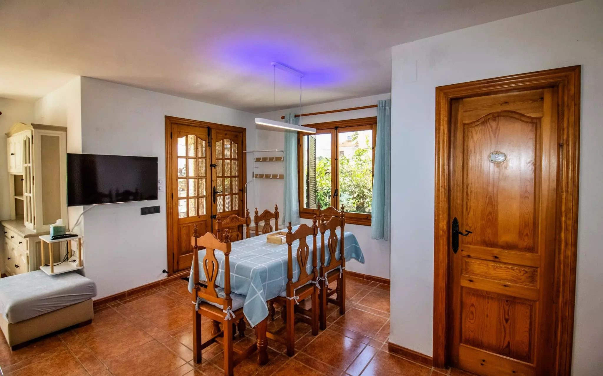 It has a garden, garden furniture, 20 m² terrace, washing machine, barbecue, internet access (wifi), tennis court, heat pump heating, air conditioning in the living room and some bedrooms, communal swimming pool + children's pool, outdoor parking in the same building, 5 fans, TV.
