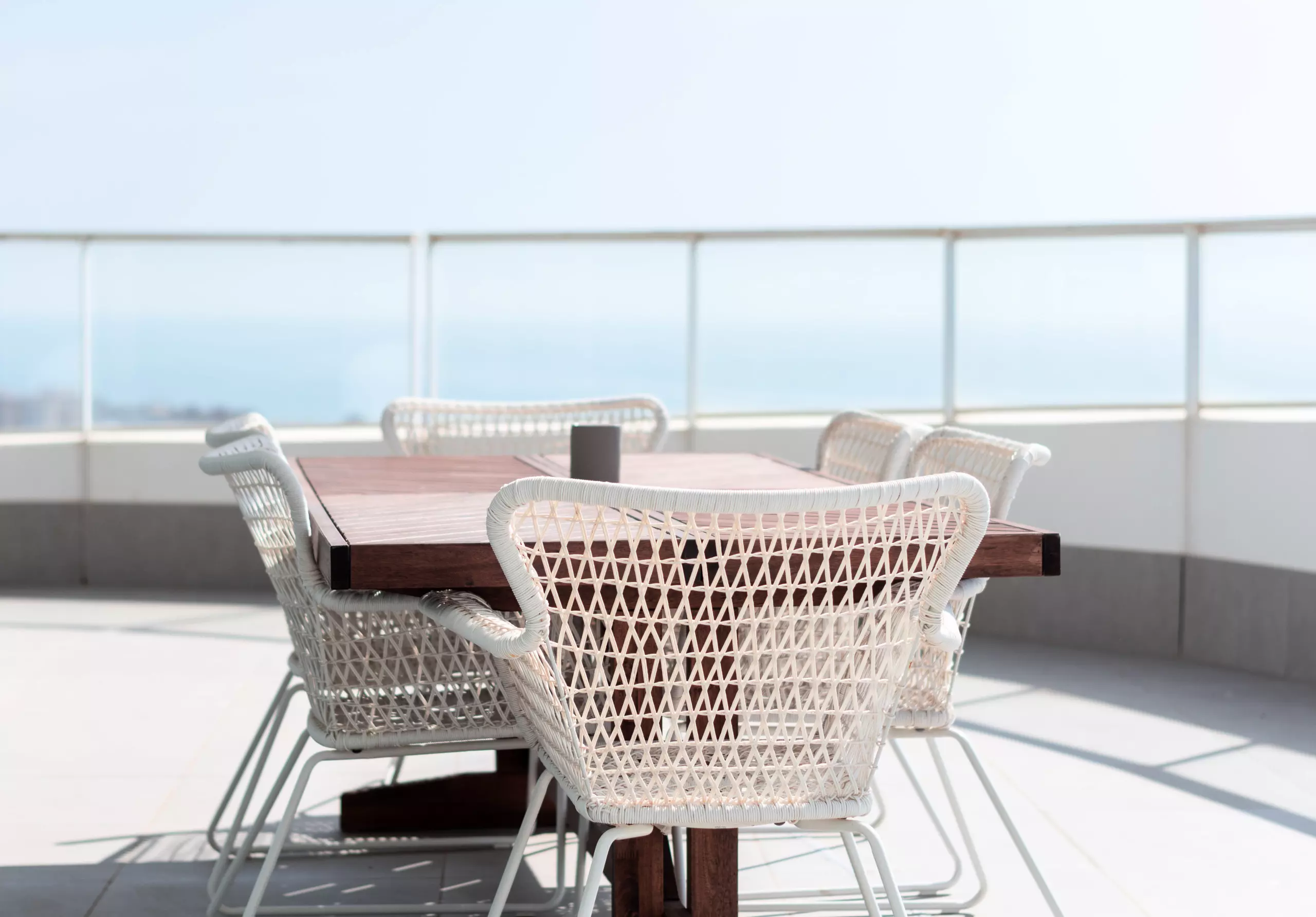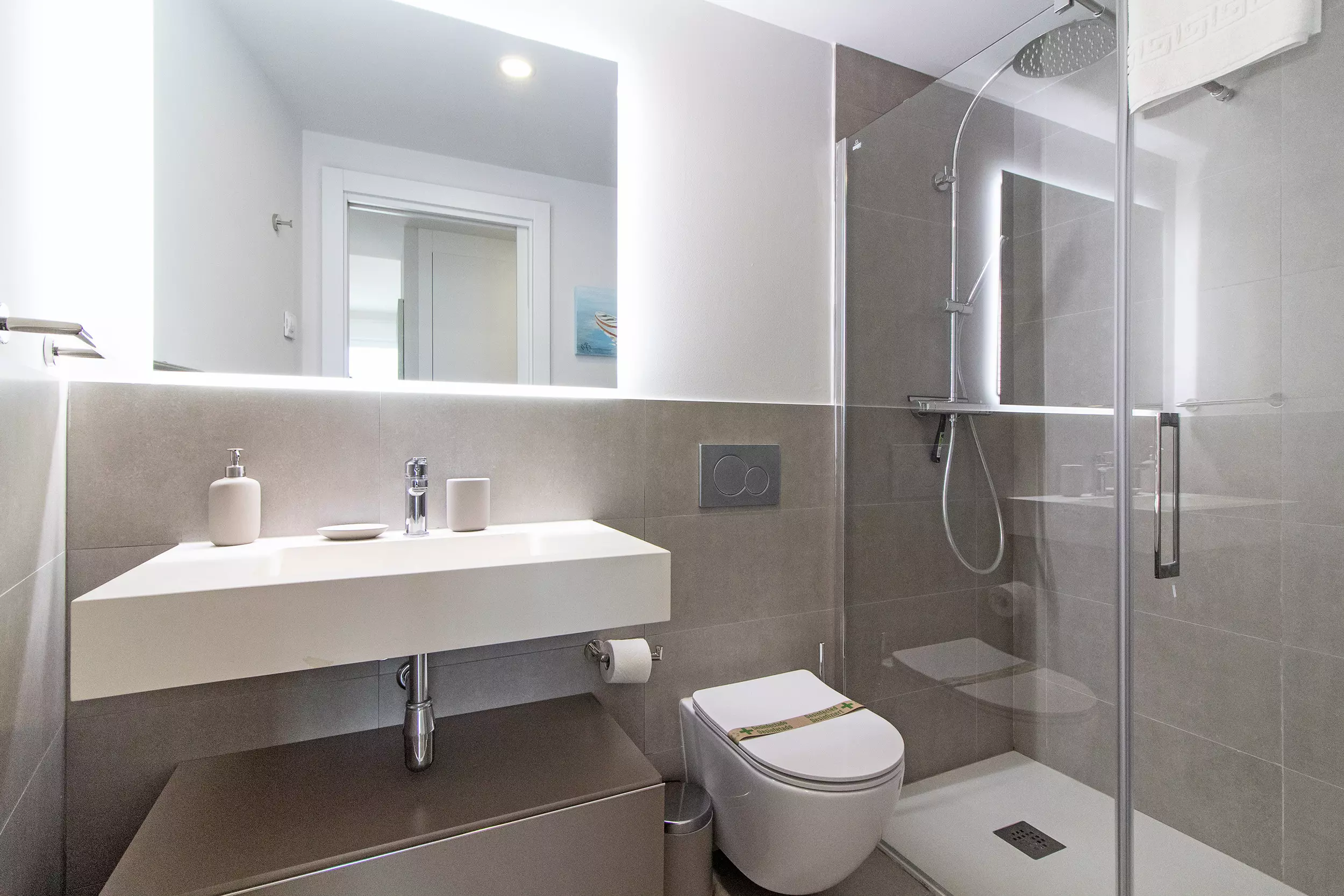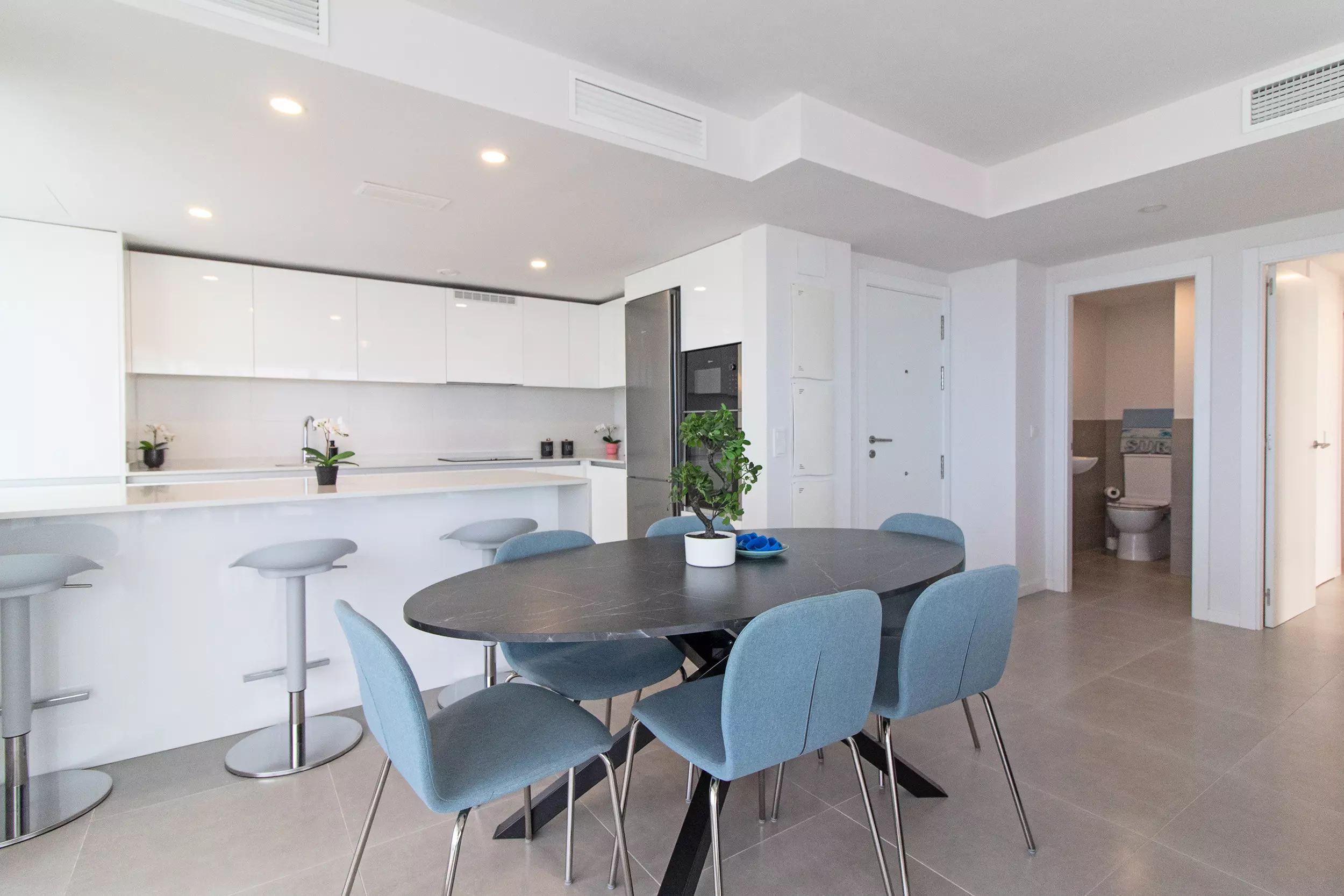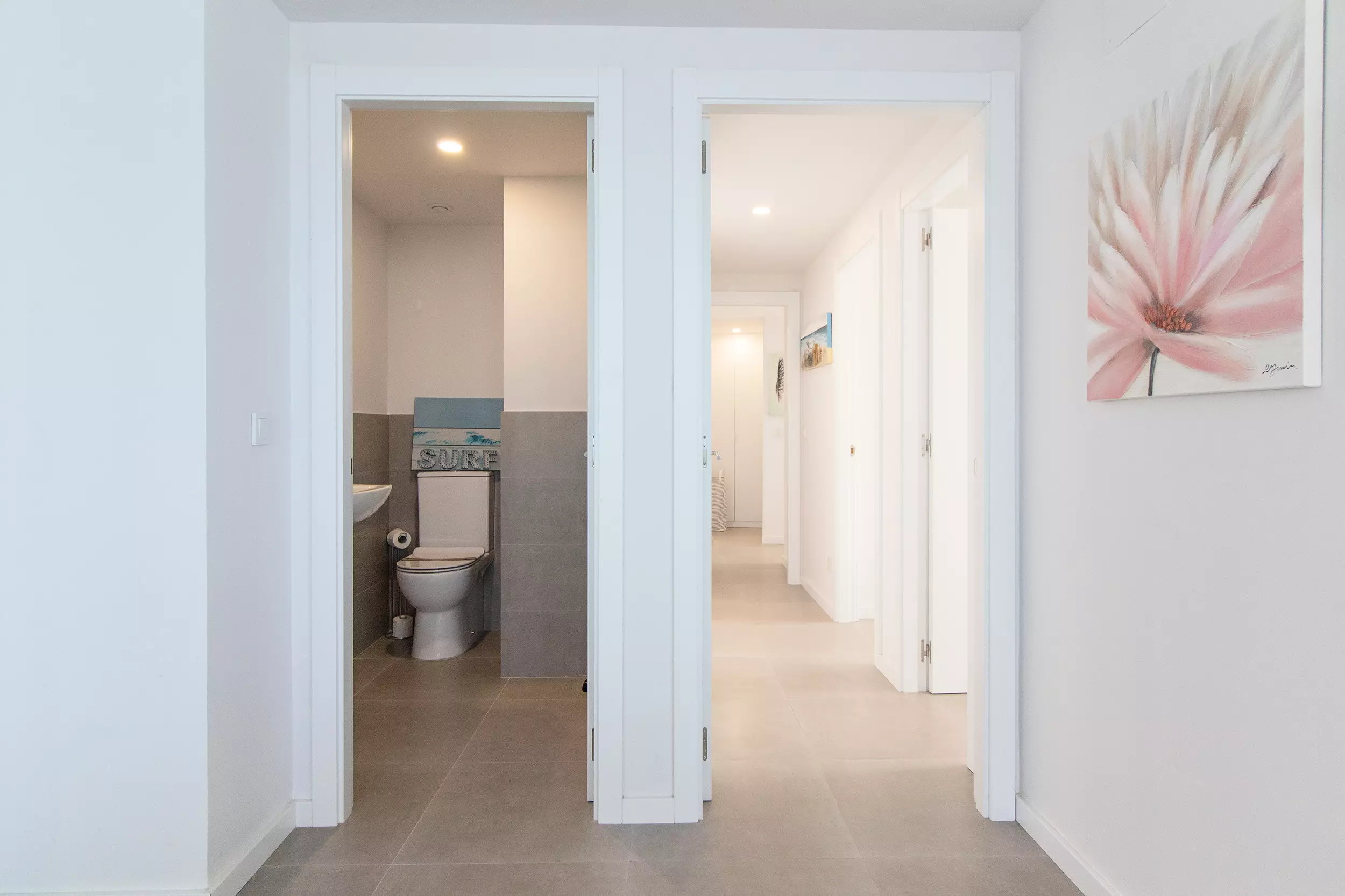 The apartment features 3 bedrooms, 2 bathrooms, and a guest toilet. It also includes a living room with large windows leading to the terrace. The terrace is fully equipped and is the perfect place to enjoy time with family or friends.