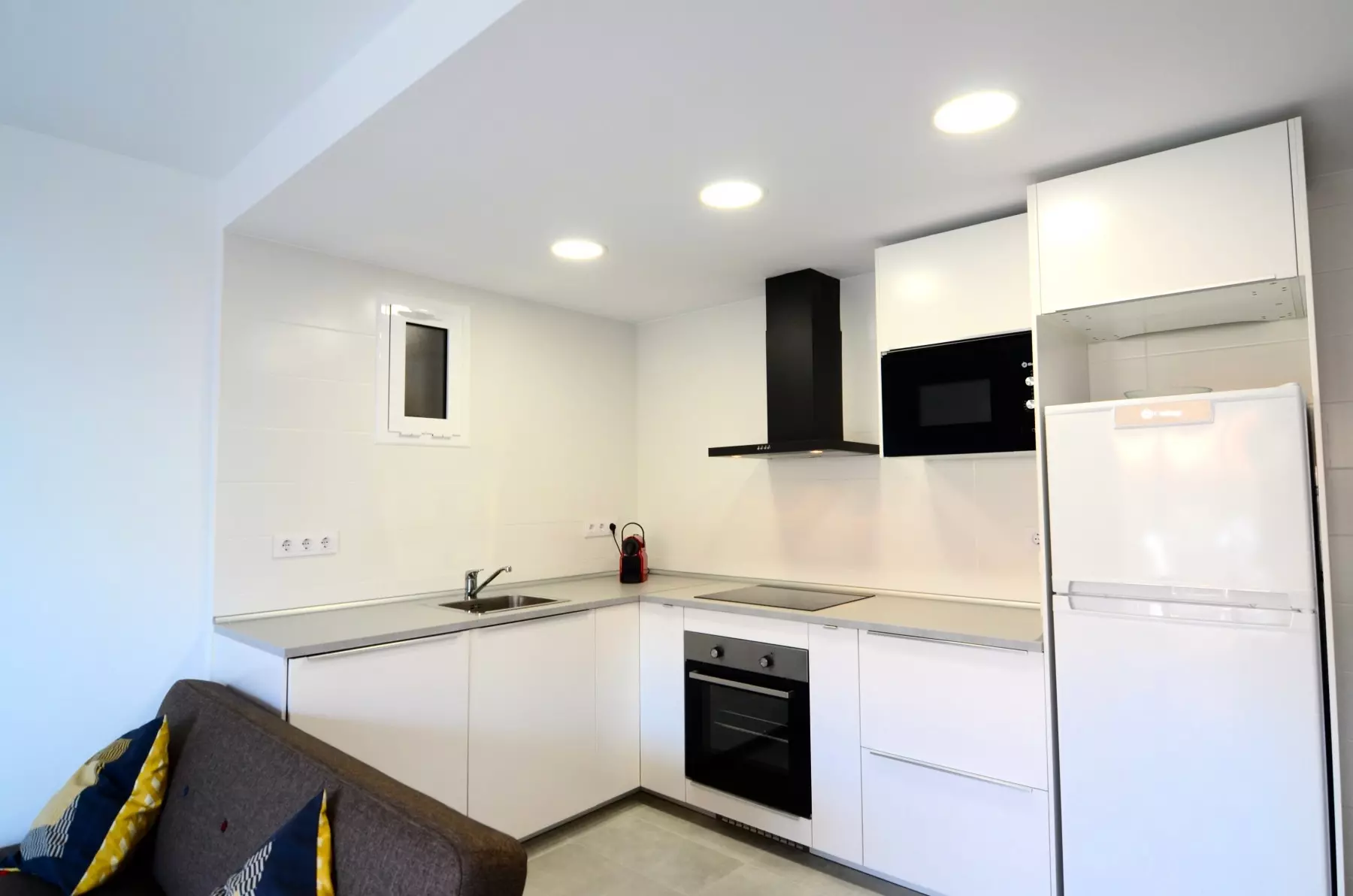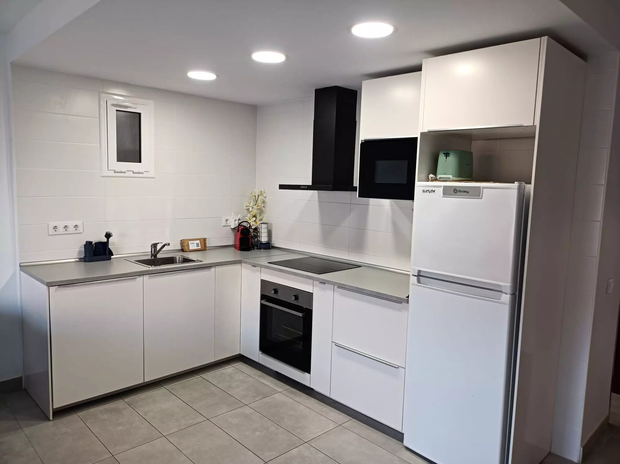 The open-plan kitchen, with ceramic hob, is equipped with a refrigerator, microwave, oven, freezer, washing machine, dishwasher, dishes/cutlery, kitchen utensils and toaster.