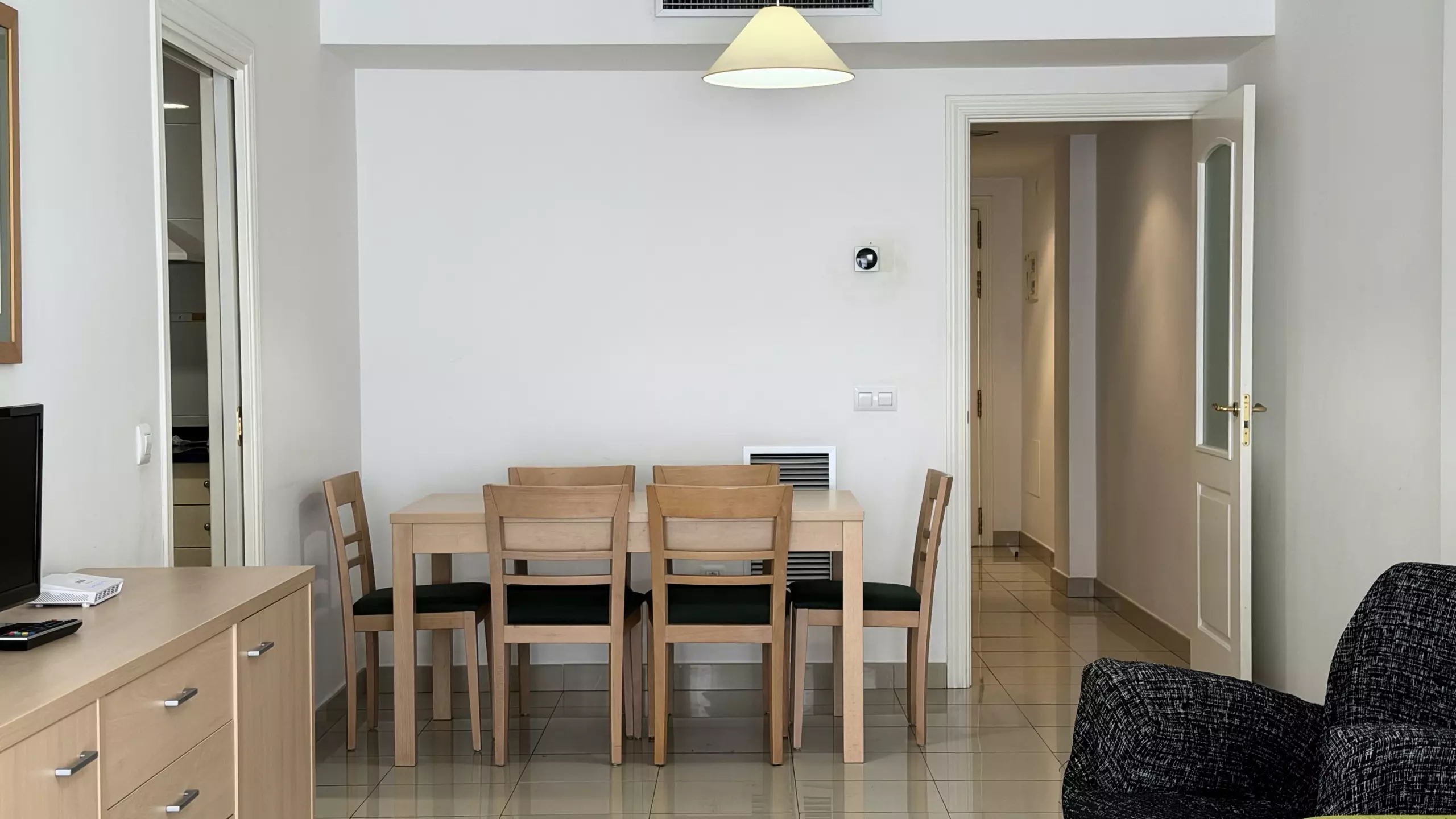 It has an elevator, iron, heat pump heating, air conditioning, communal swimming pool, covered parking in the same building, TV, satellite TV.