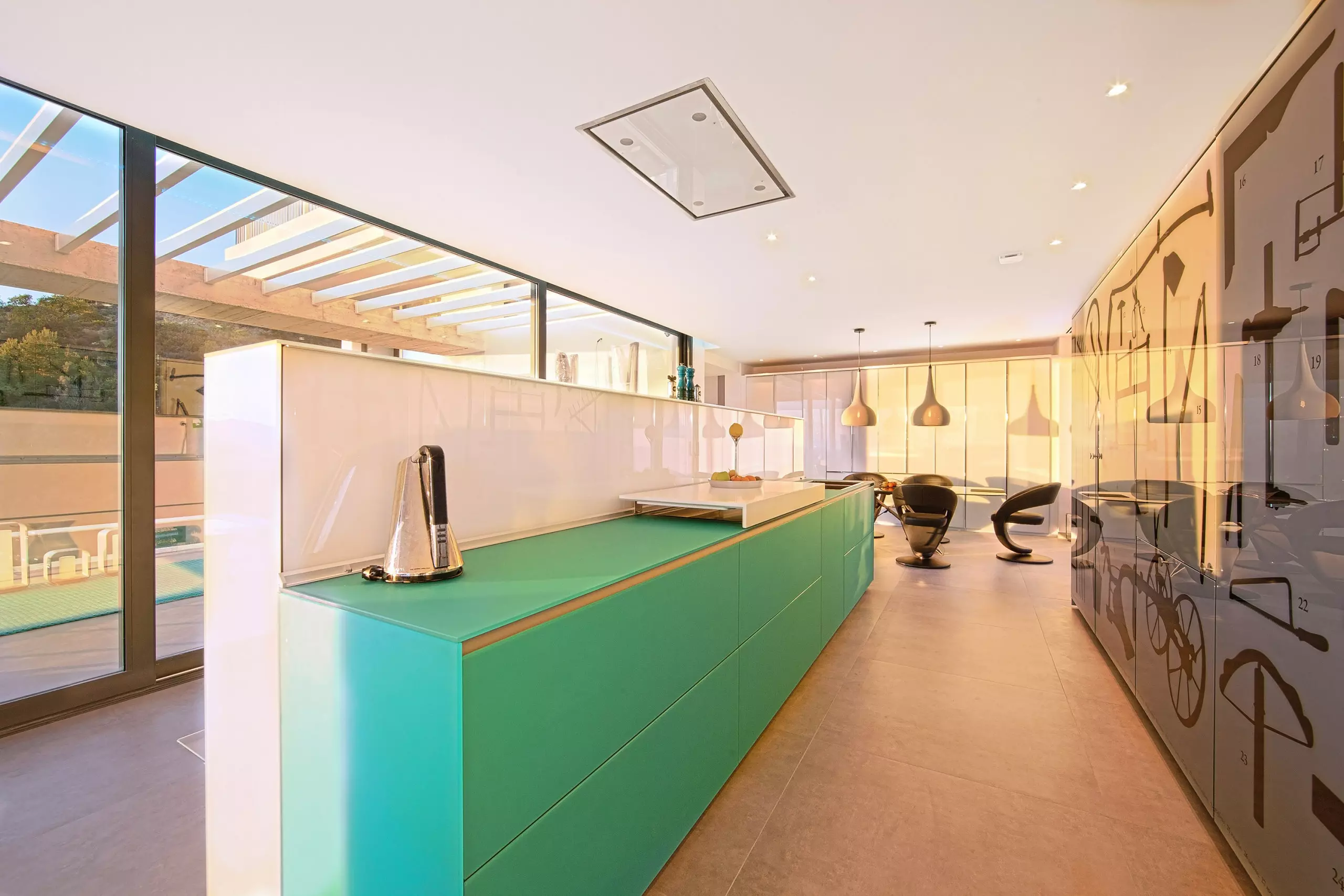 The open-plan kitchen, with induction hob, is equipped with a refrigerator, microwave, oven, freezer, dishwasher, dishes/cutlery, kitchen utensils, coffee maker, toaster, kettle and juicer.