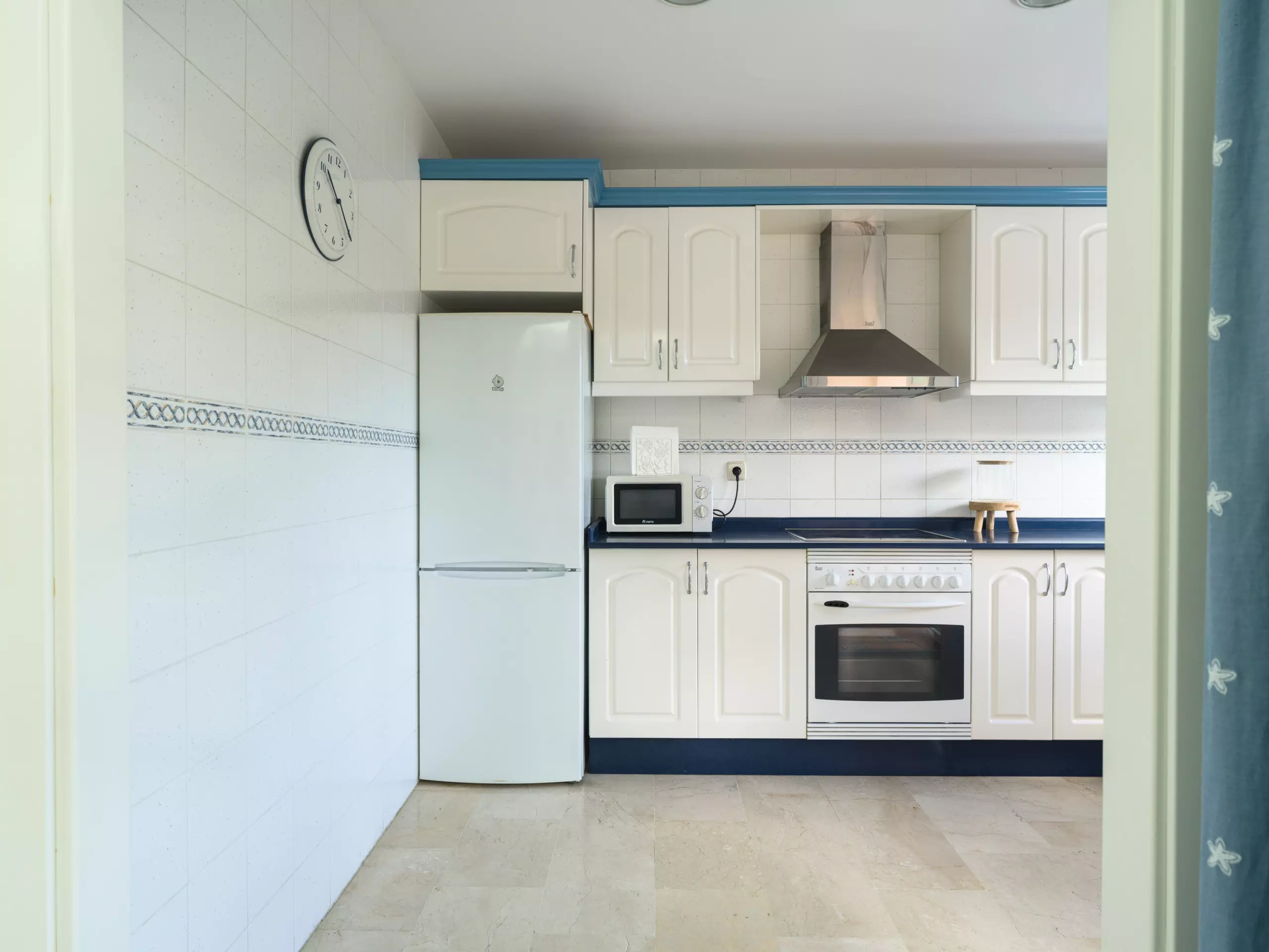 The accommodation has 2 bedrooms with side sea views (one with two single beds and the other with a bunk bed) and 1 bathroom, accommodating 4 people. It is fully equipped with everything you need to feel at home, including a separate kitchen with modern appliances, a dining room, and a comfortable living room with a TV.