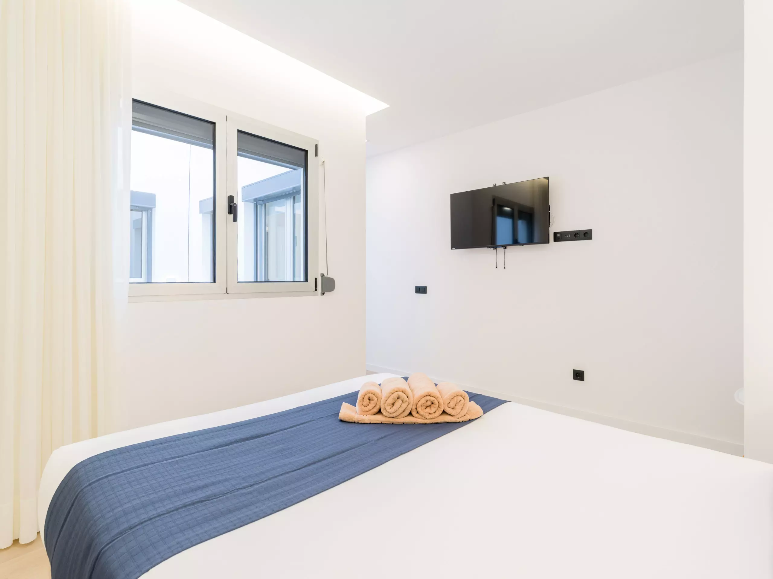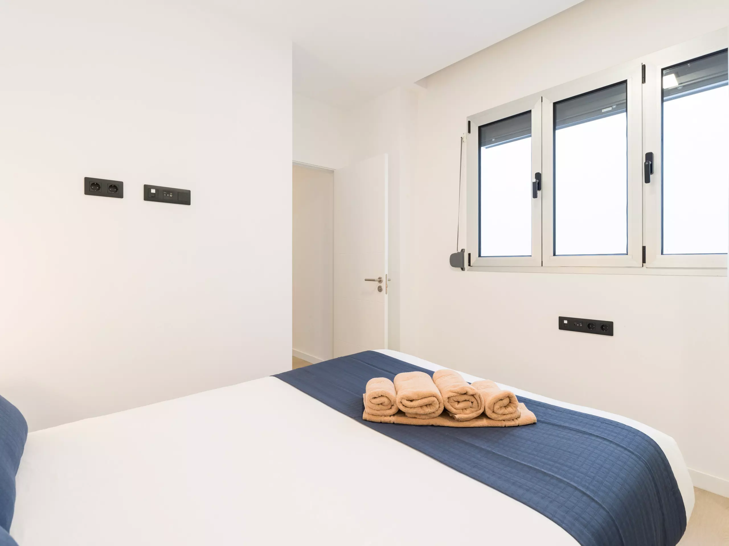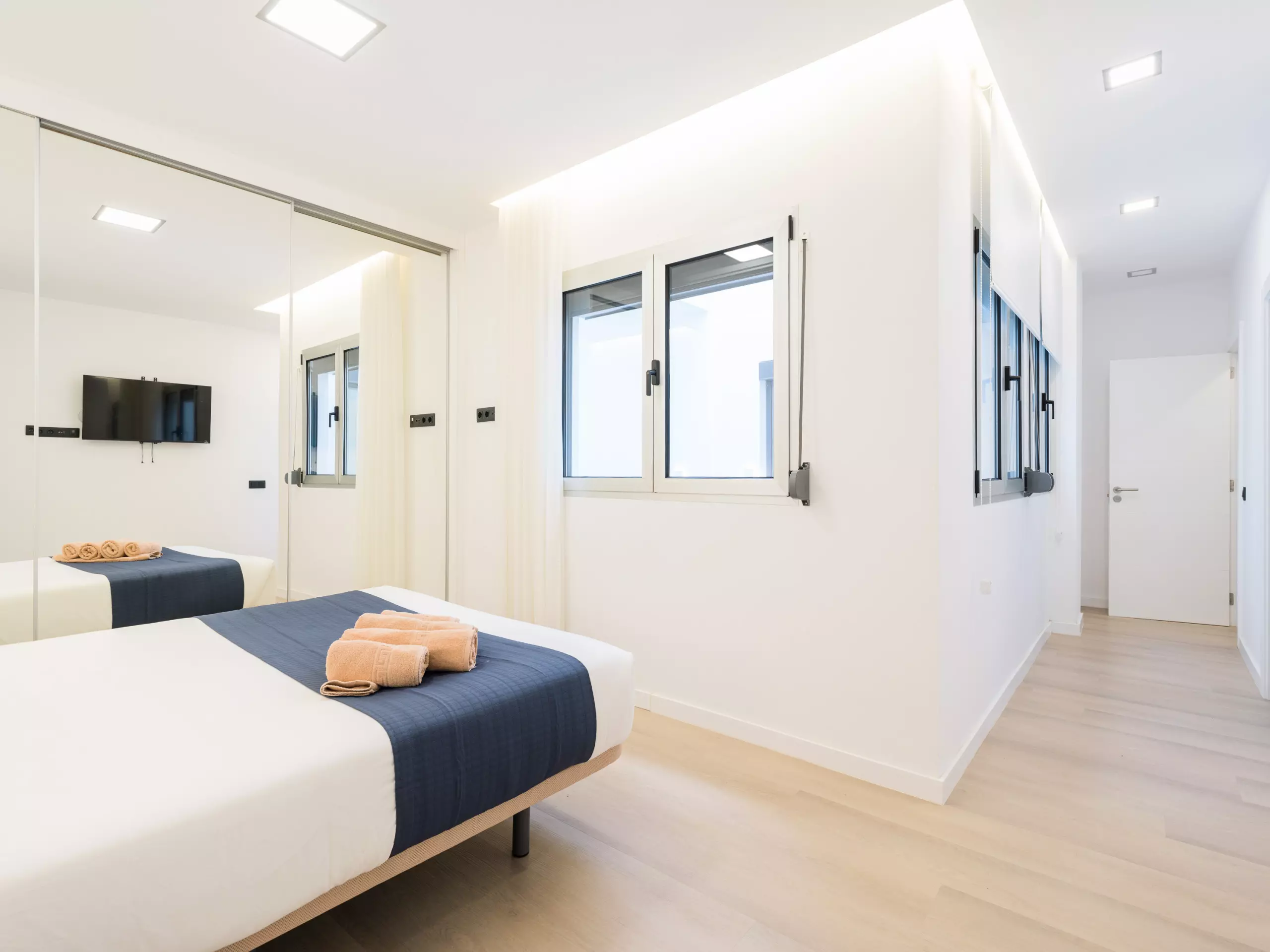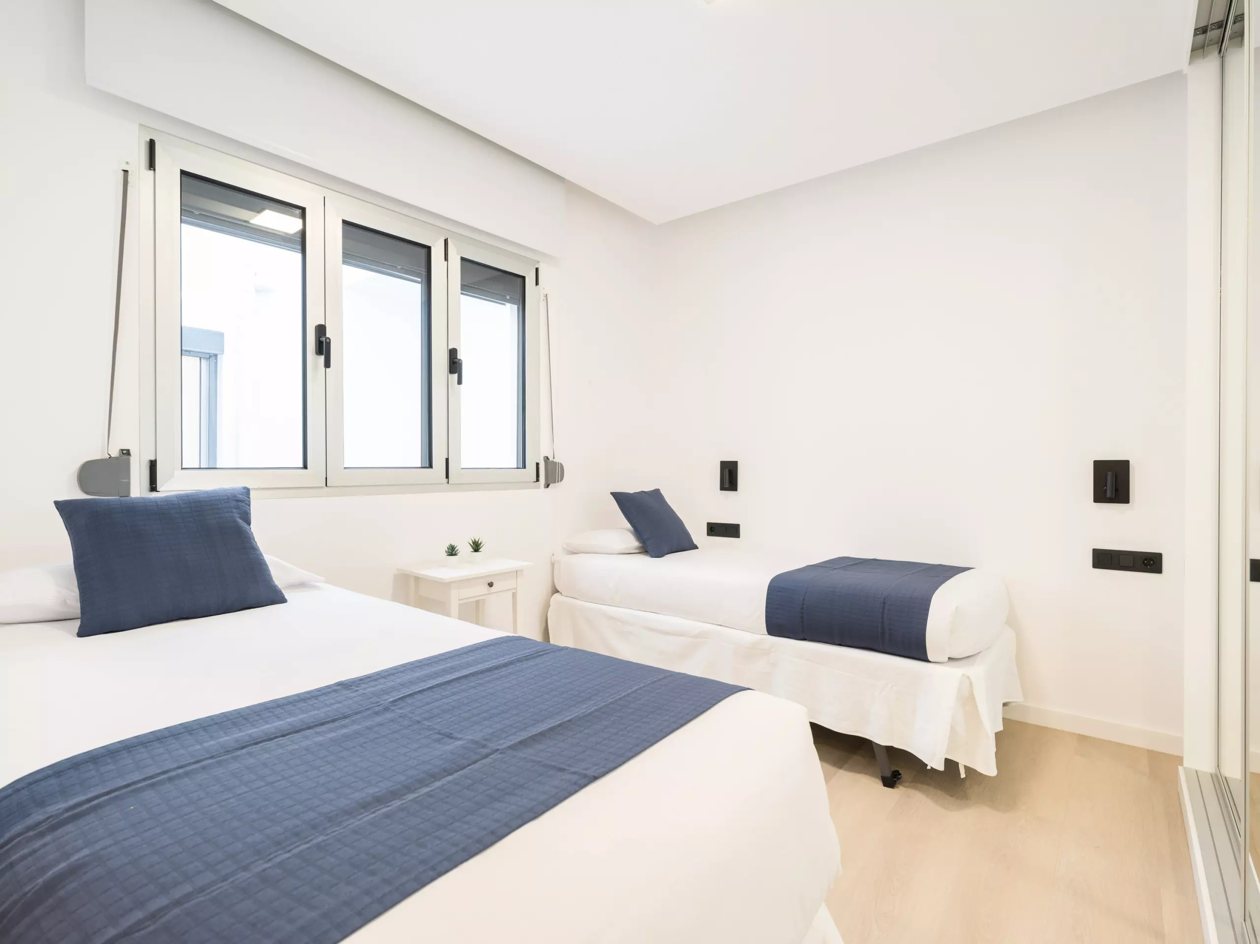 The bedrooms are a haven of peace, overlooking interior patios and equipped with blinds. All three bedrooms can accommodate two people and feature a large built-in closet. One of the bedrooms has an en suite bathroom for added comfort. Another bedroom has a wall-mounted smart TV.
