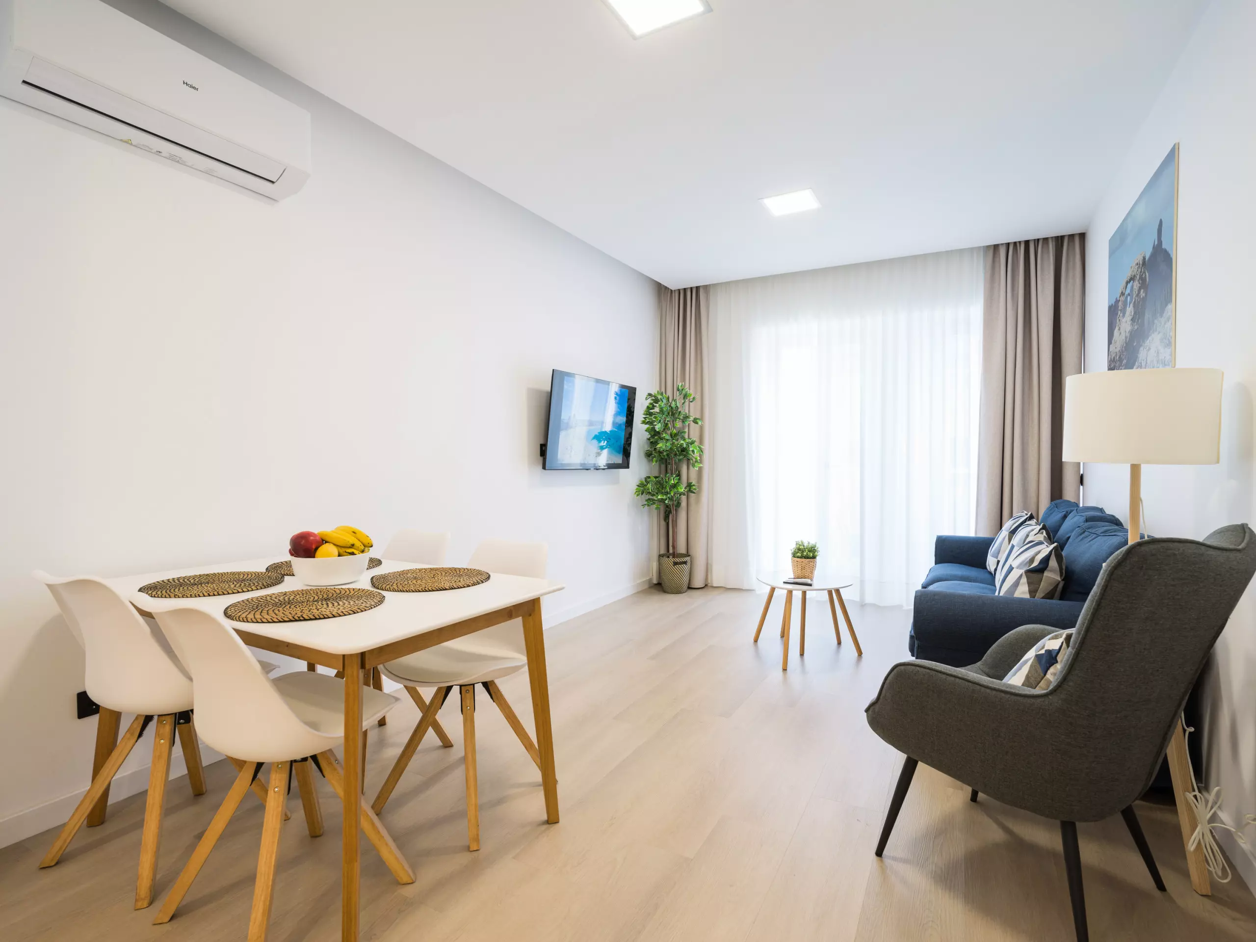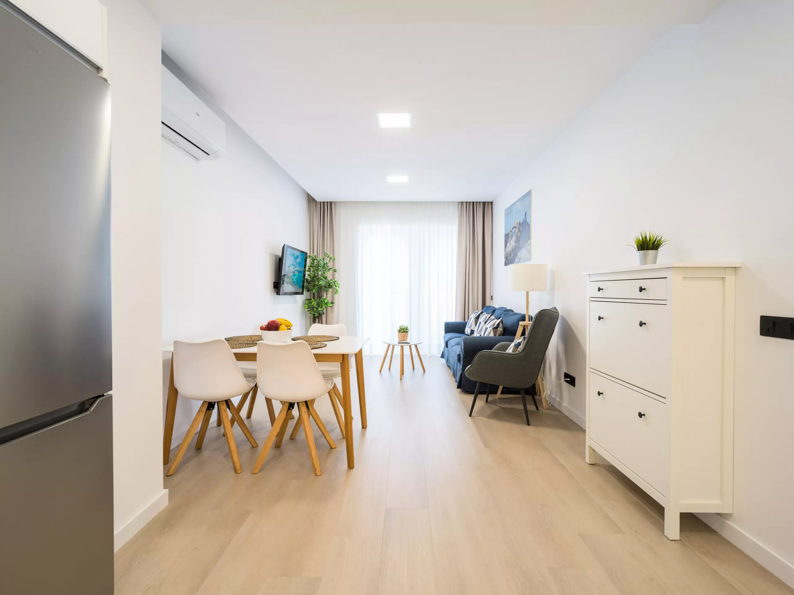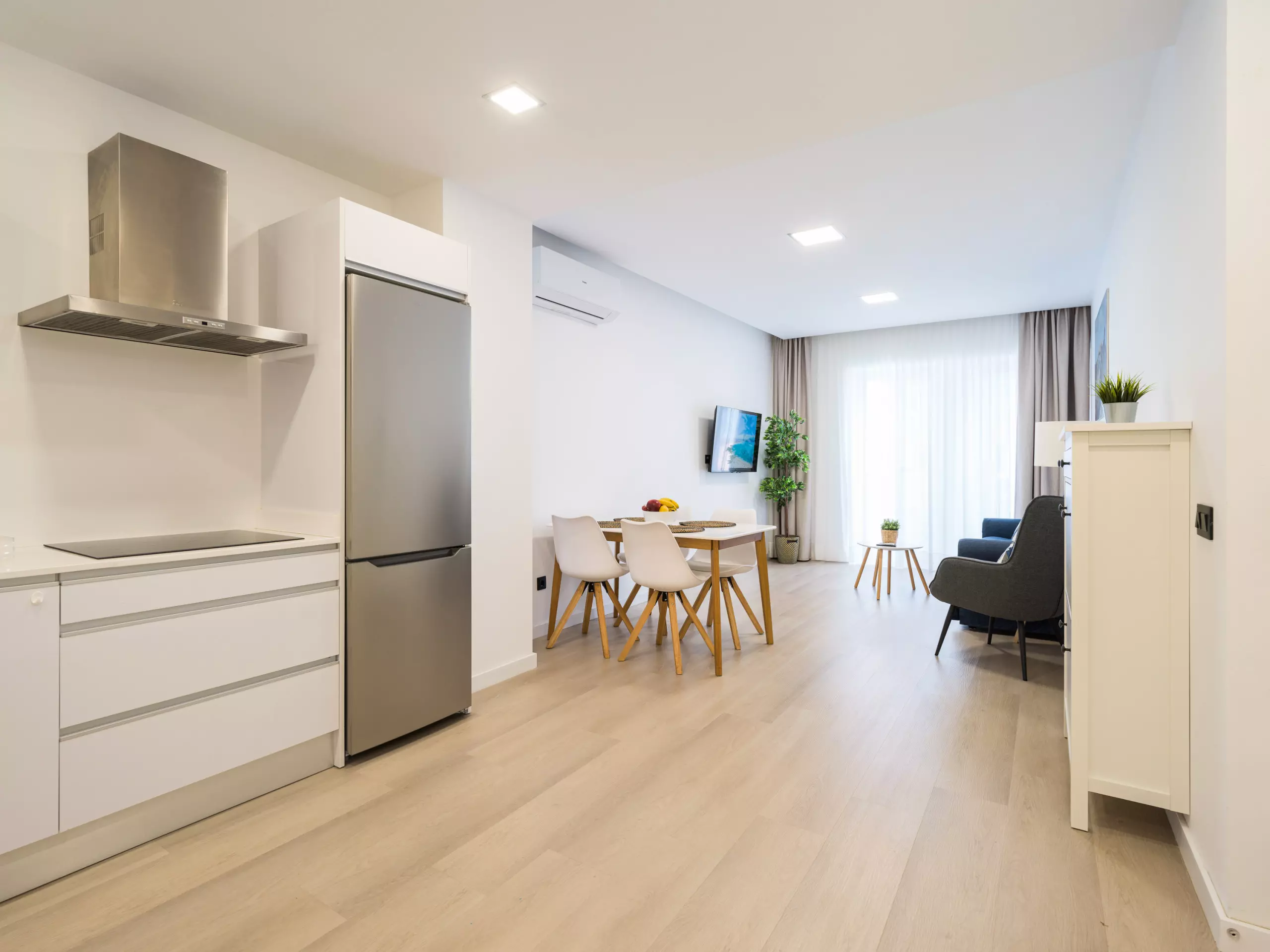 The living-dining room has a smart TV and two large windows that provide plenty of light and connect to the balcony.