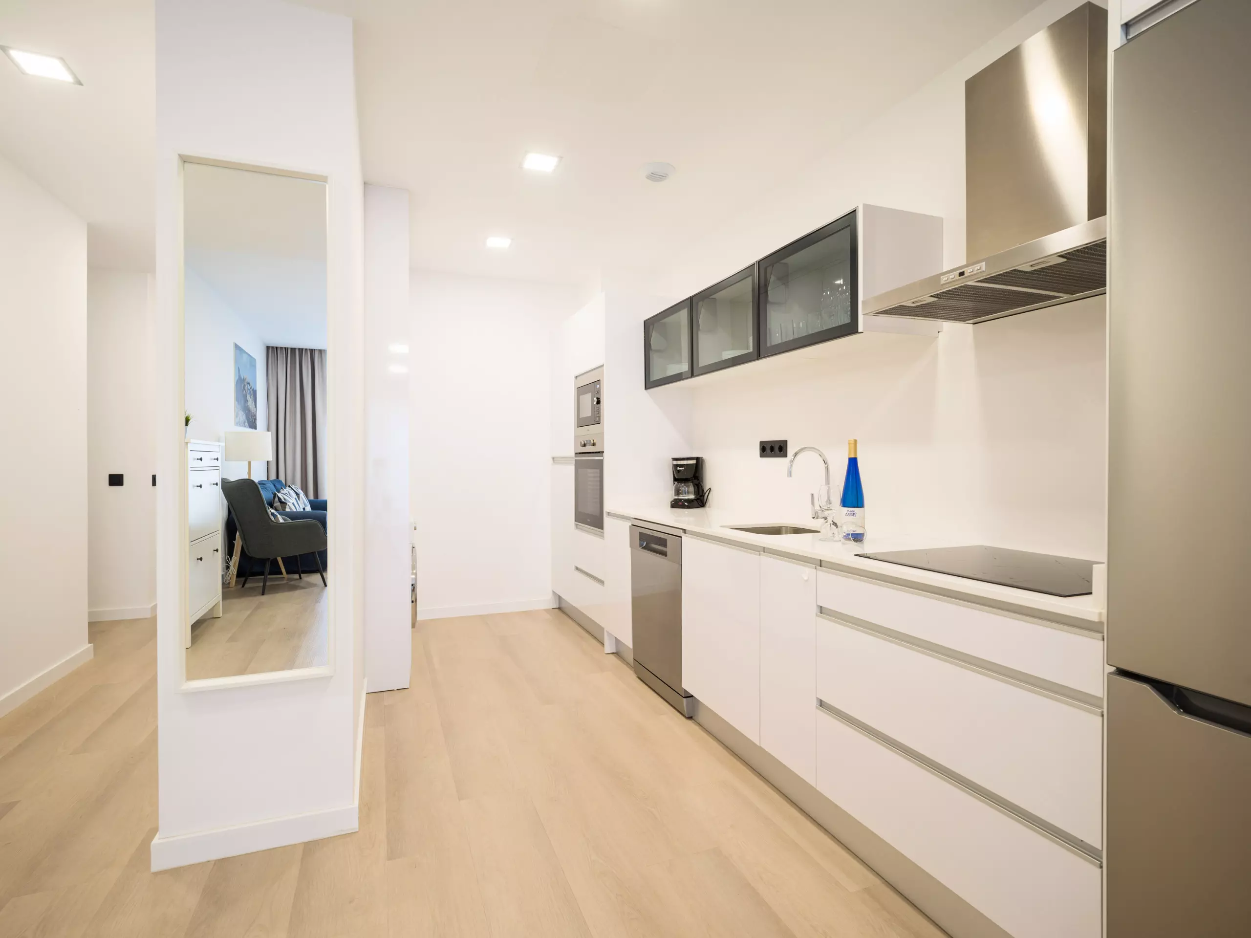 The kitchen is modern and spacious, with ample storage capacity and fully equipped with both appliances and utensils.