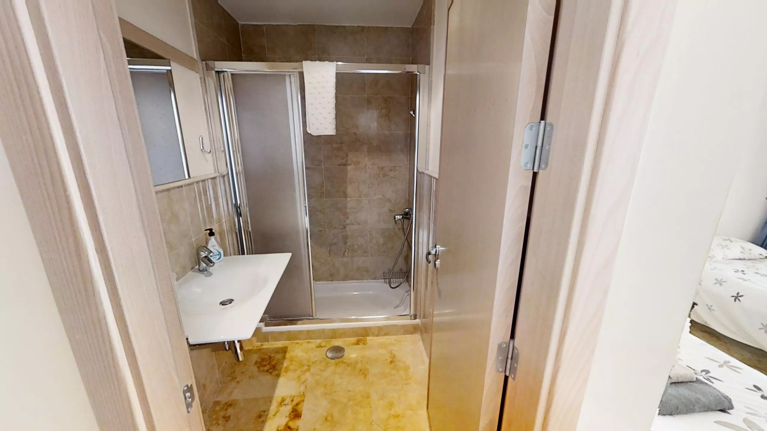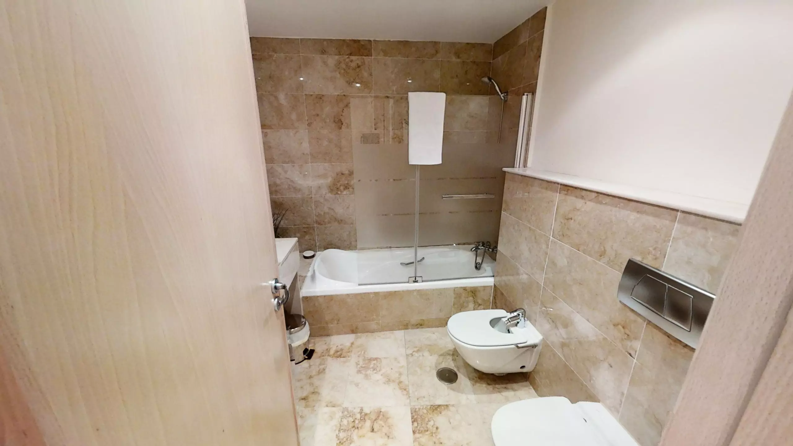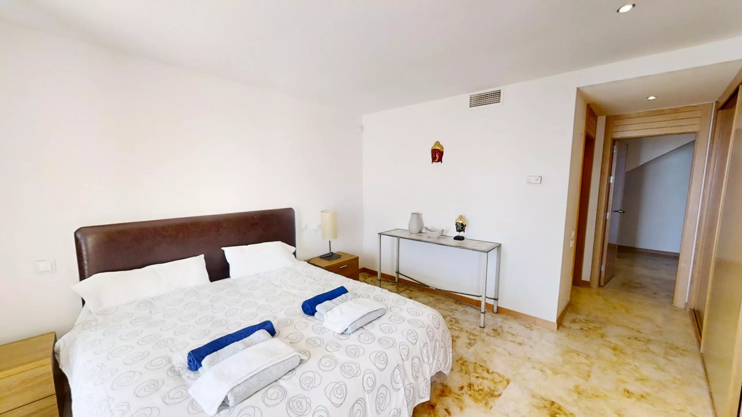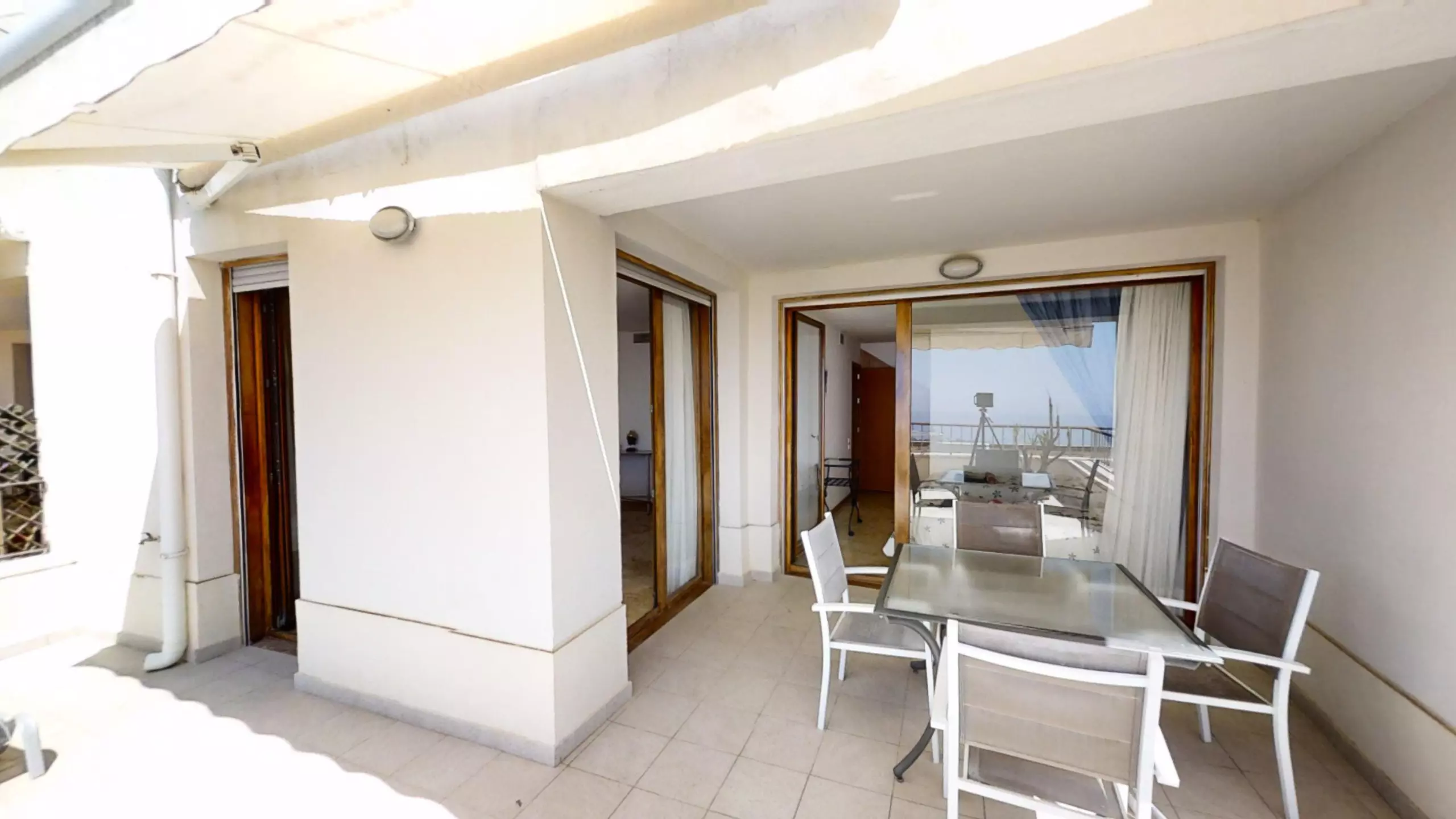 Going down the entrance stairs, you will find a guest toilet in the hallway that gives access to the two bedrooms. The two master bedrooms with double beds and the second bedroom with two single beds have direct access to another terrace of approximately 15m2 with a small table and two deckchairs. The master bedroom has an en-suite bathroom with a bathtub, double sink, toilet, and bidet. The other bathroom has a sink, toilet, and shower.