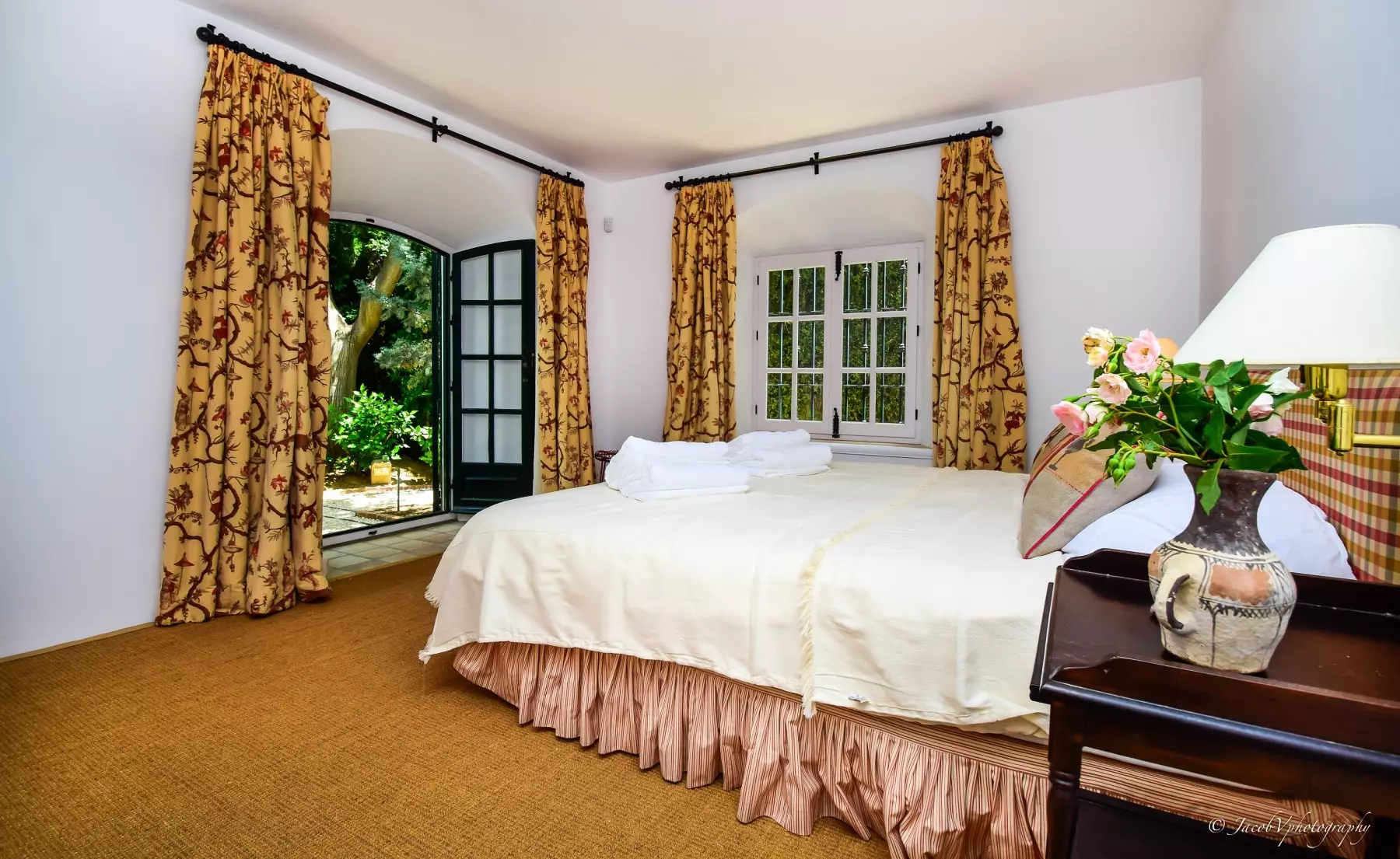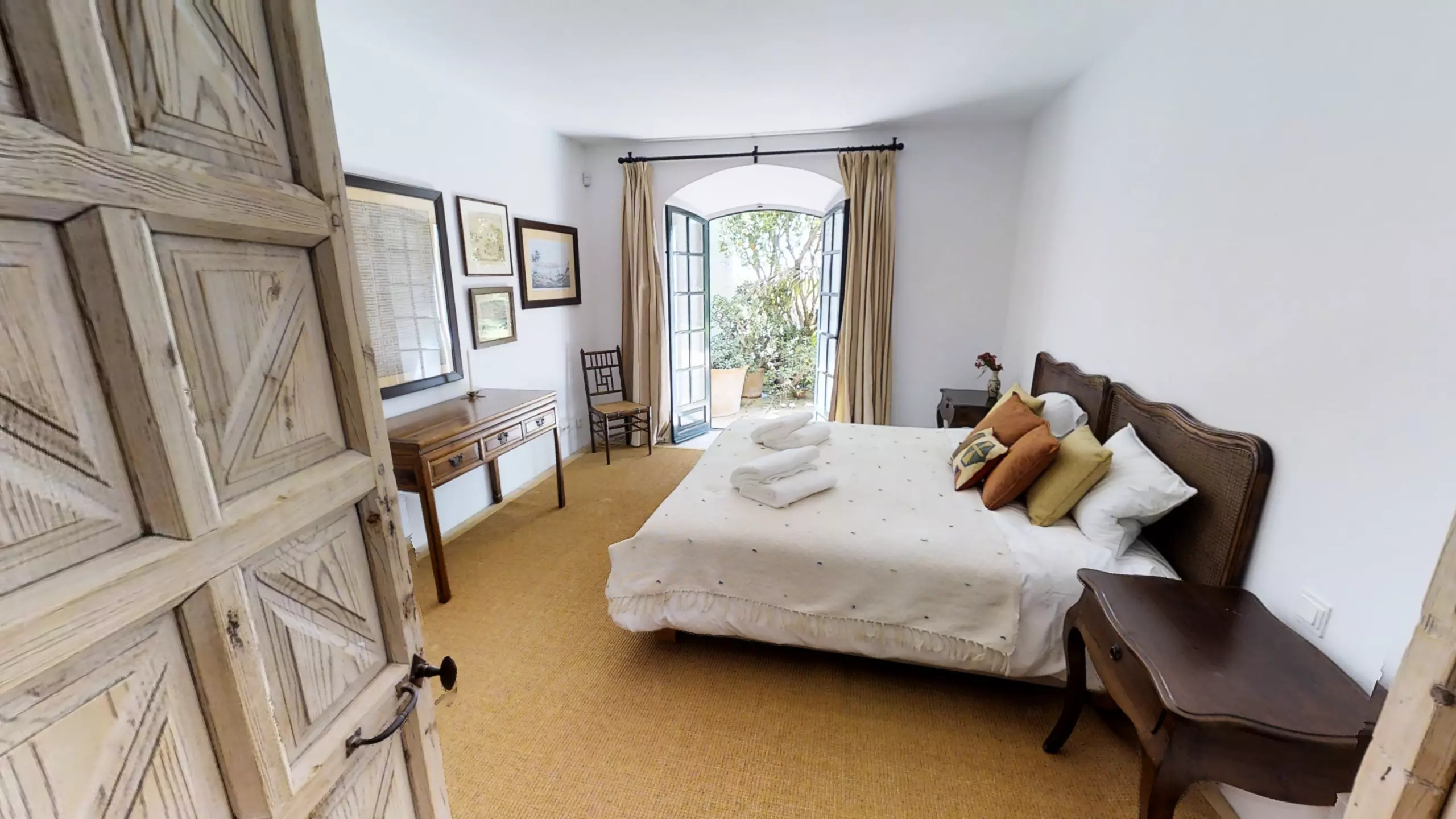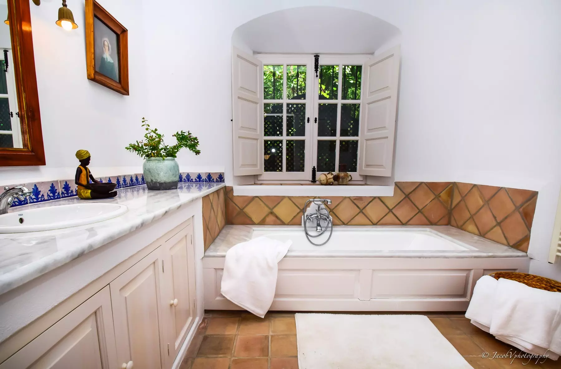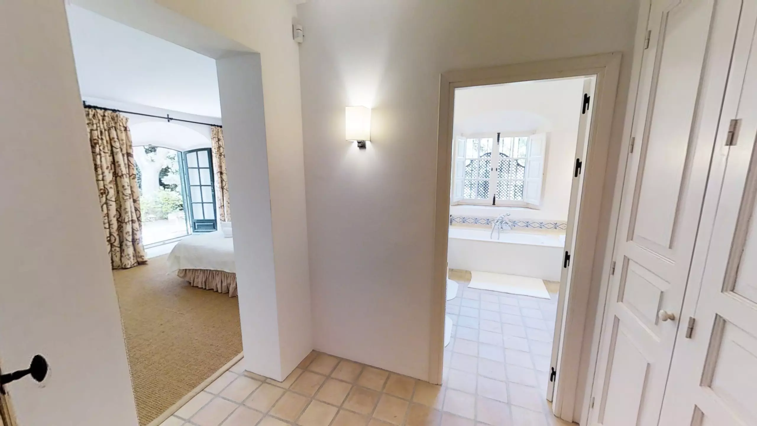 Bedroom 2 shares a bathroom with Bedroom 3. The bathroom has a double sink, a bathtub, and a toilet. These rooms have direct access to the garden and pool.
