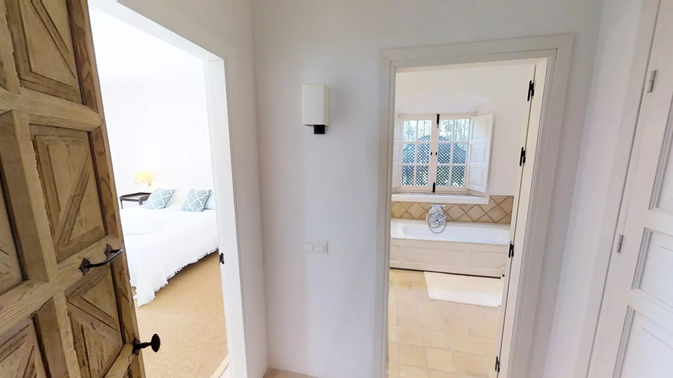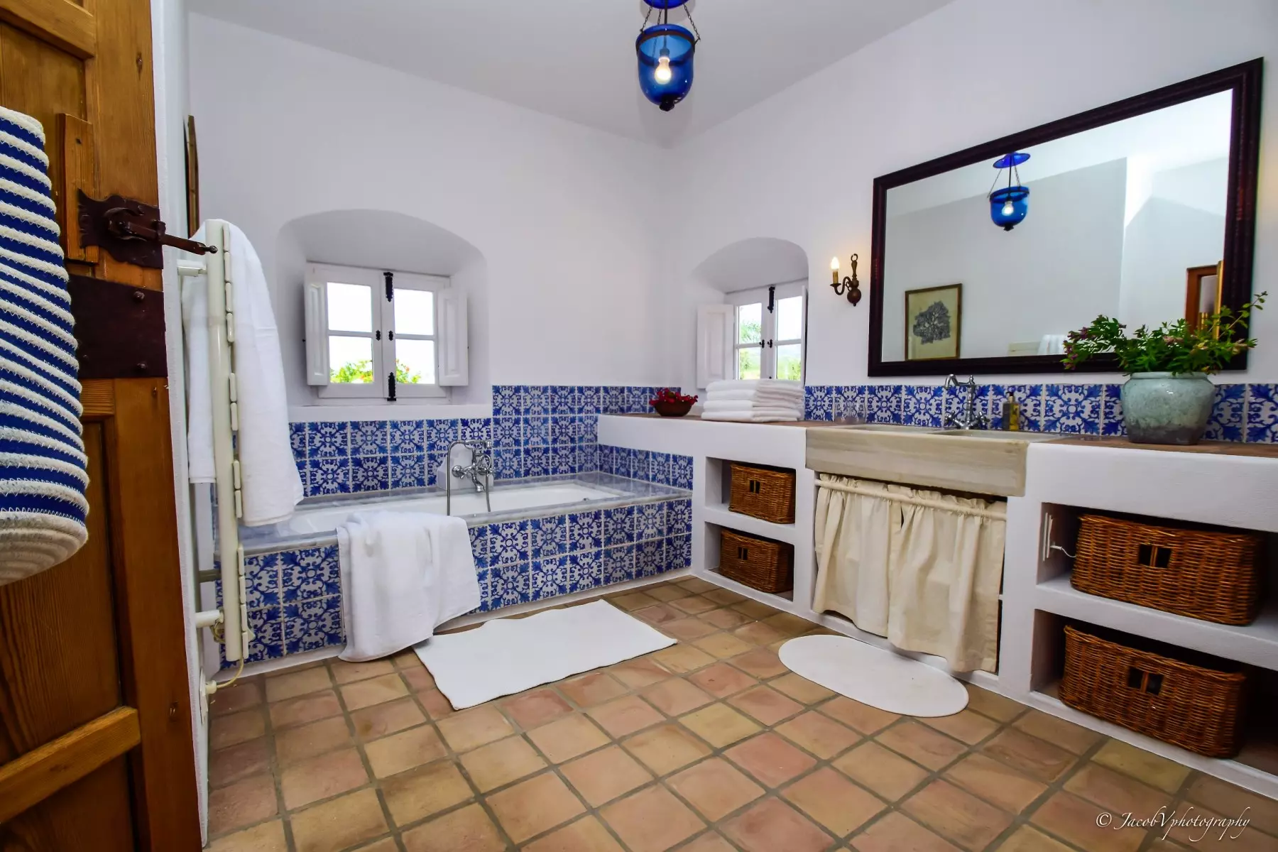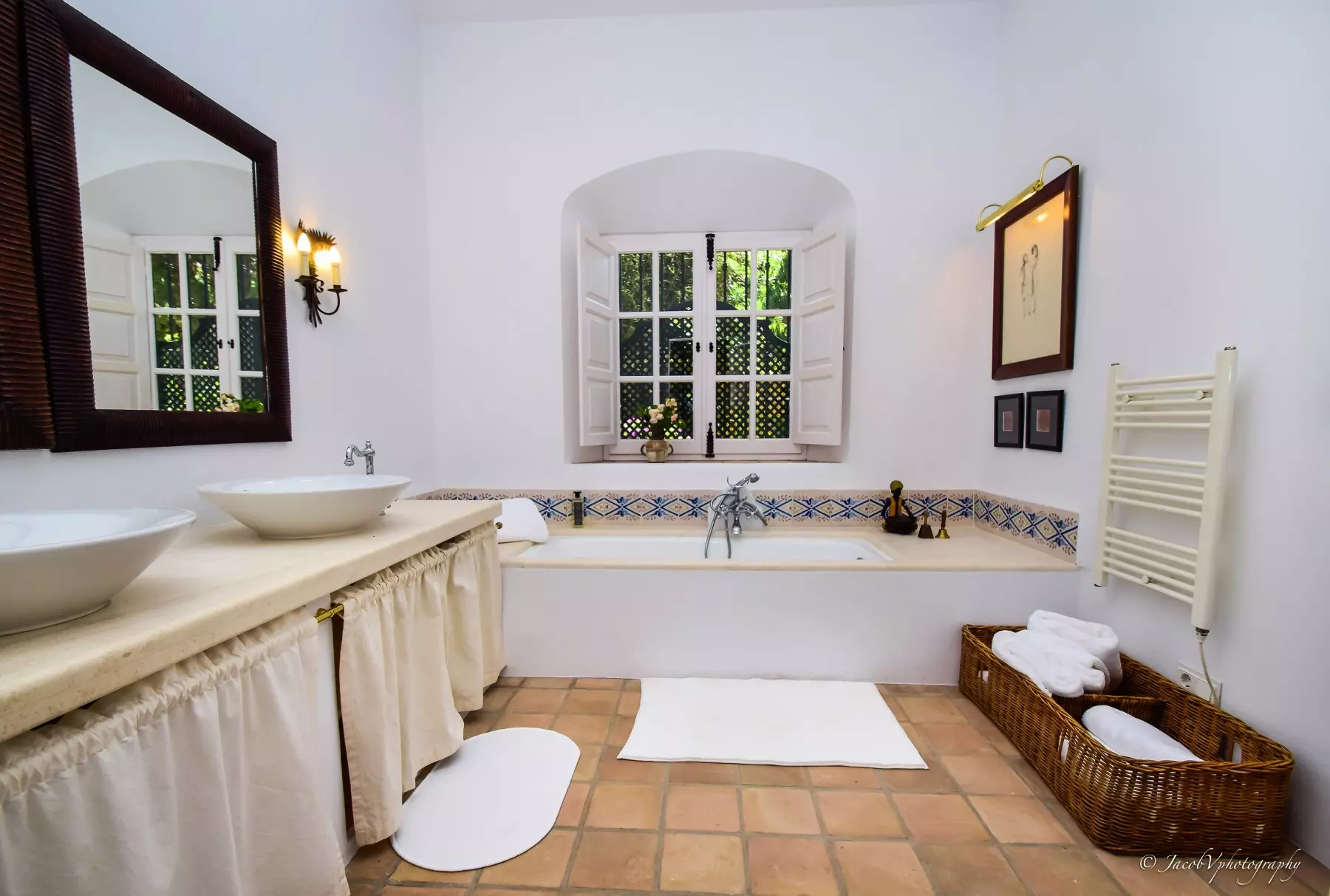 Bedroom 1 with en-suite bathroom with double sink, bath and toilet. Has its own exit to the northwest.