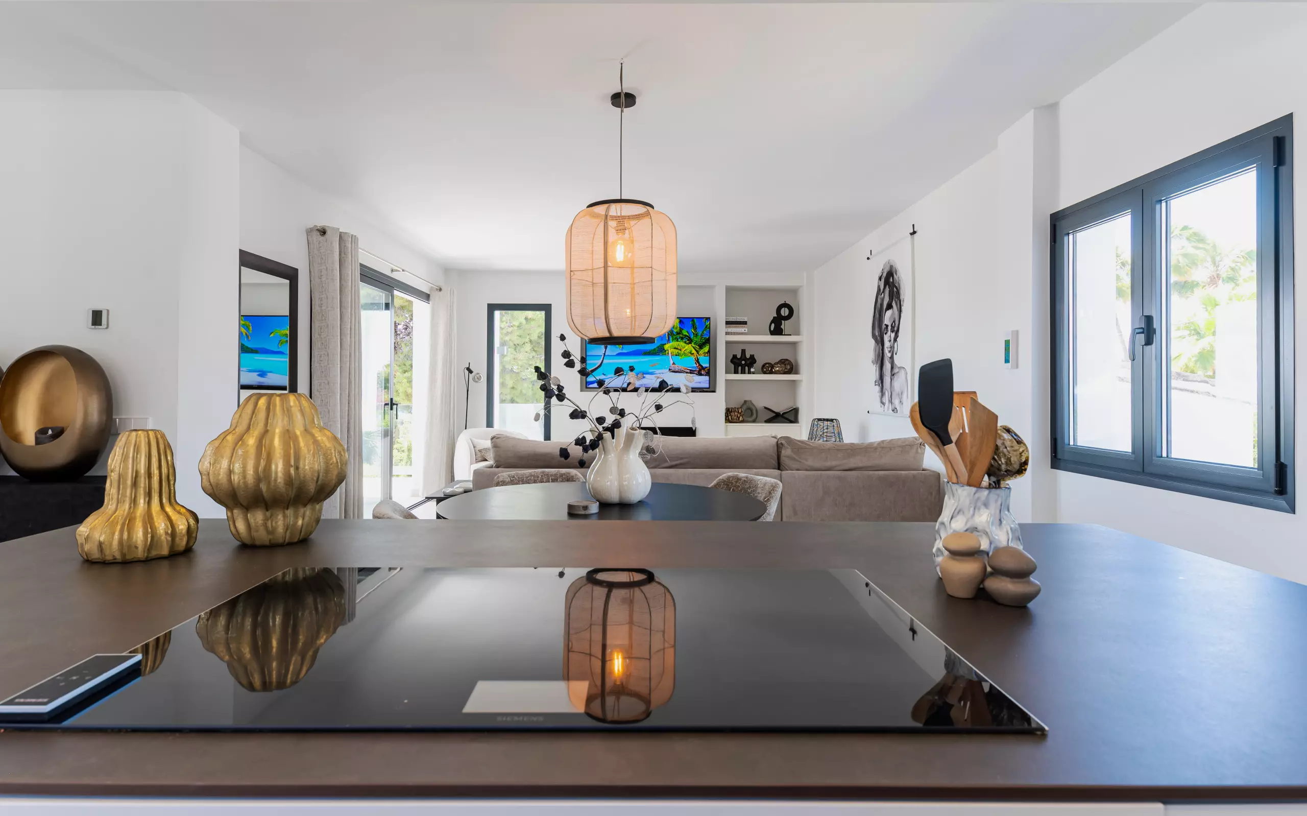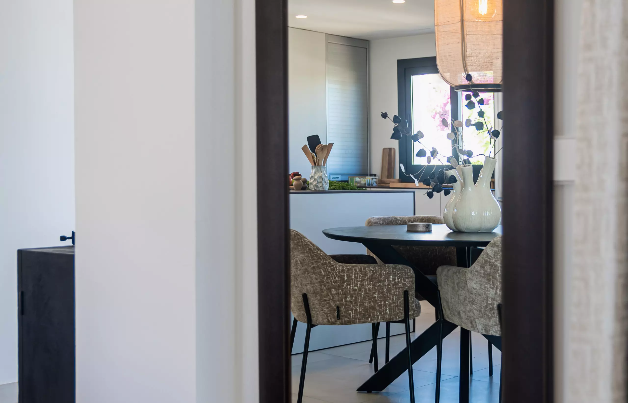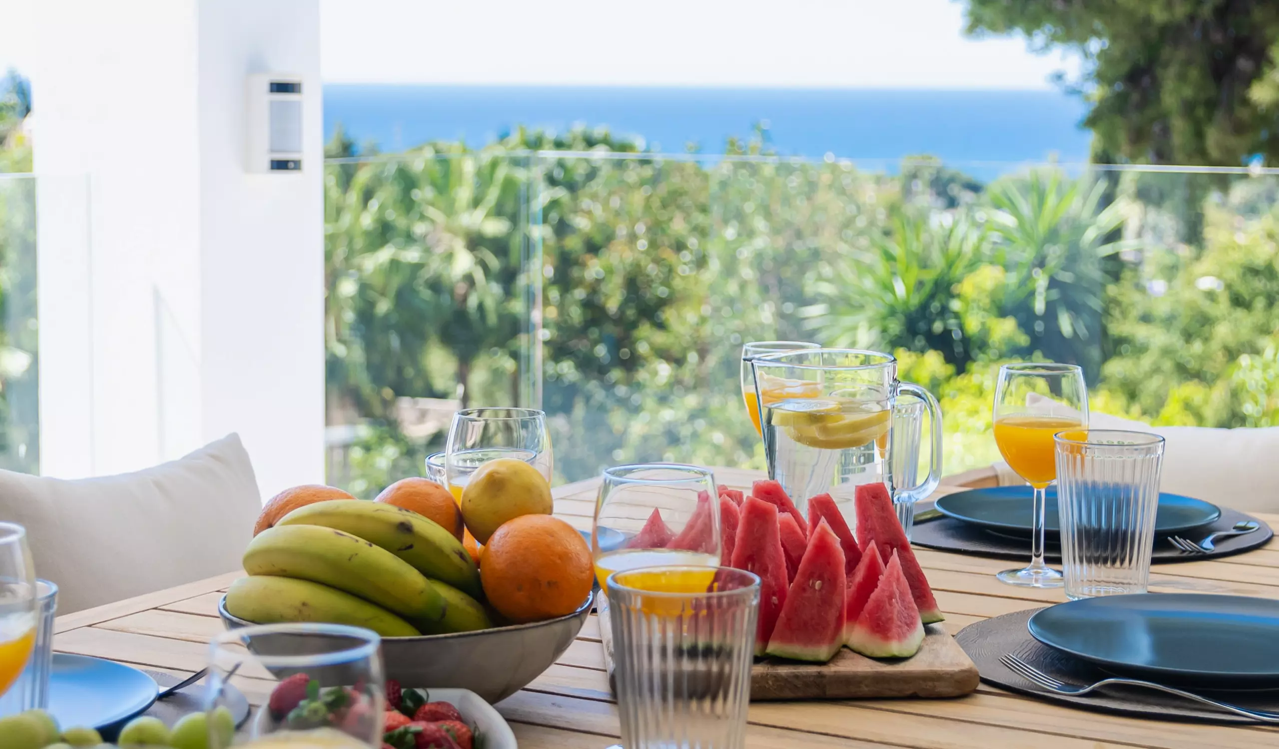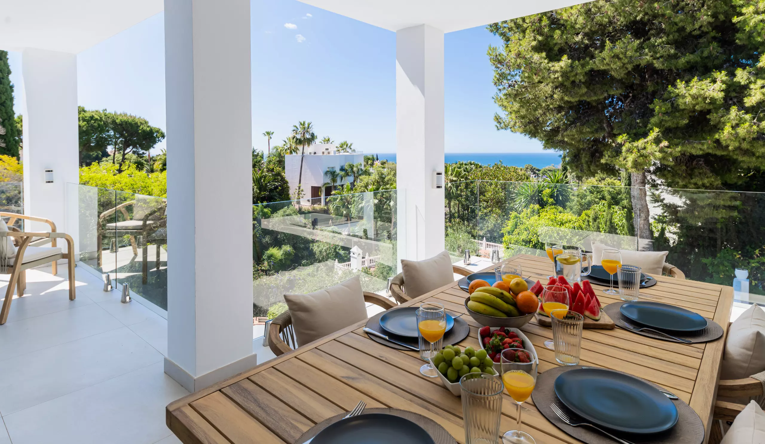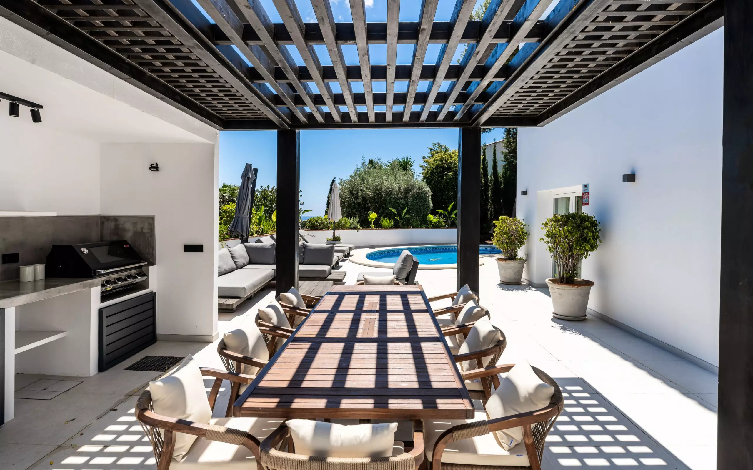 From the living room and the villa's entrance, direct access leads to the al fresco dining area. Here, the breathtaking sea view serves as the backdrop to every meal, creating the perfect environment for entertaining or enjoying a quiet evening to the sound of the waves.