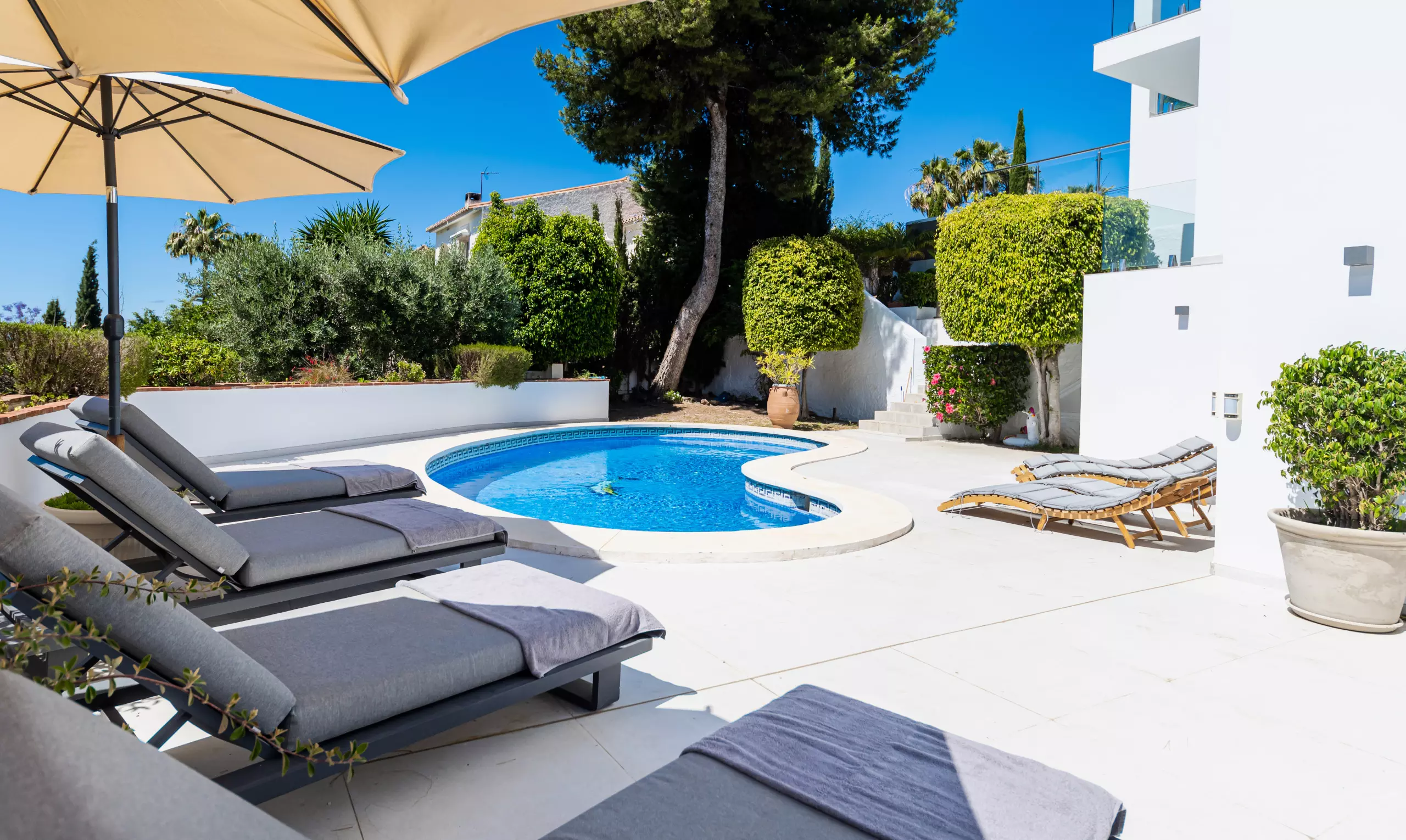 The outdoor area includes a jacuzzi and a sparkling pool tiled in a modern style and high-quality sun loungers, creating a private oasis to relax and enjoy. The pool area is south-facing, so it receives sunlight from sunrise to sunset.