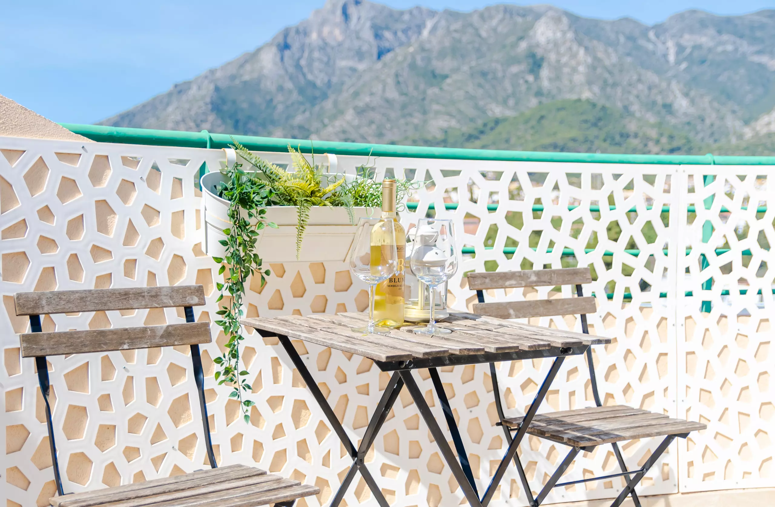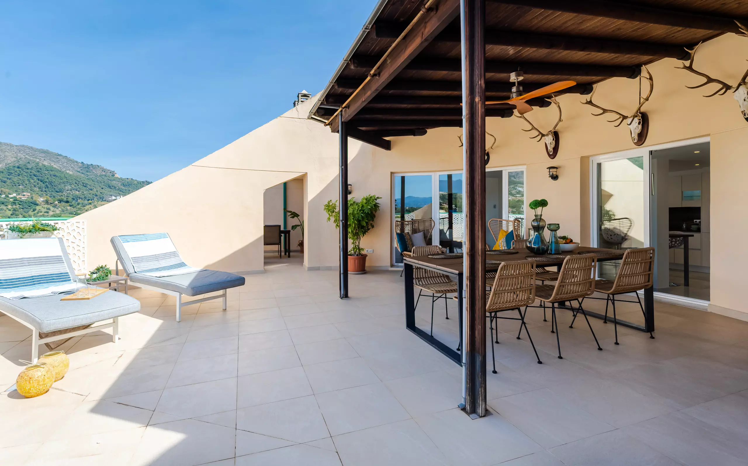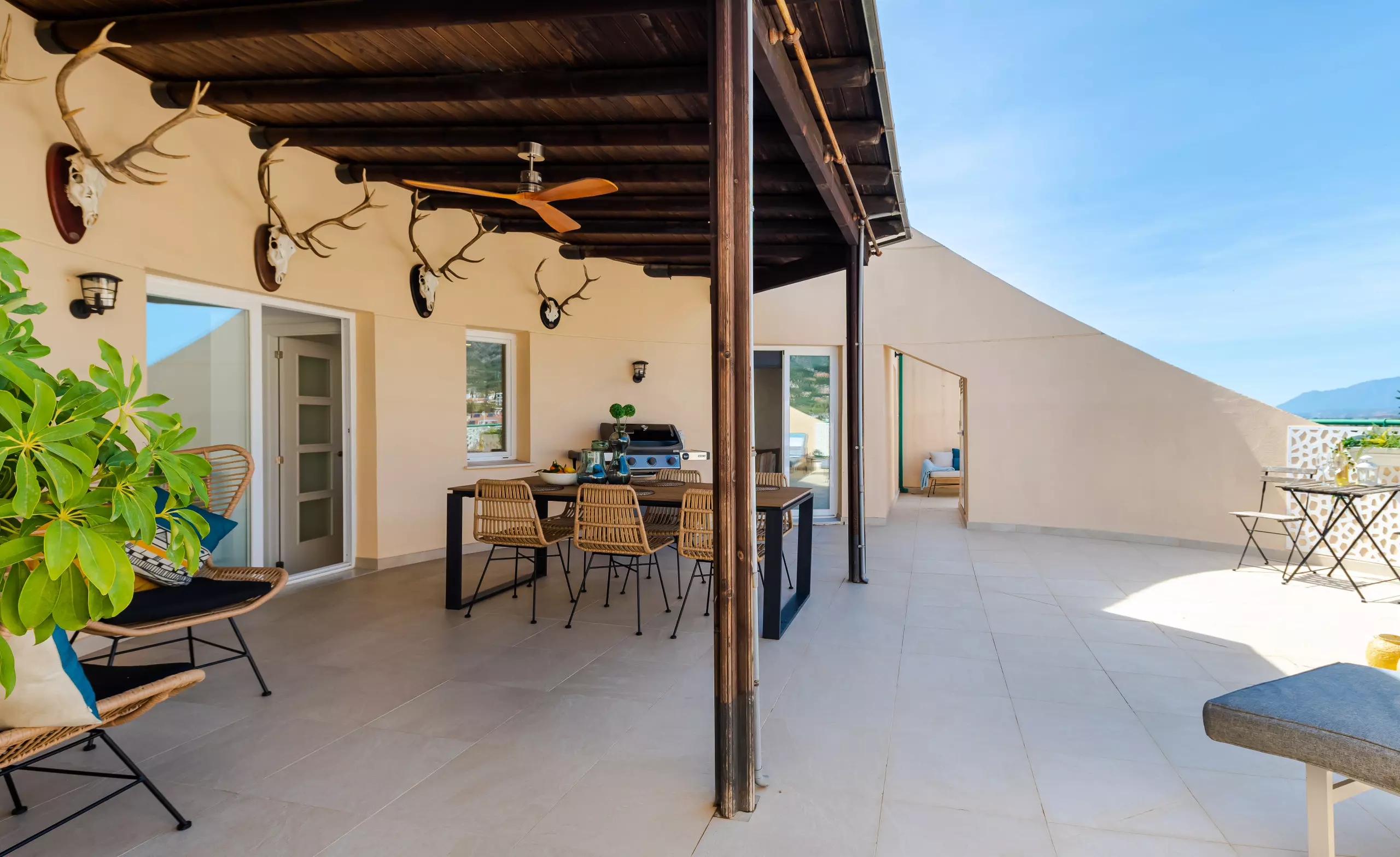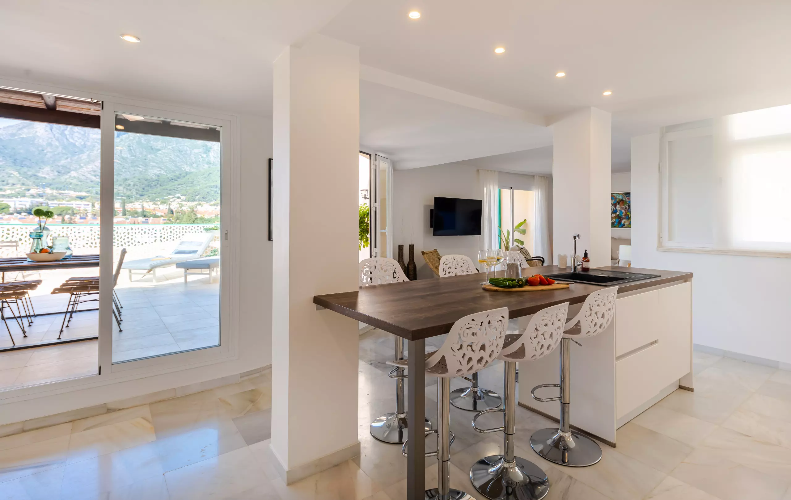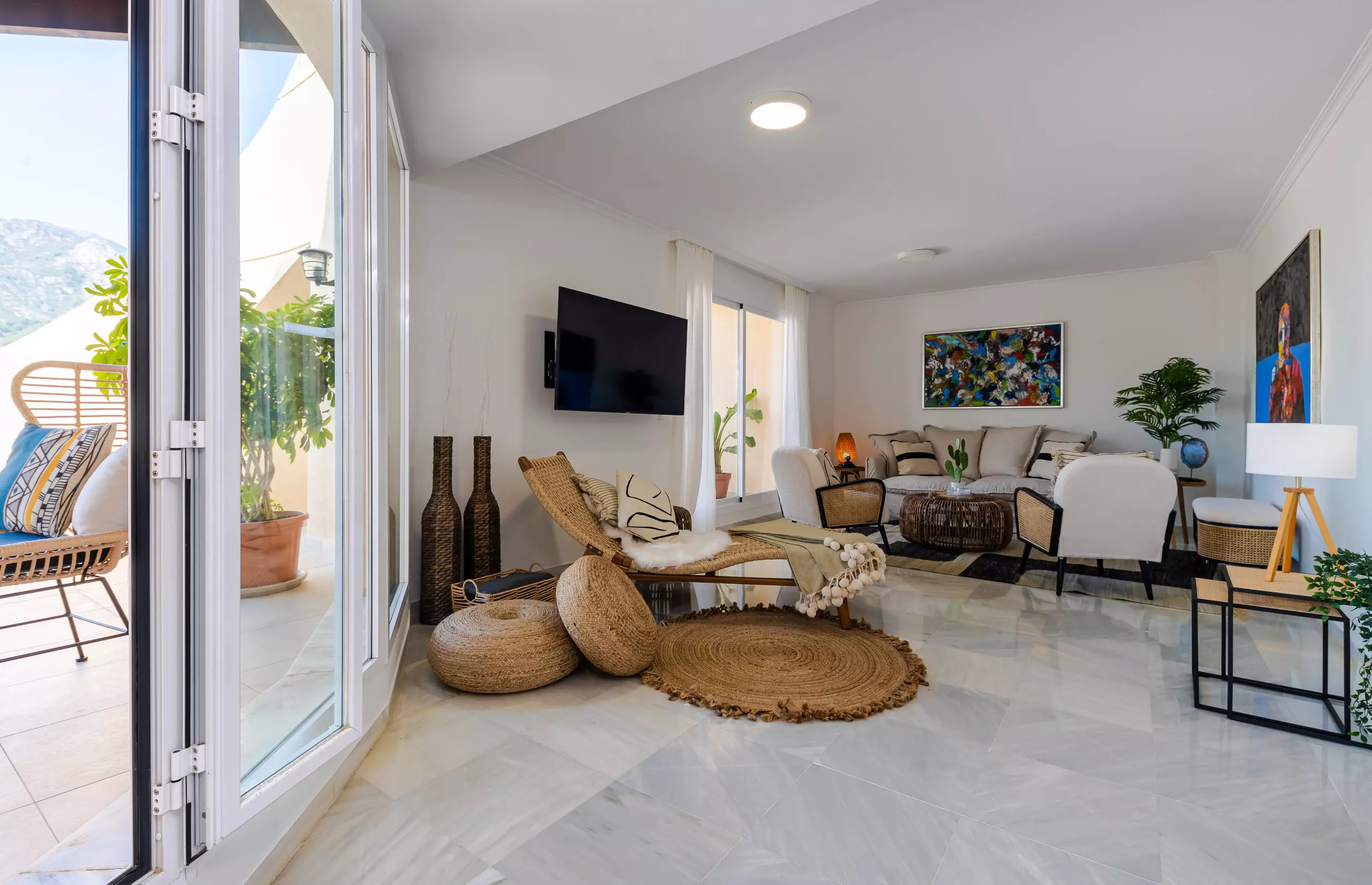 Upon entering, you'll be greeted by a bright living room decorated with a large flat-screen TV, plush sofas, and armchairs, providing the perfect retreat after a day of exploring the city. Step outside the living room onto a generous terrace offering breathtaking views of Mount La Concha and the cityscape. Privacy is paramount, with no neighboring terraces in sight. This expansive terrace is connected to two smaller private terraces—one accessible from a bedroom and the other from the living room—creating an outdoor space ideal not only for sunbathing but also for delicious al fresco dining thanks to the terrace's barbecue.