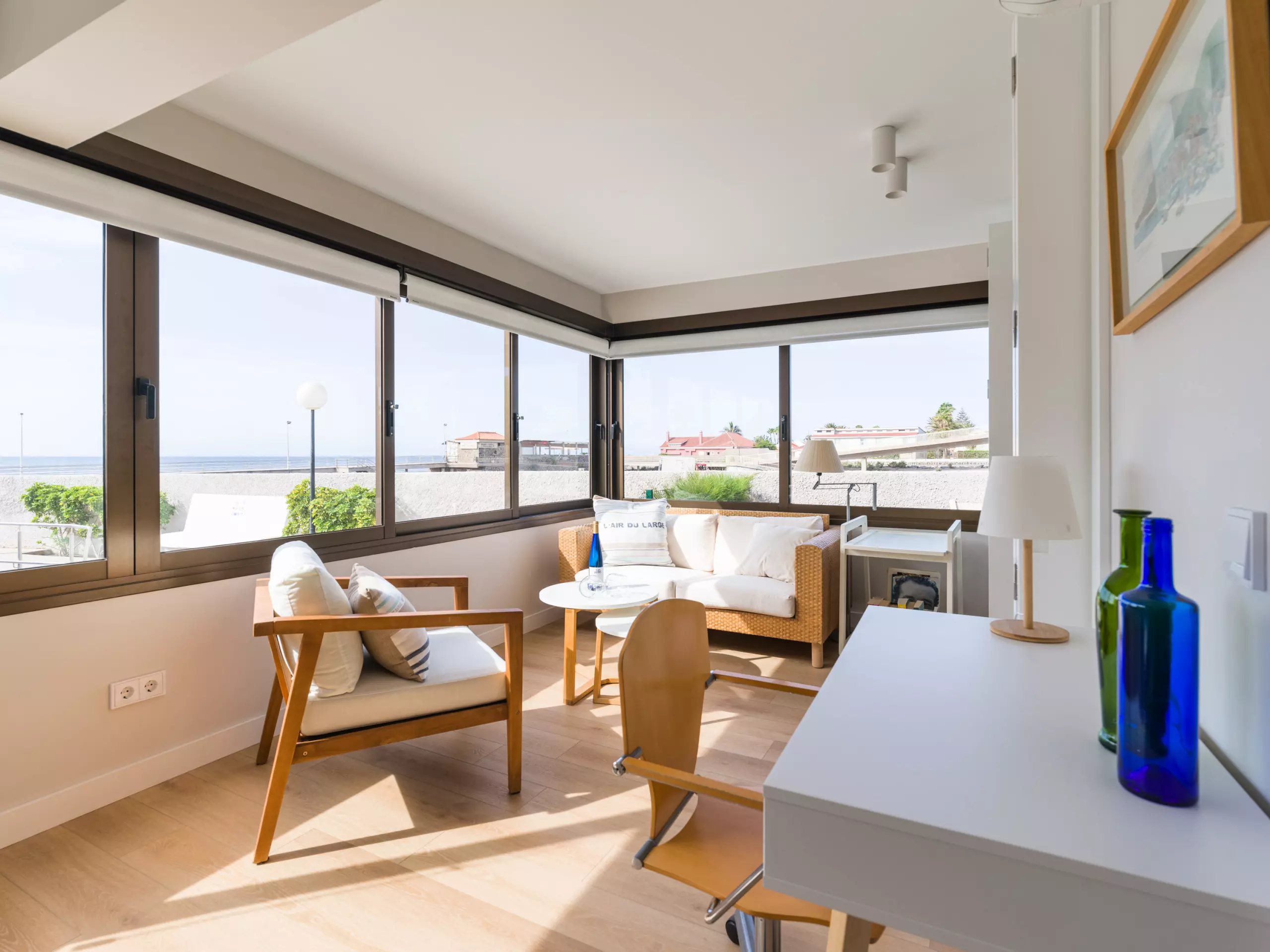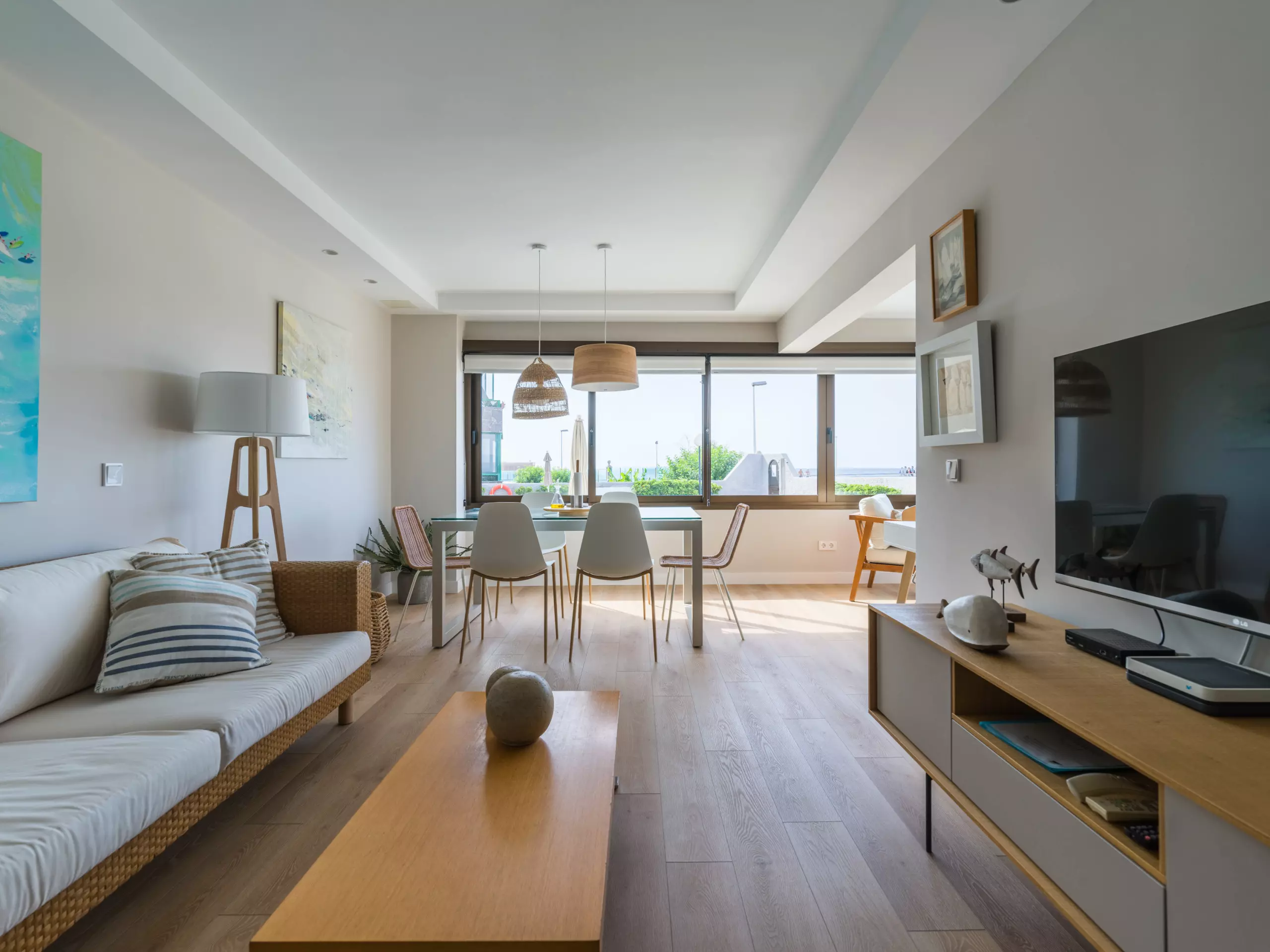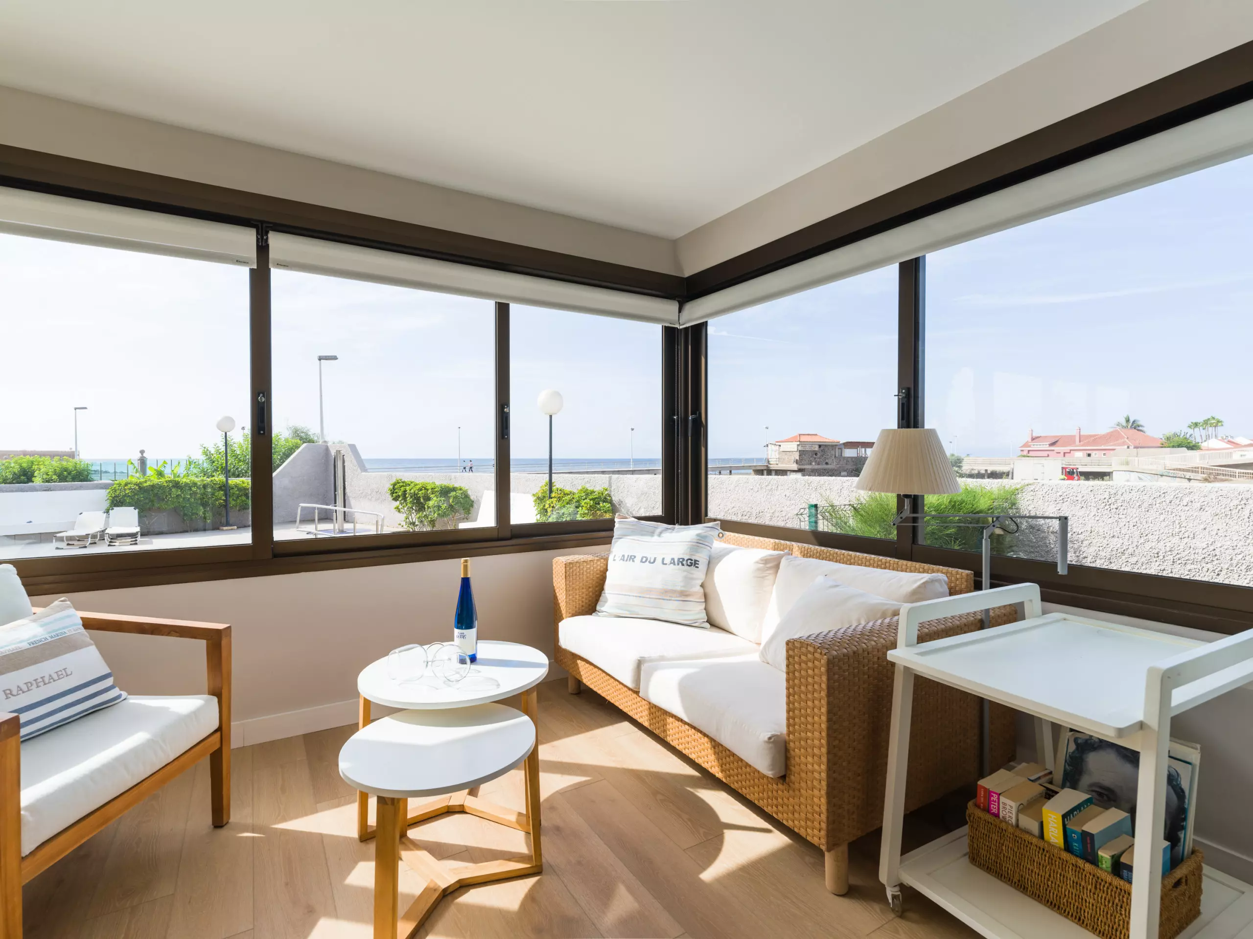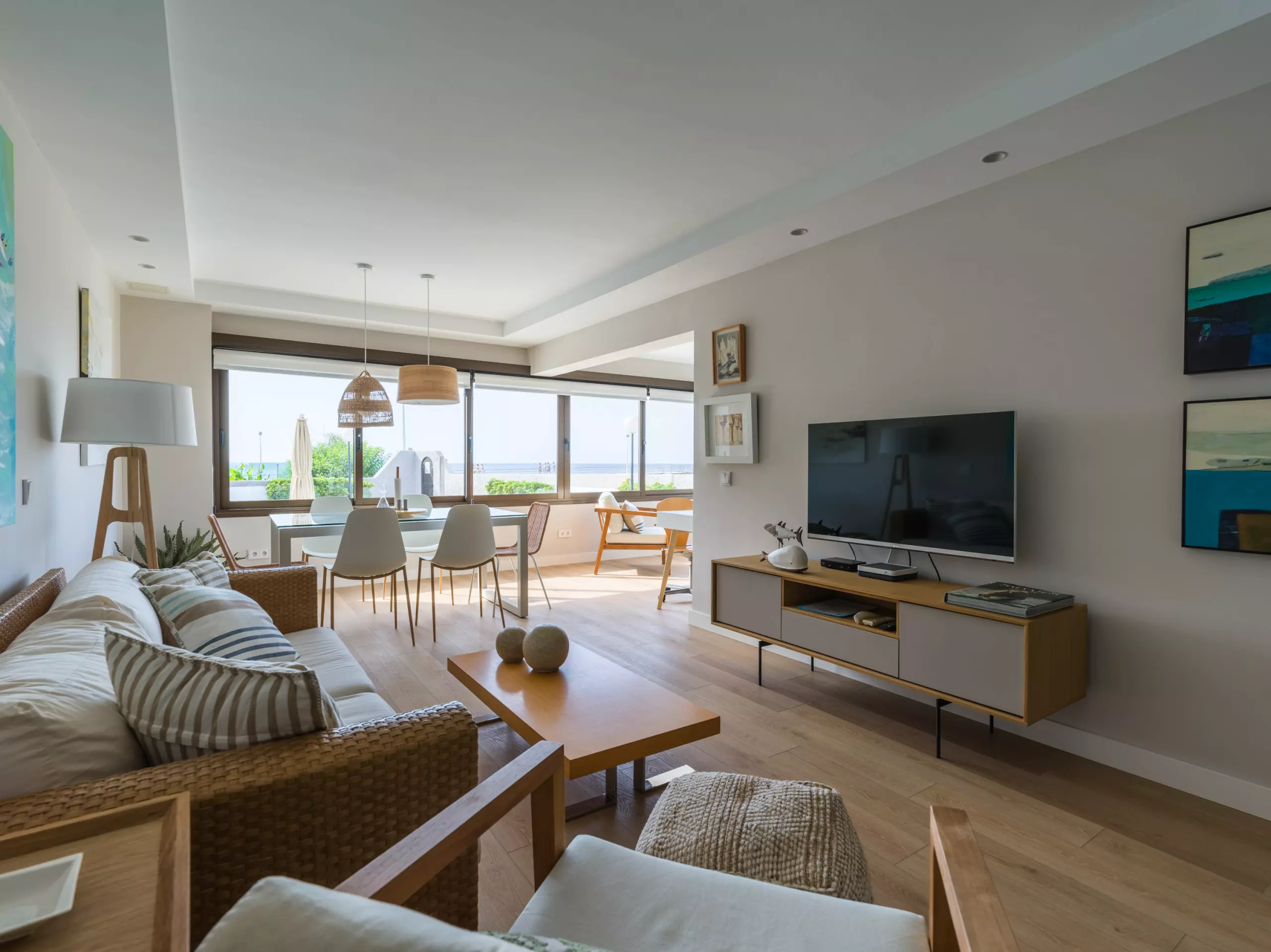 85 m² accommodation, with exquisite decoration, a spacious living room with large windows overlooking a tranquil communal swimming pool and the sea in the background.