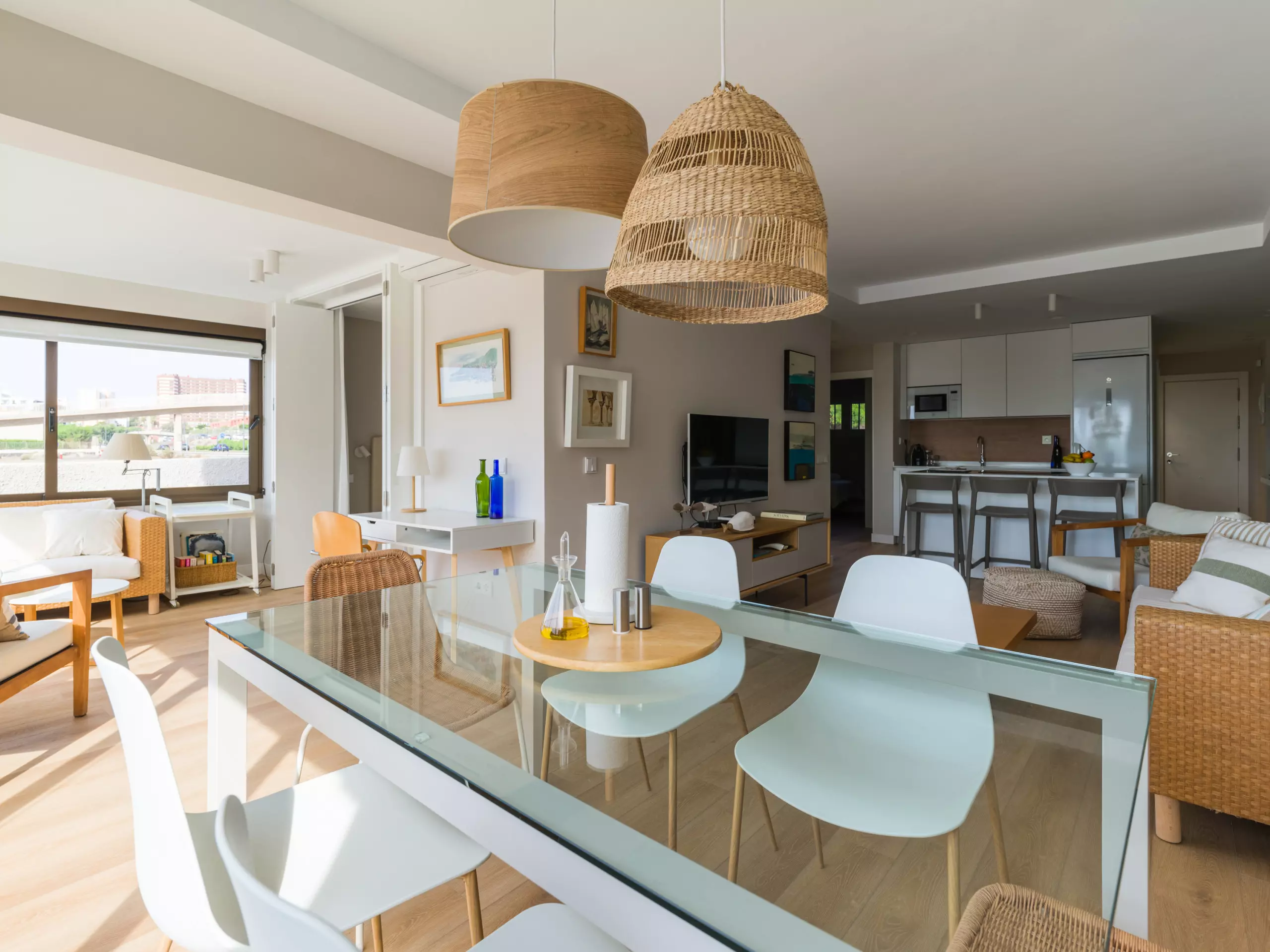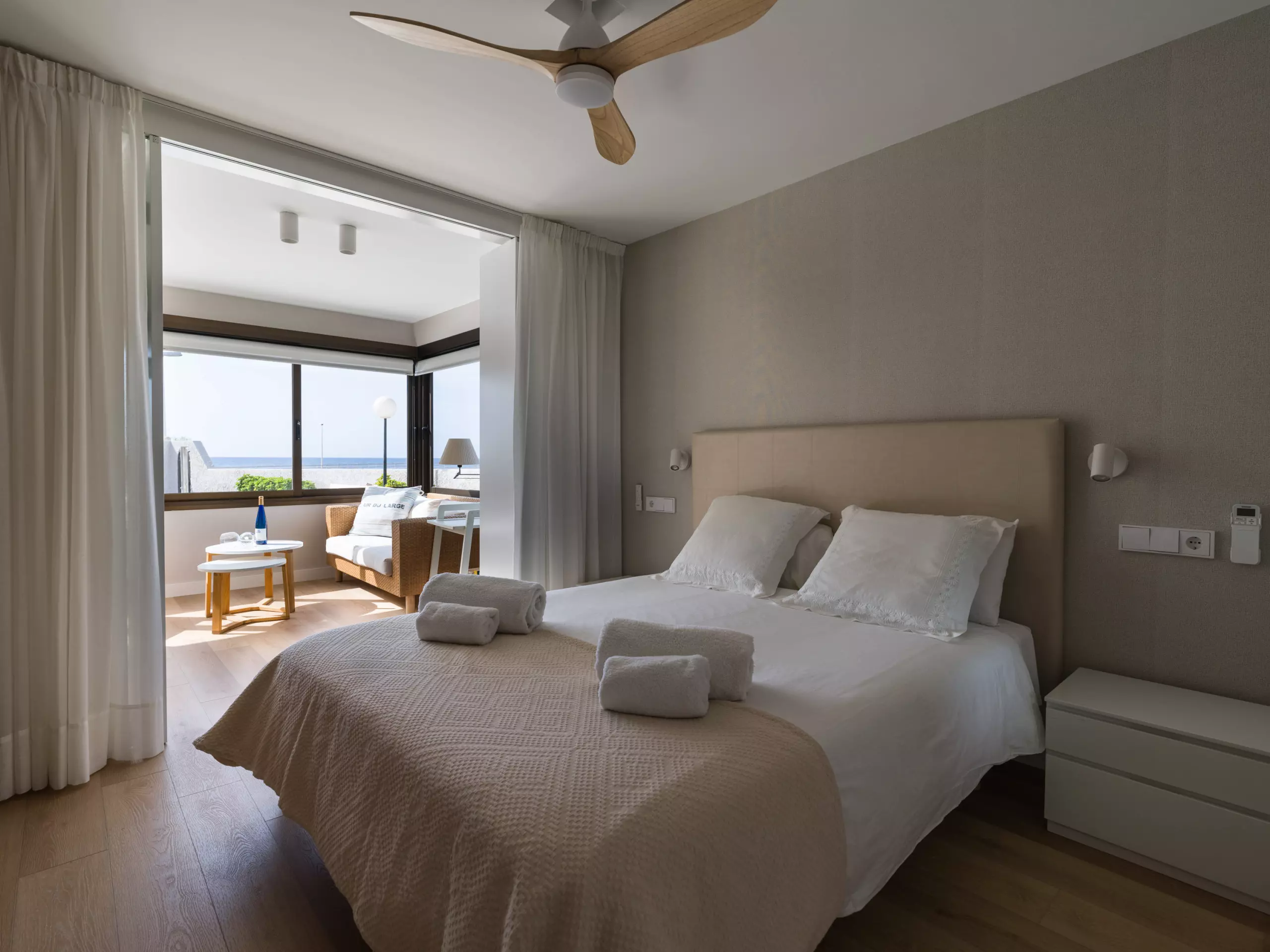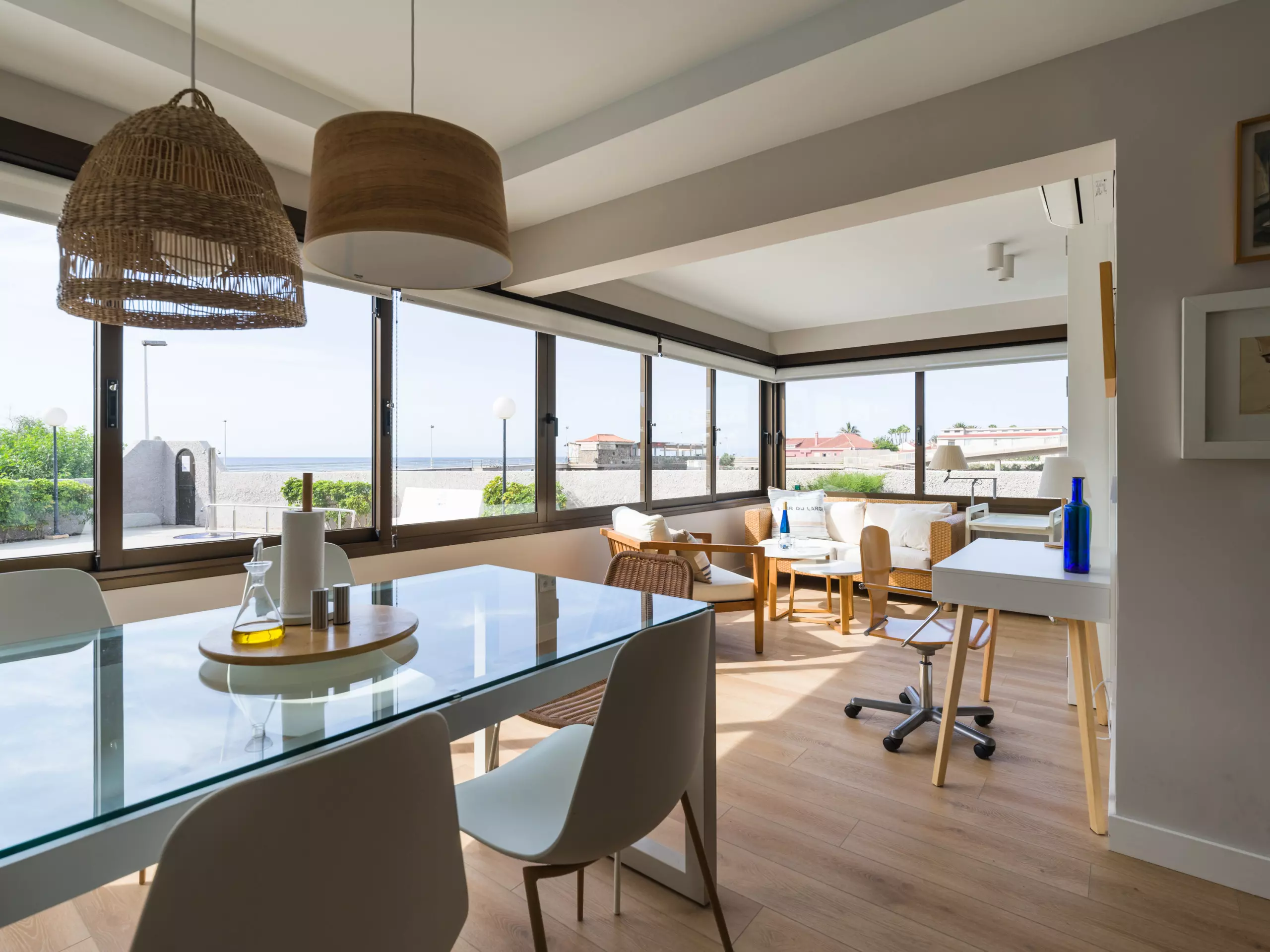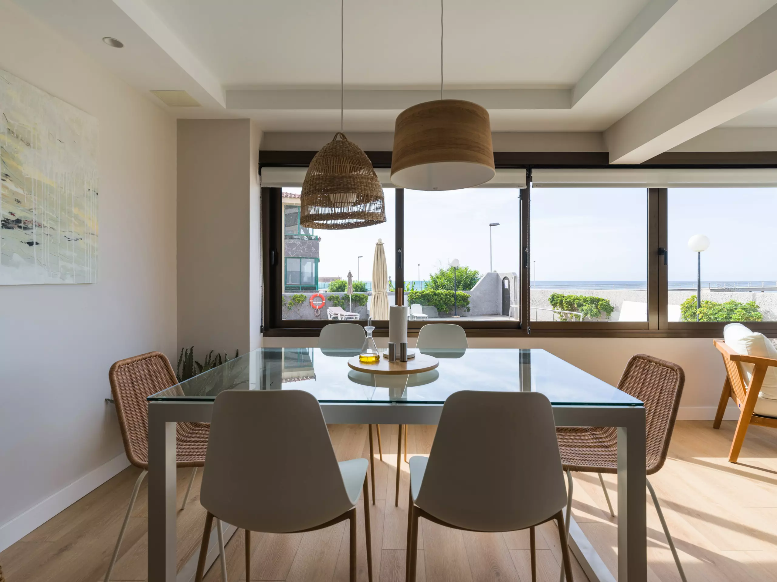 85 m² accommodation, with exquisite decoration, a spacious living room with large windows overlooking a tranquil communal swimming pool and the sea in the background.