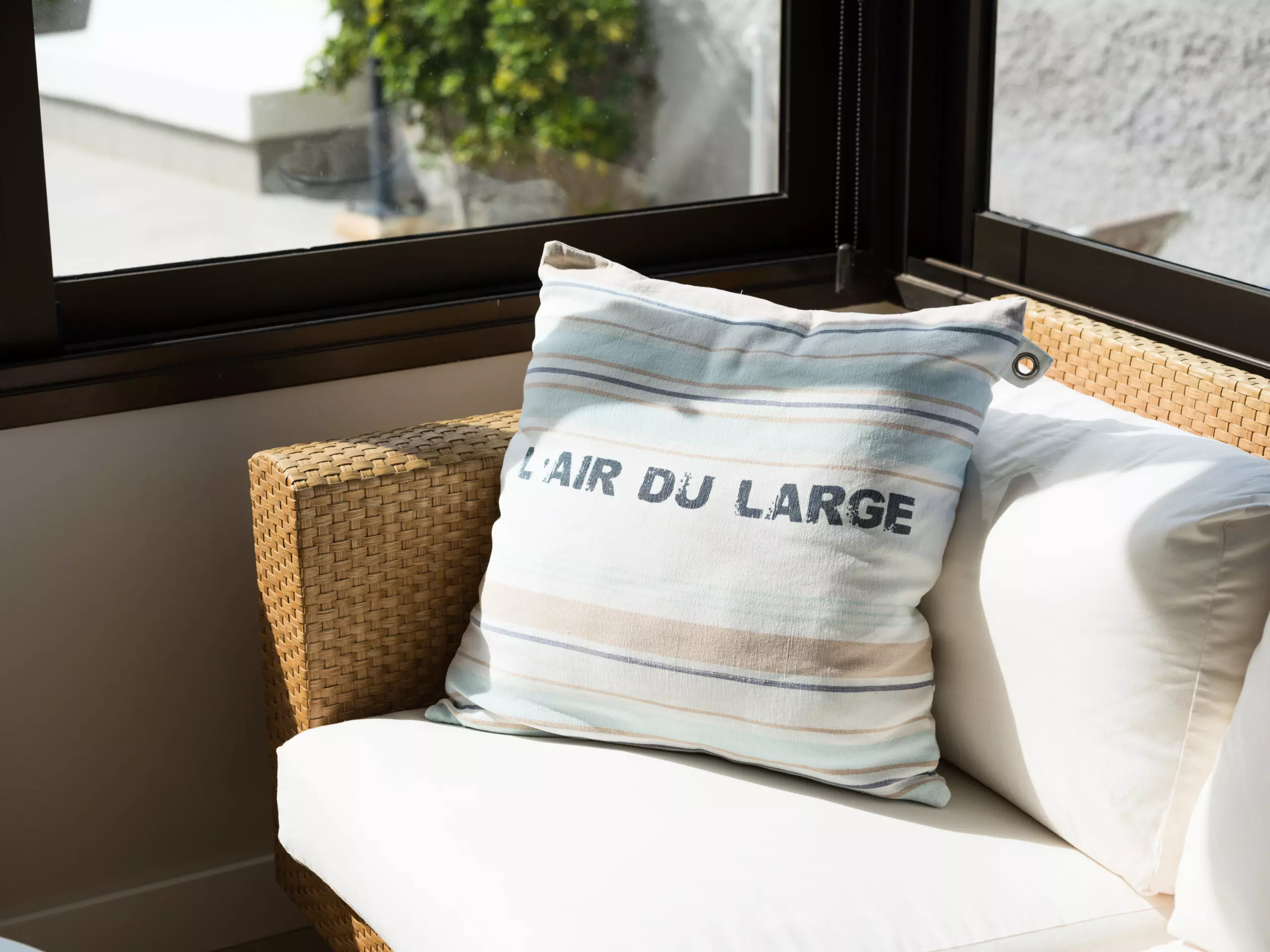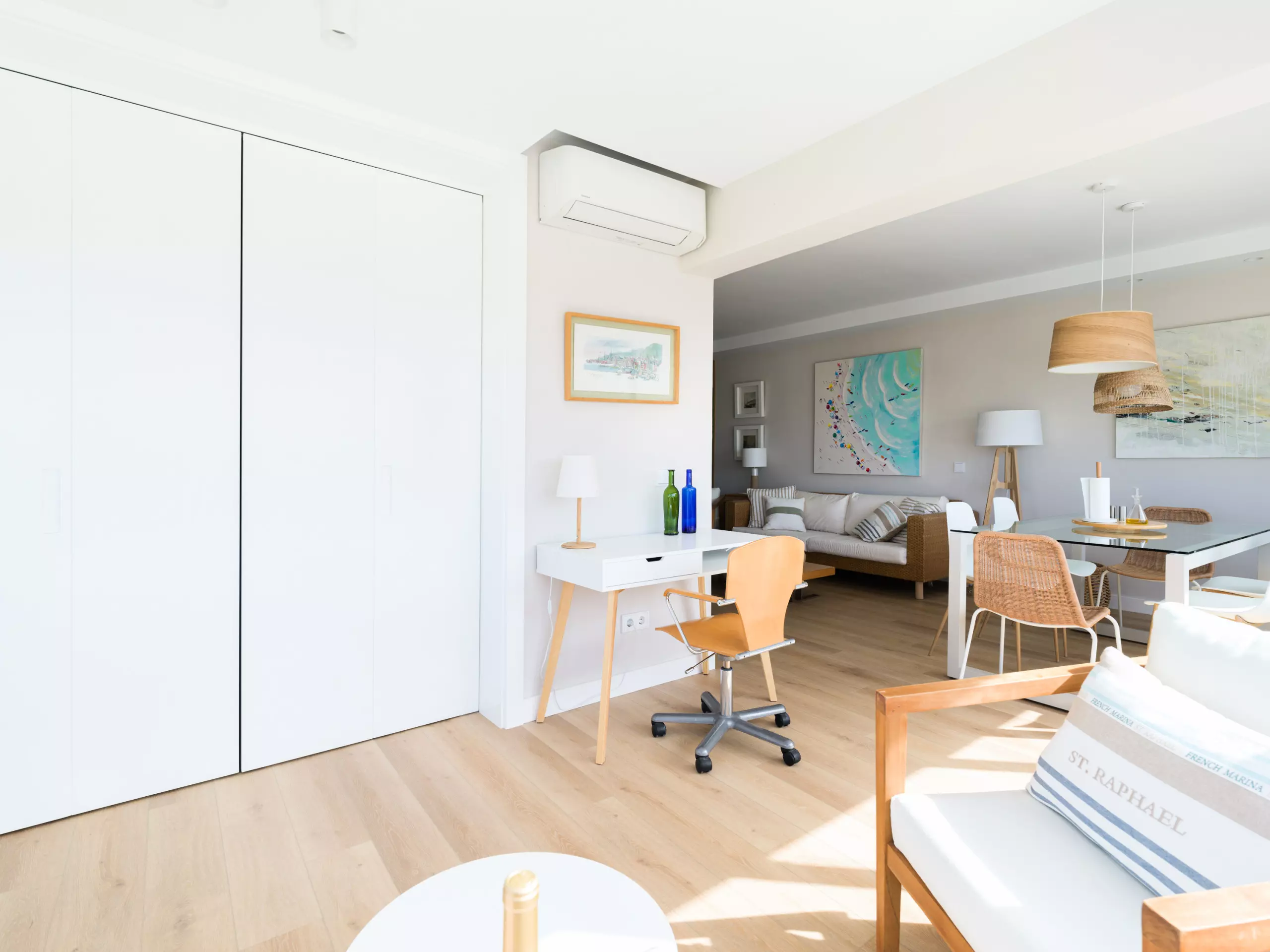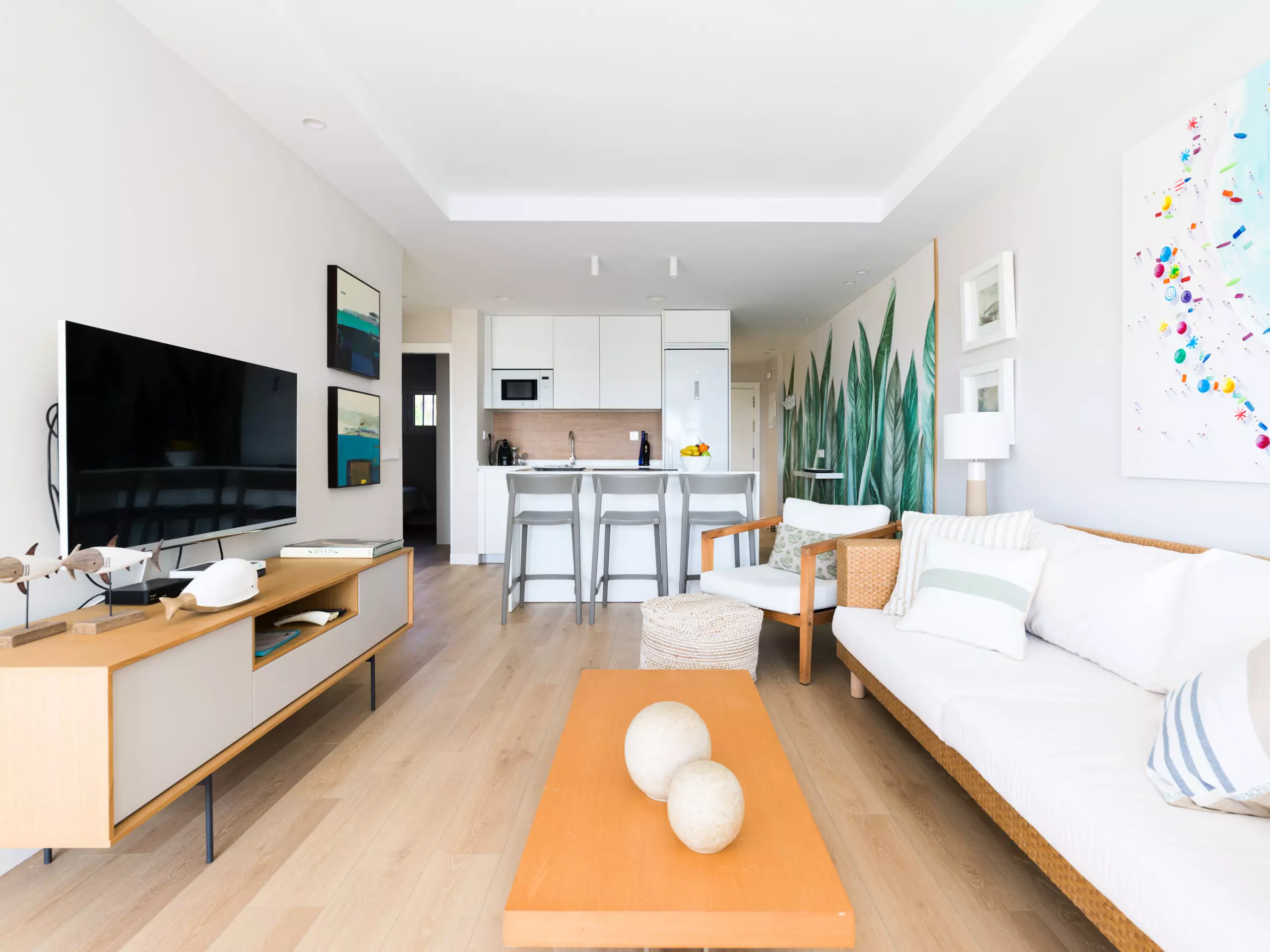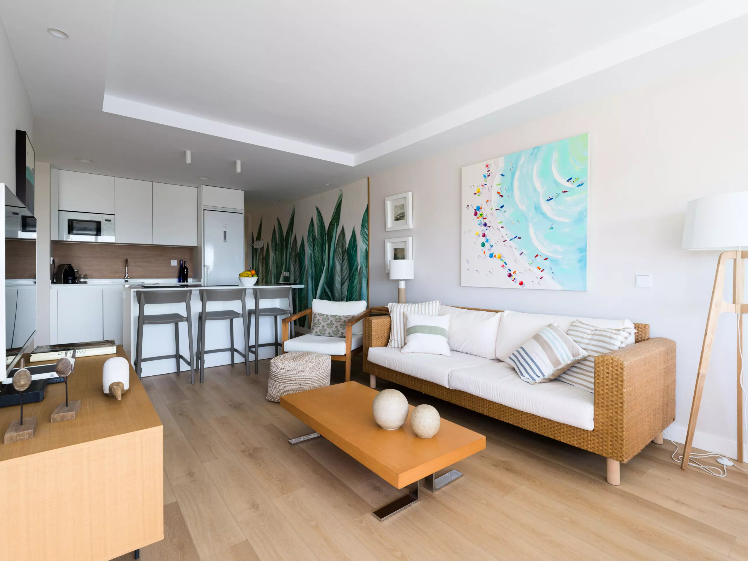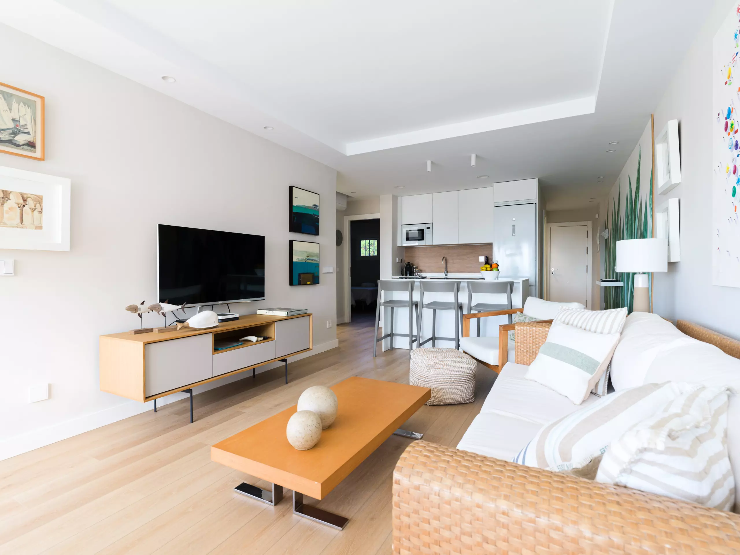 85 m² accommodation, with exquisite decoration, a spacious living room with large windows overlooking a tranquil communal swimming pool and the sea in the background.
