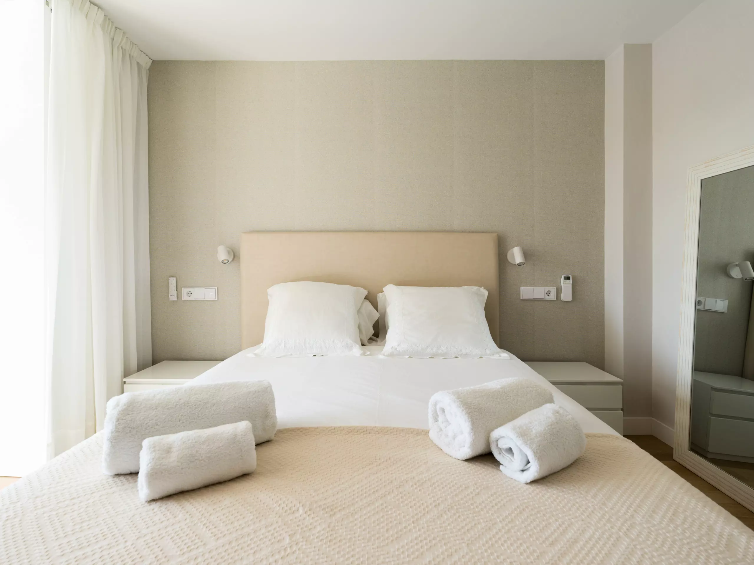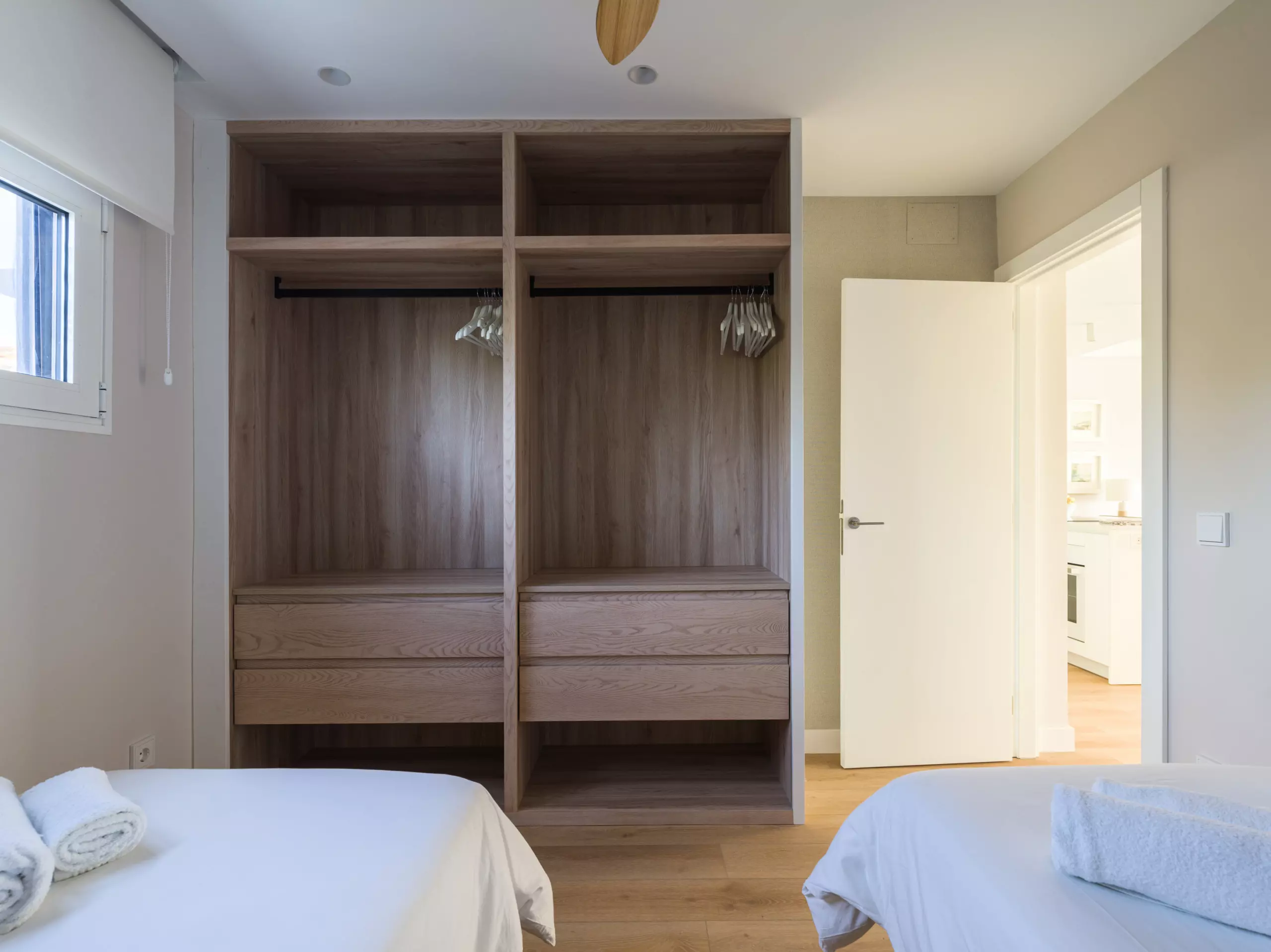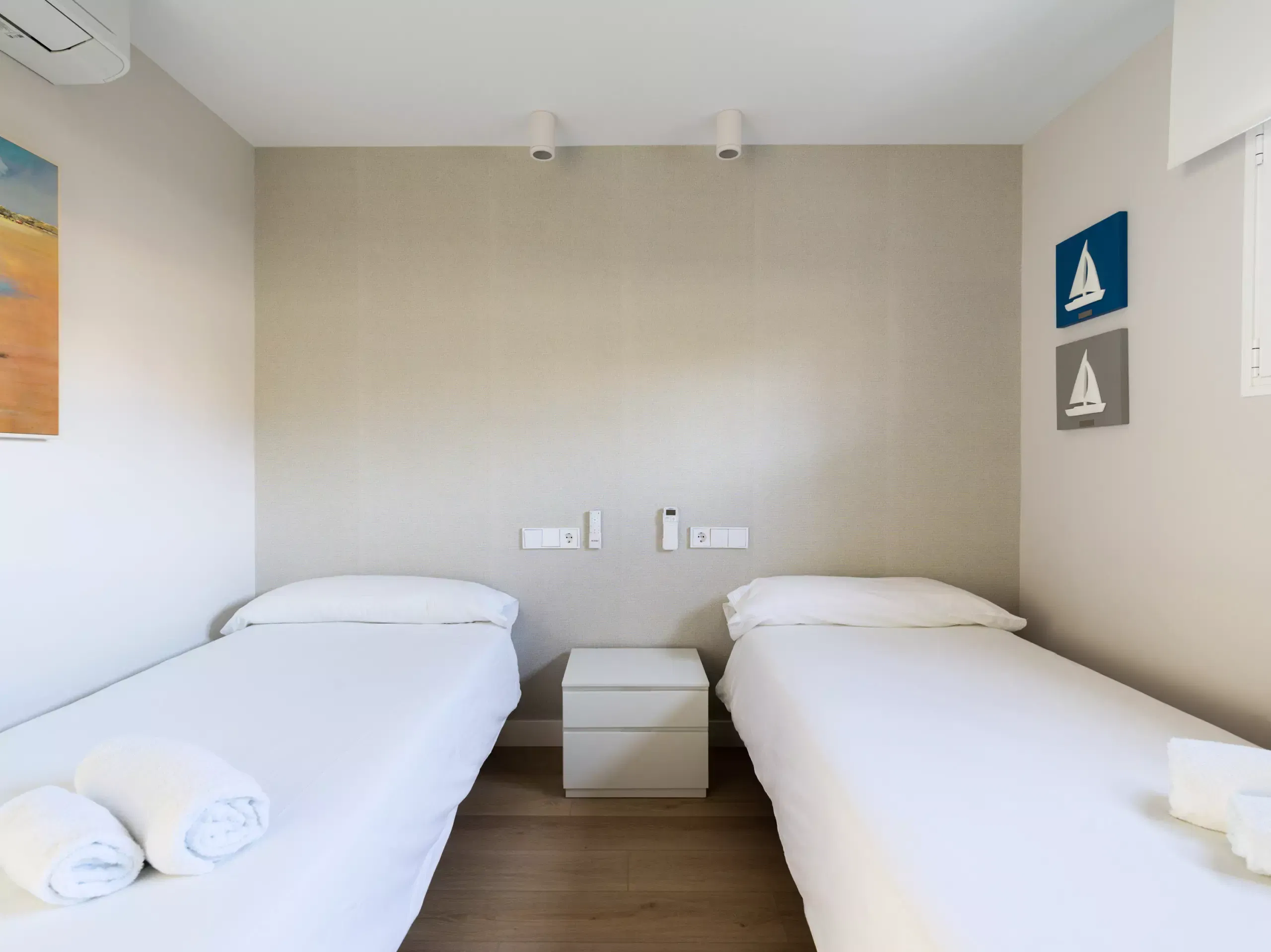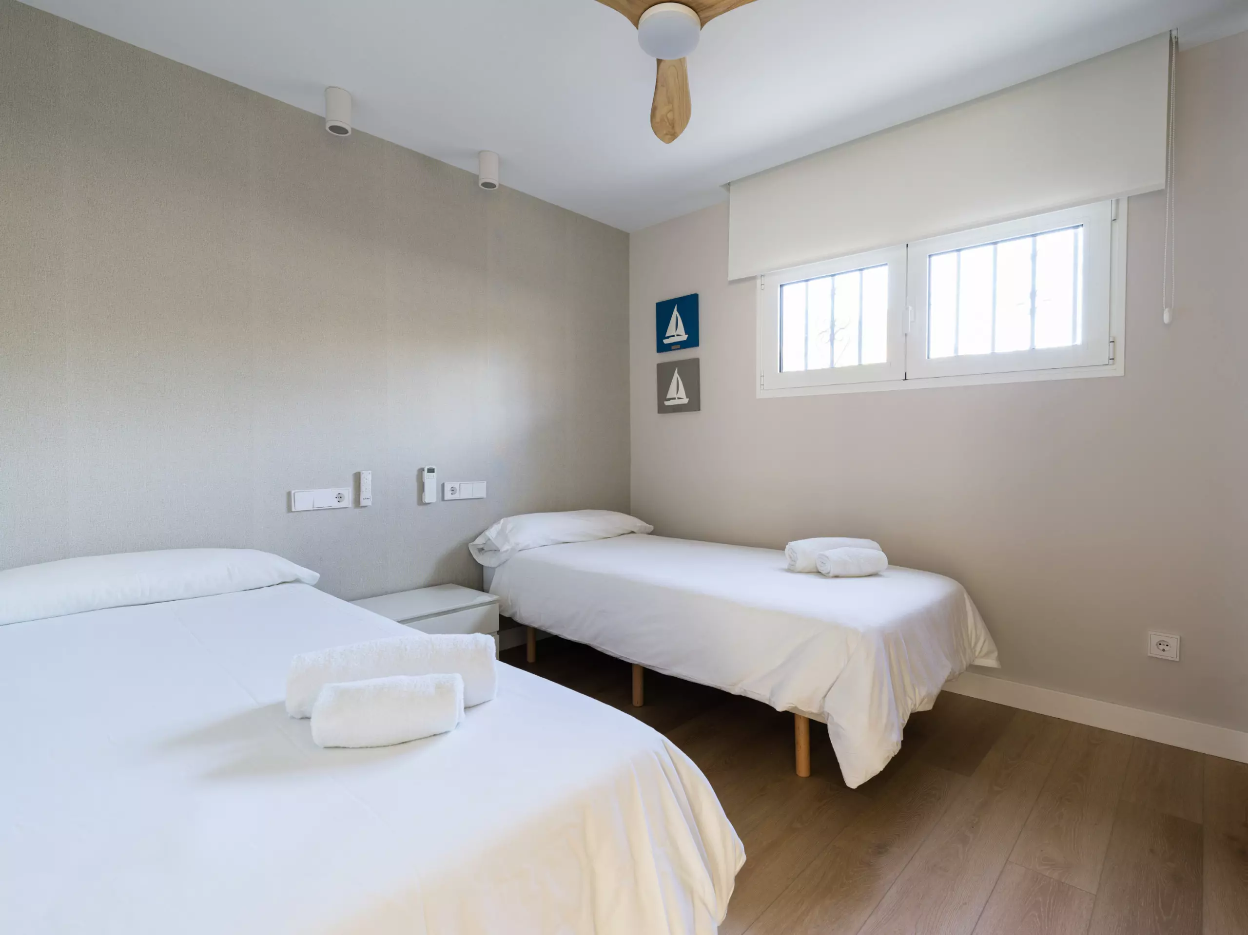 It has two large double bedrooms, one with a 1.5 meter wide double bed and the other with two 0.9 meter wide single beds, two full bathrooms and a very spacious living room. It can accommodate four people.